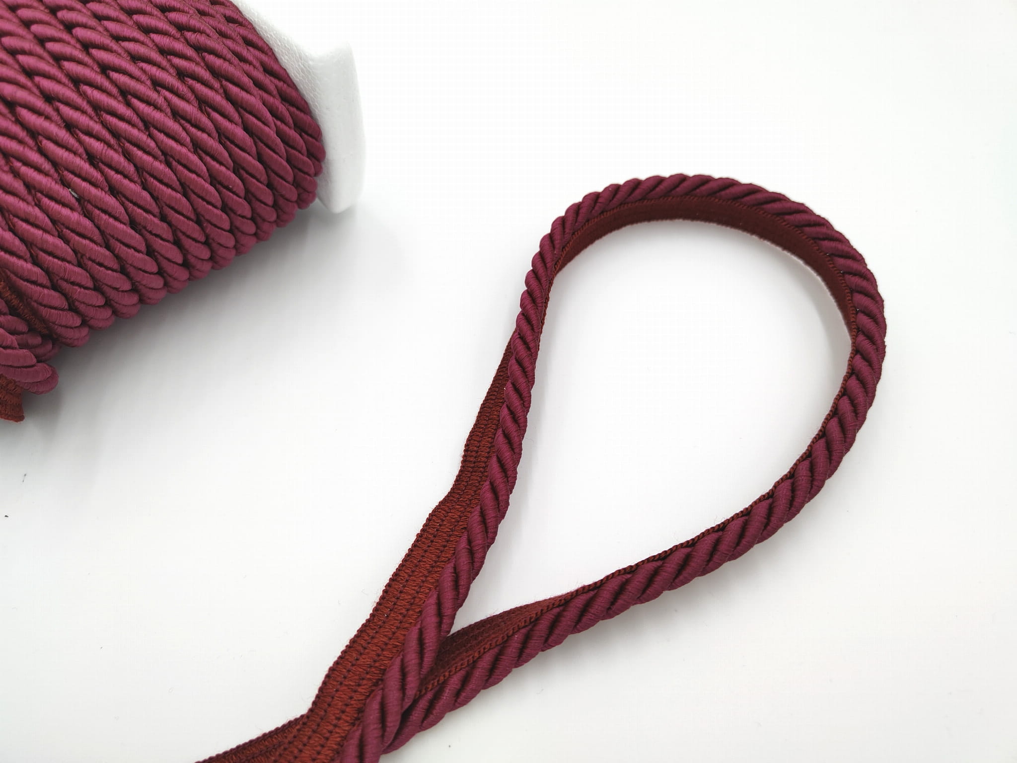 Sznur dekoracyjny w kolorze ciemnym bordowym, z lekkim połyskiem.