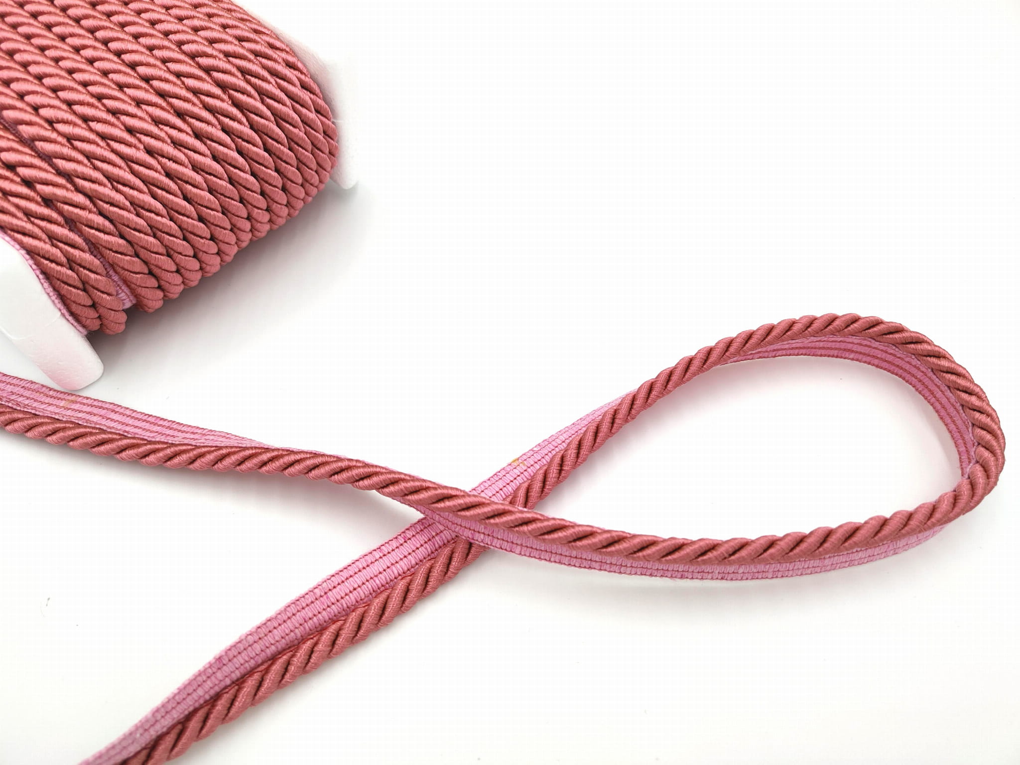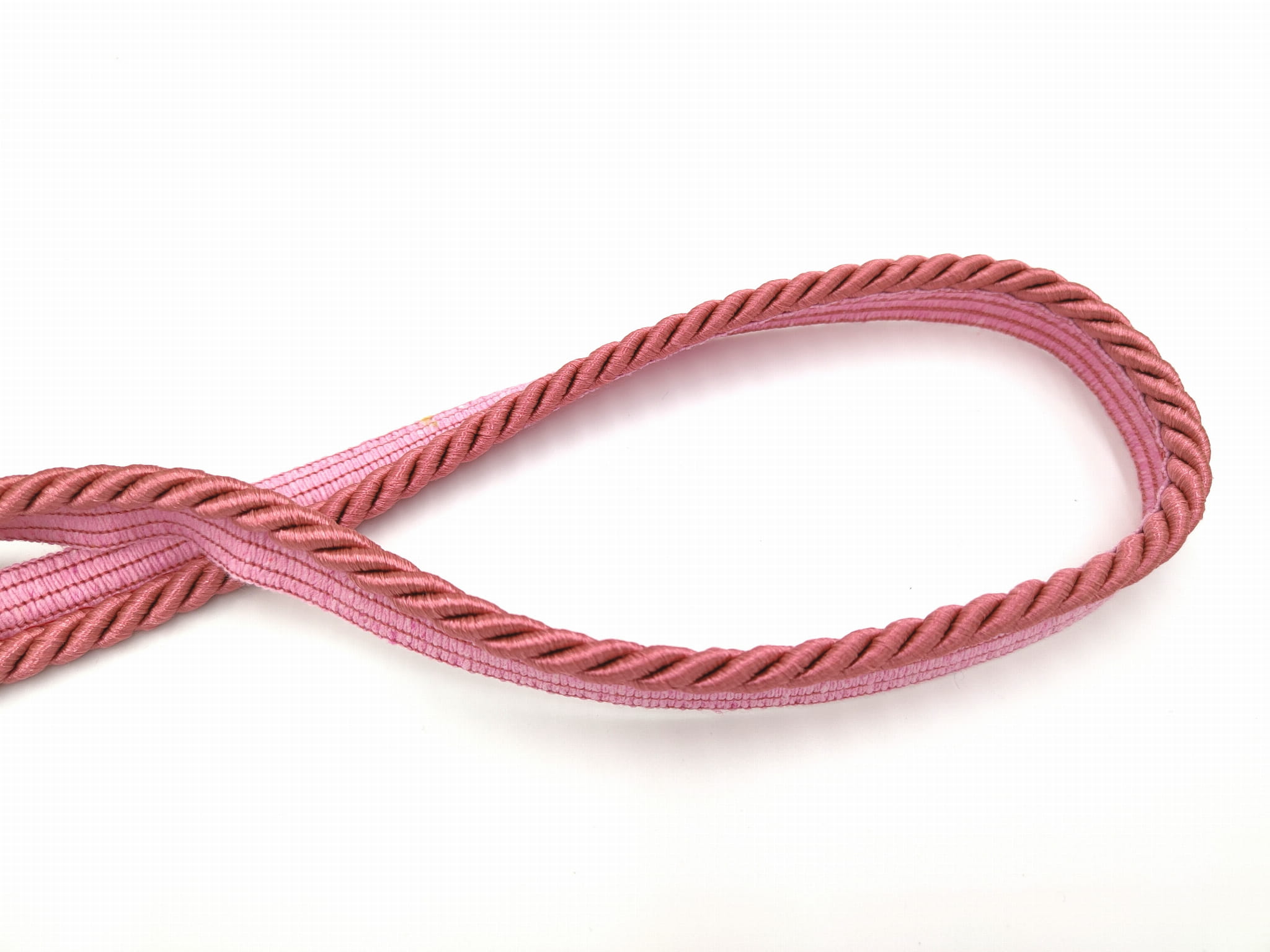 Sznur dekoracyjny w kolorze różowym łososiowym, z lekkim połyskiem.