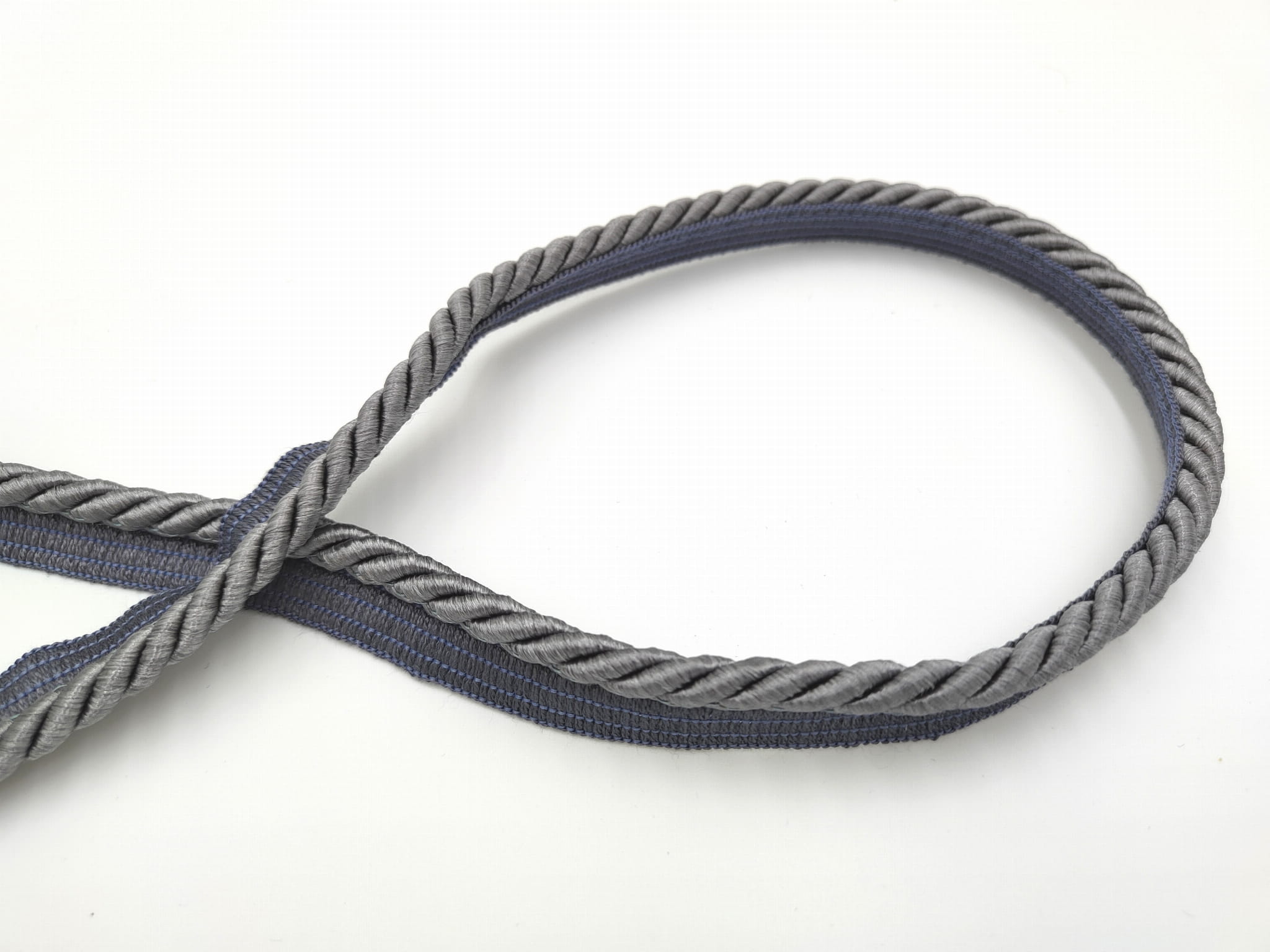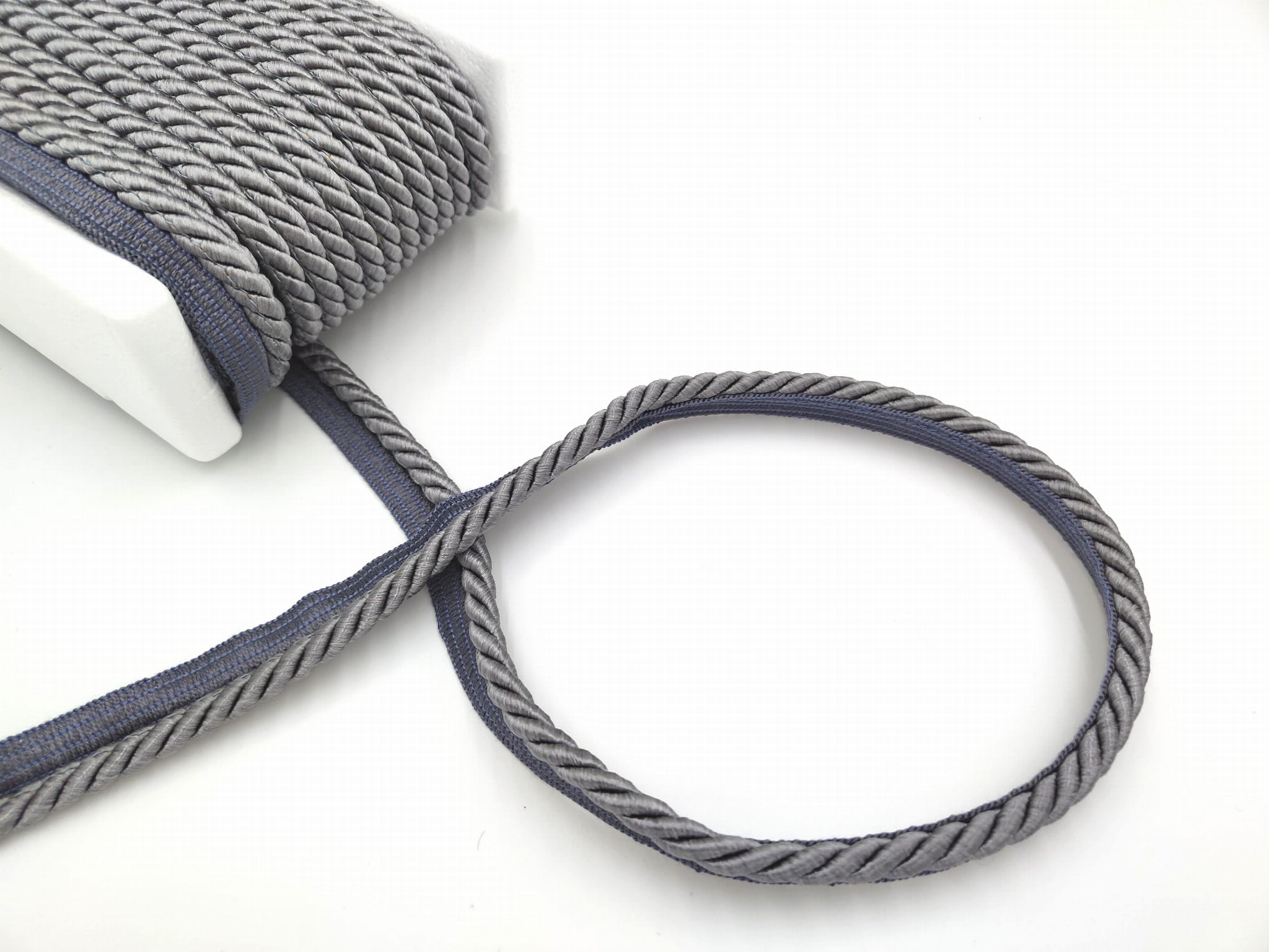 Sznur dekoracyjny w kolorze szarym, z lekkim połyskiem.