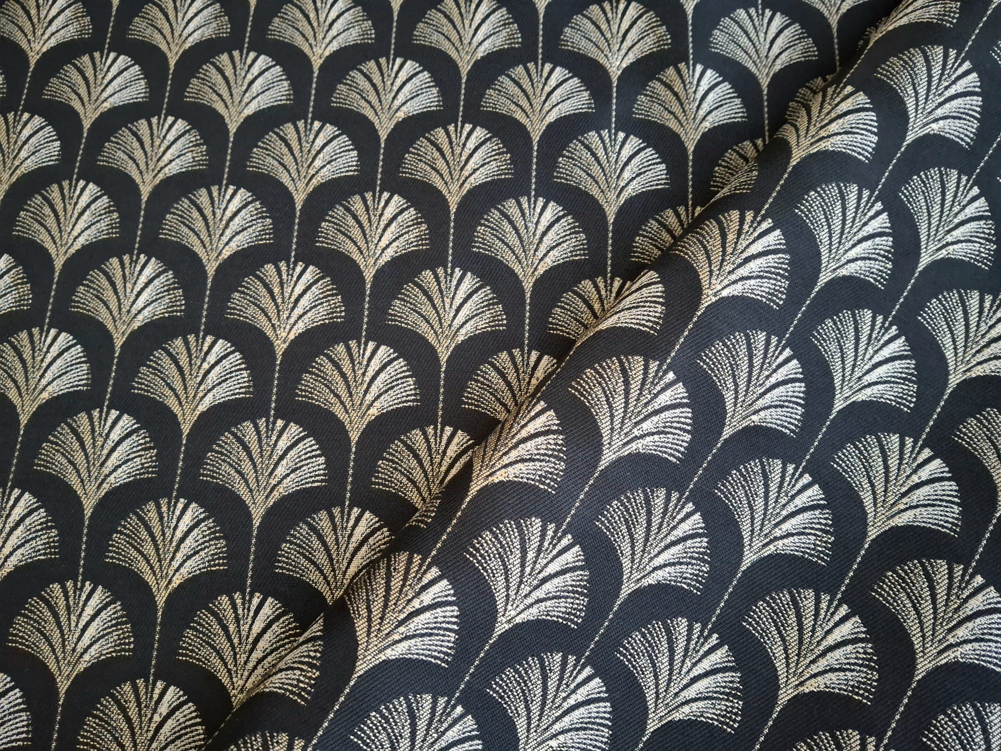 Unikatowa tkanina żakardowa we wzór złotych wachlarzy przypominających pawi ogon umieszczonych na czarnym tle.