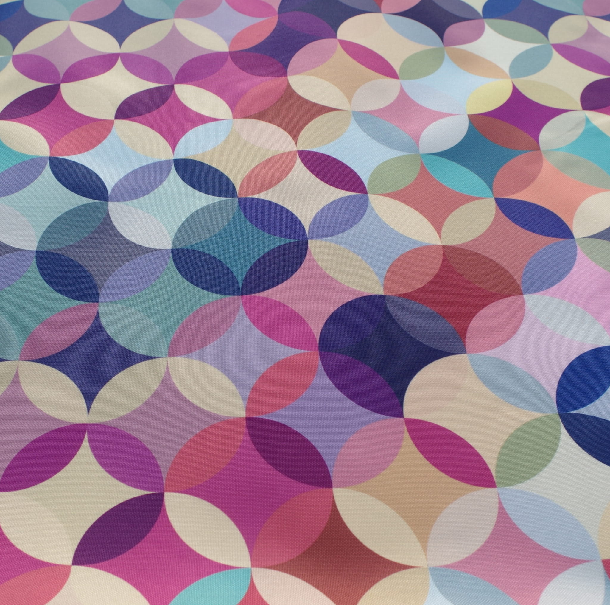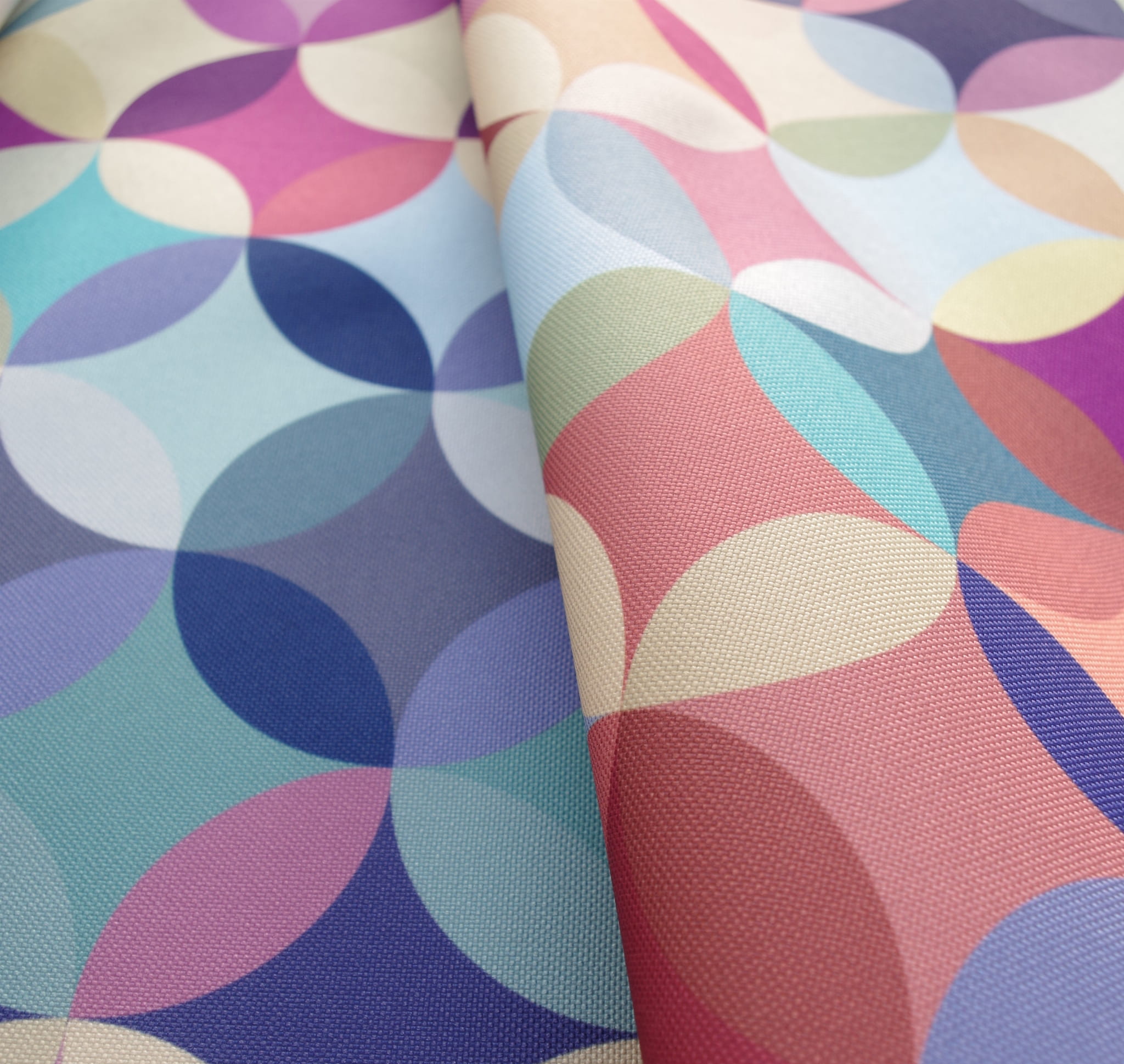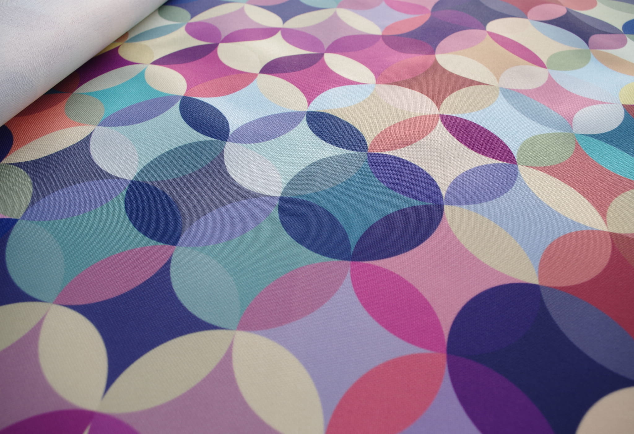 Tkanina tapicerska poliester drukowany z nowoczesnym wzorem kolorowych kół w klimacie retro.