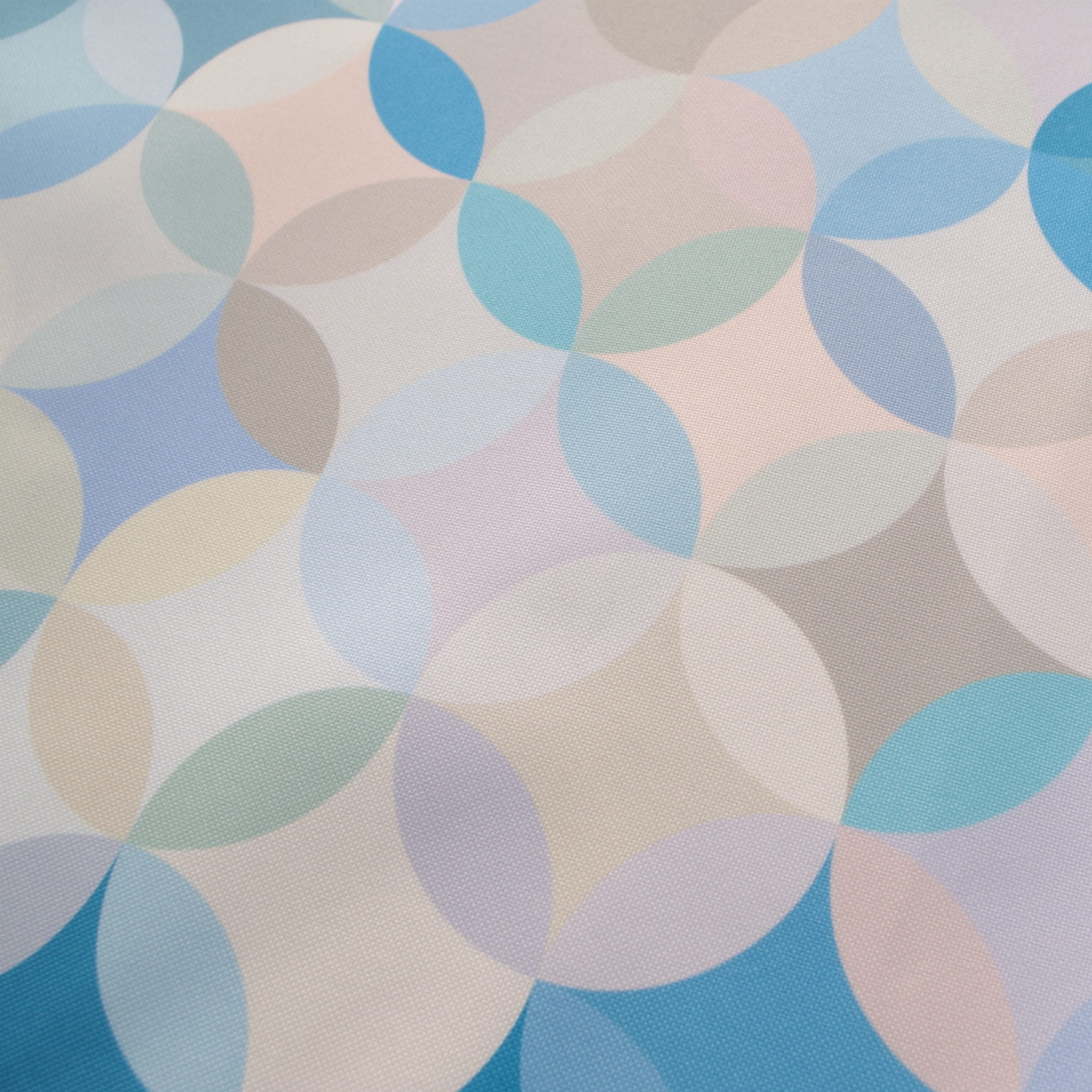 Tkanina tapicerska poliester drukowany z nowoczesnym wzorem kolorowych kół w klimacie retro w odcieniu turkusowym.