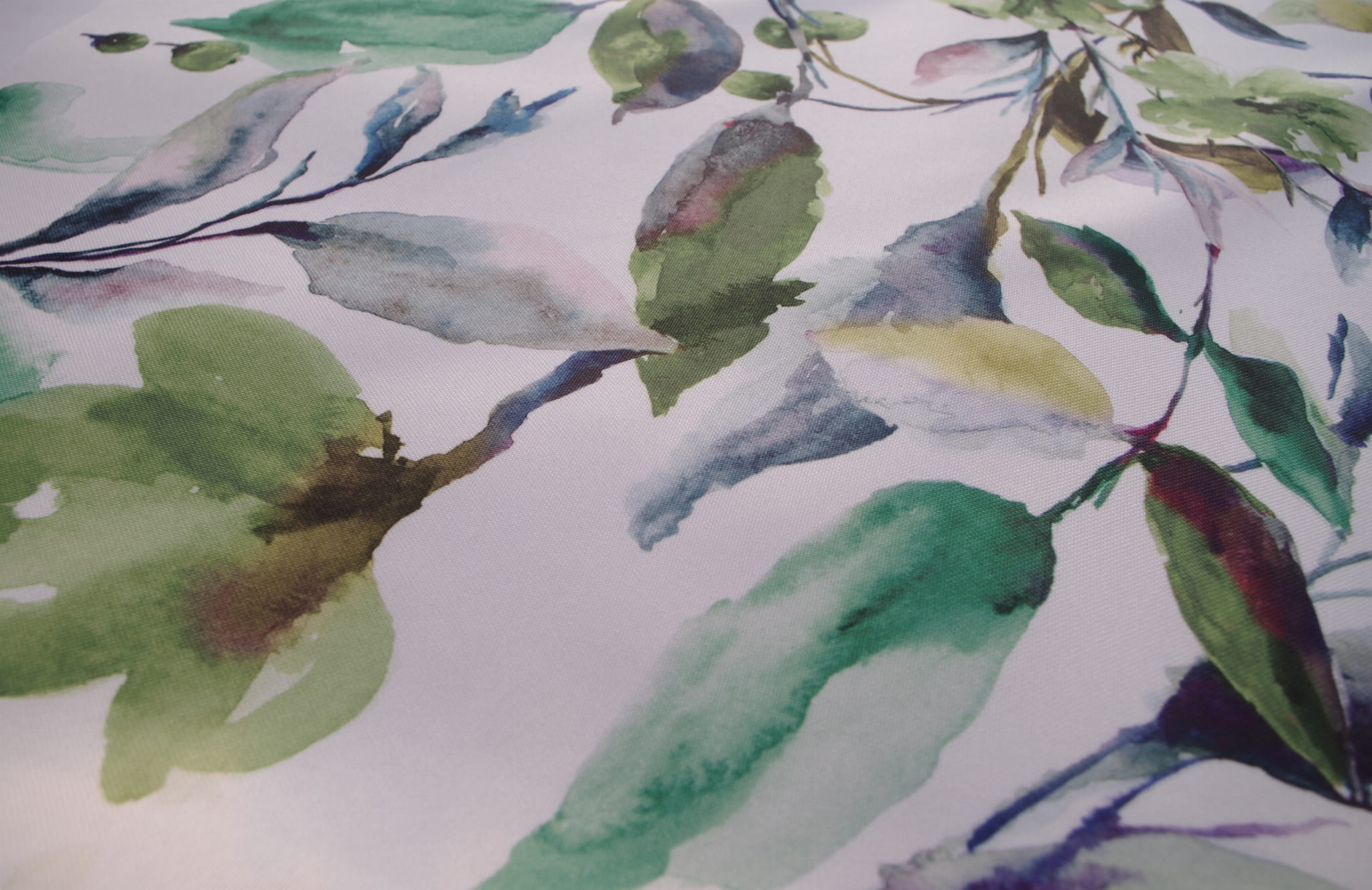 Tkanina tapicerska poliester drukowany z nietuzinkowym wzorem akwarelowych kwiatów w kolorze zielonym.