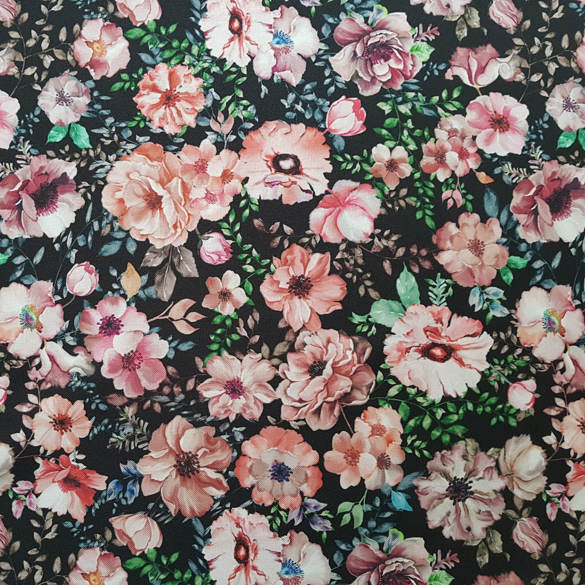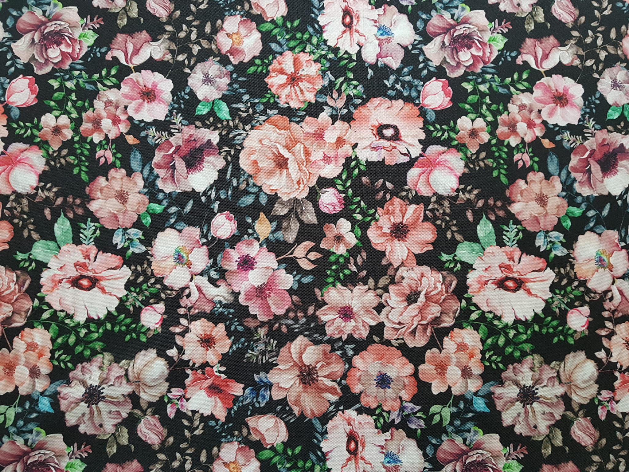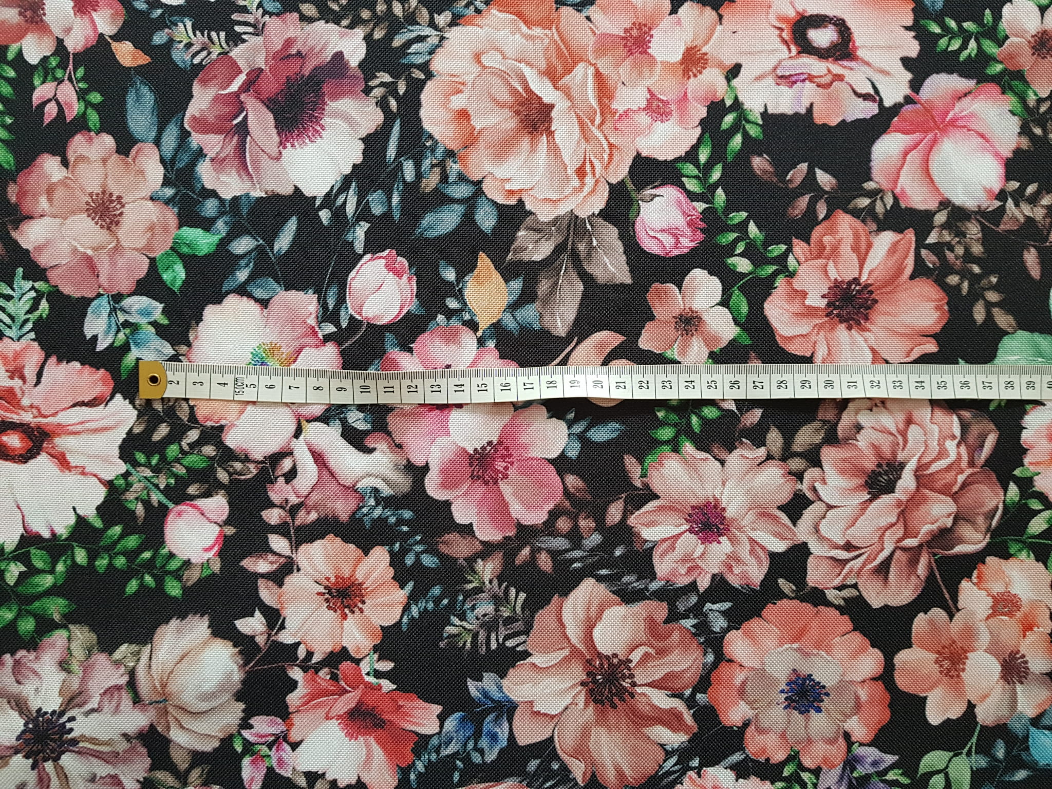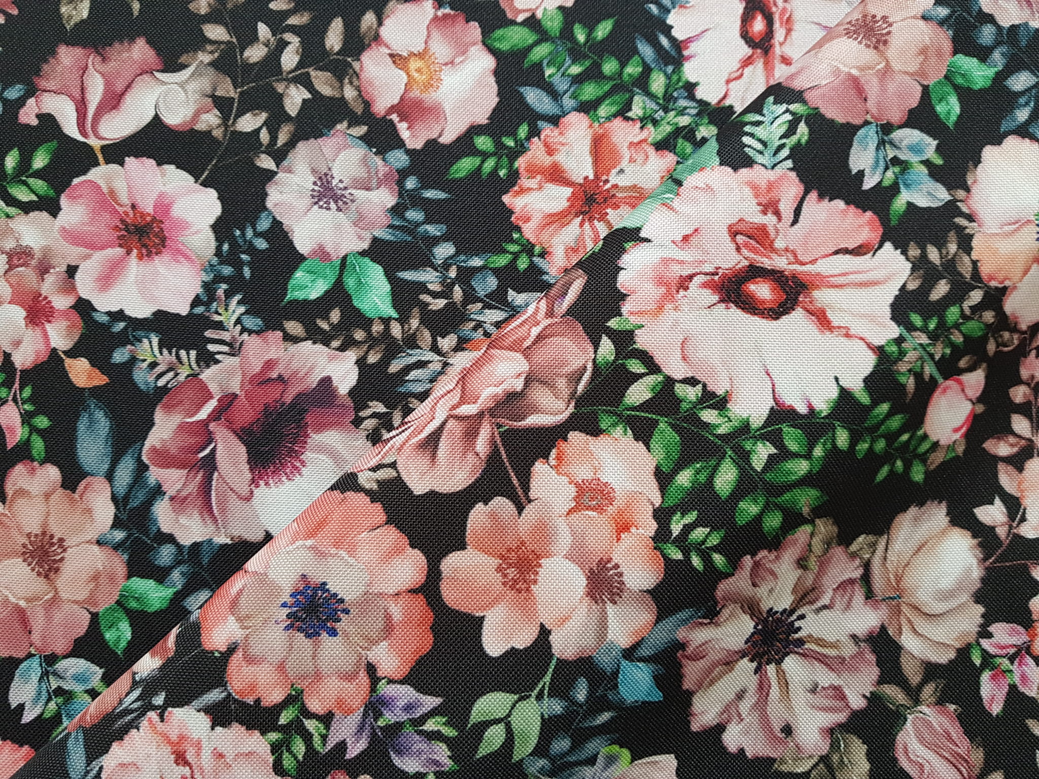 Tkanina tapicerska poliester drukowany z ponadczasowym wzorem kolorowych kwiatów.