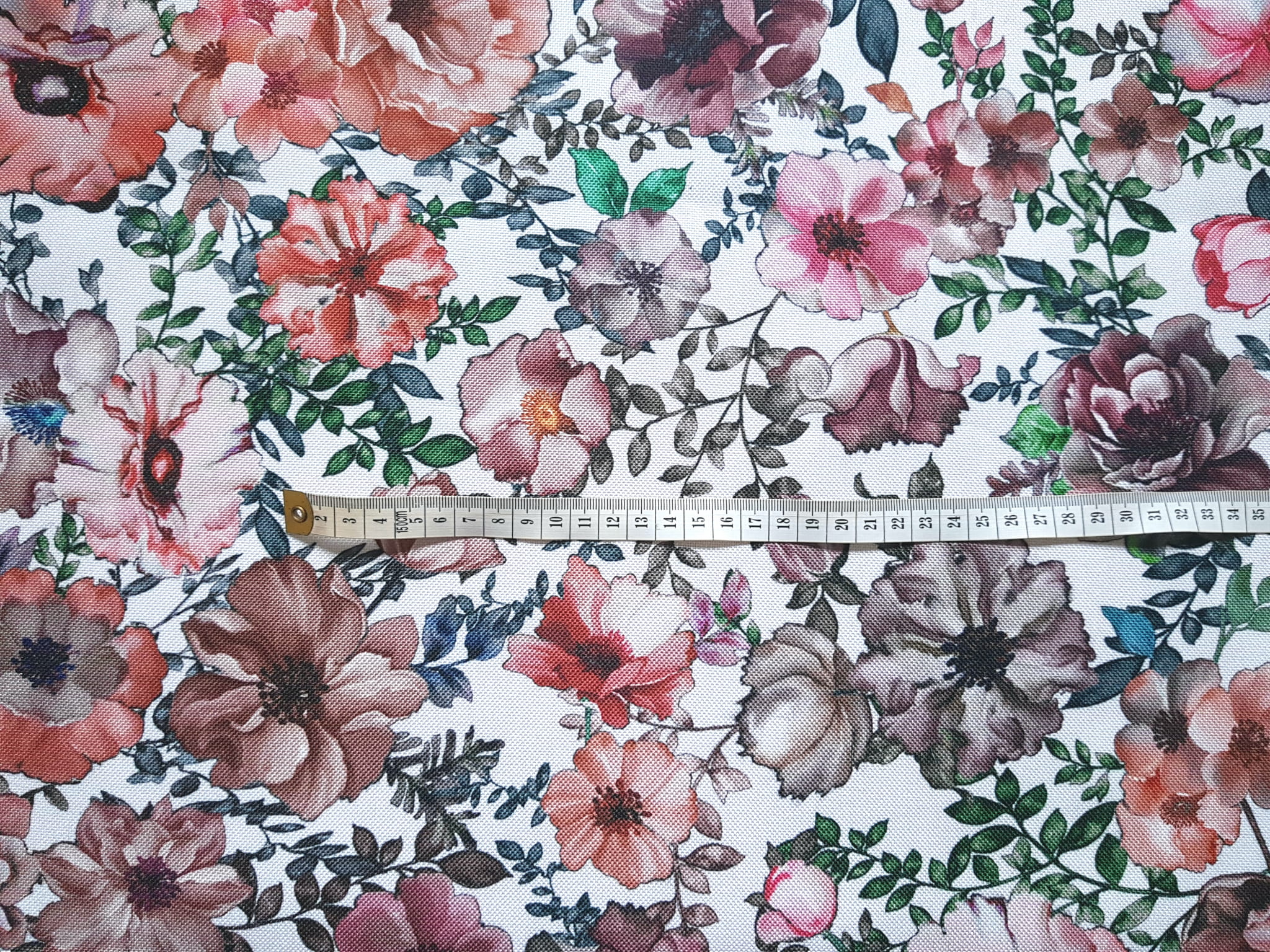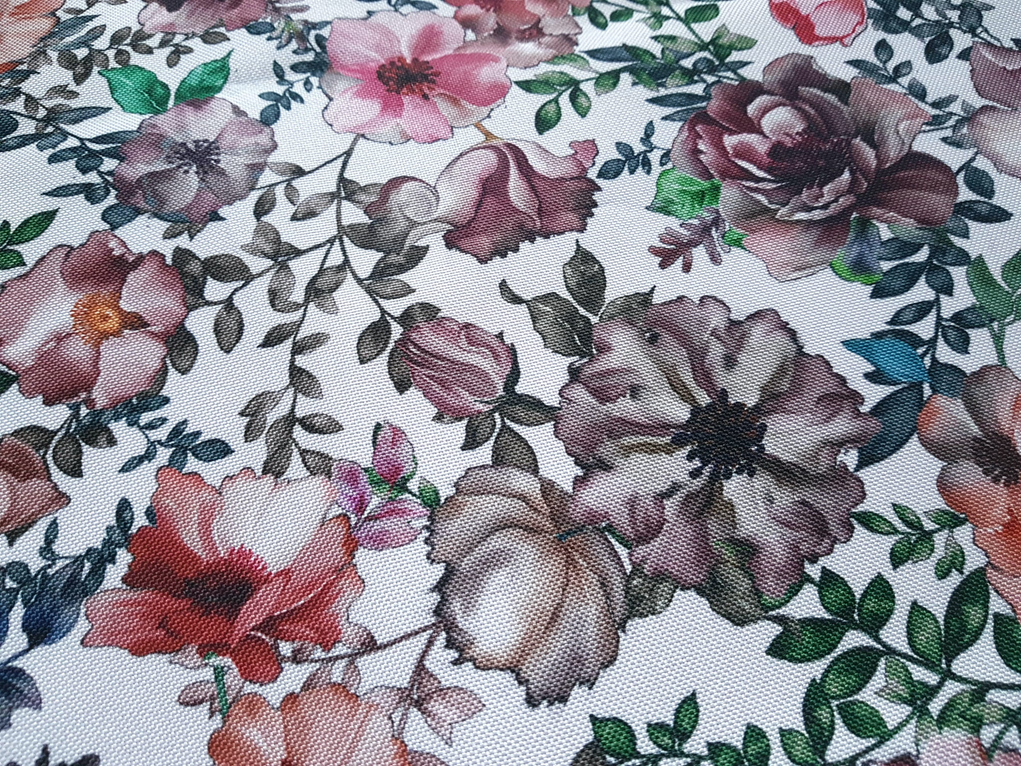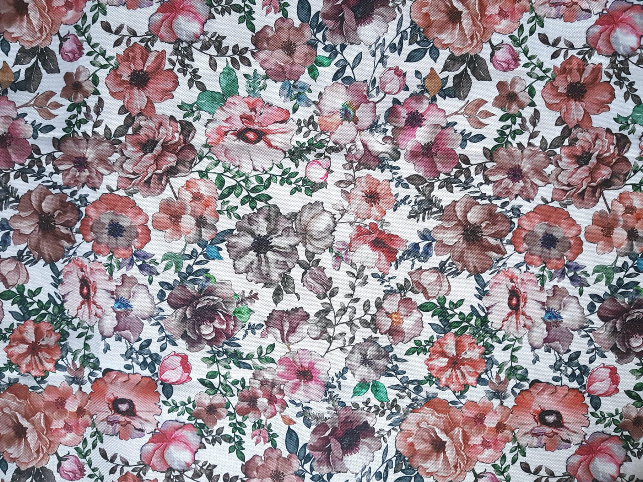 Tkanina tapicerska poliester drukowany z ponadczasowym wzorem kolorowych kwiatów.
