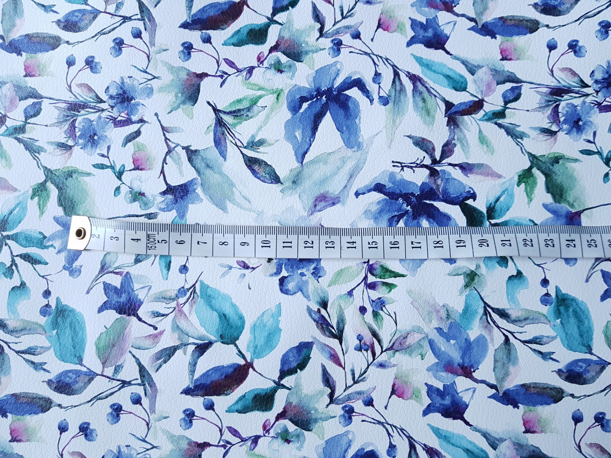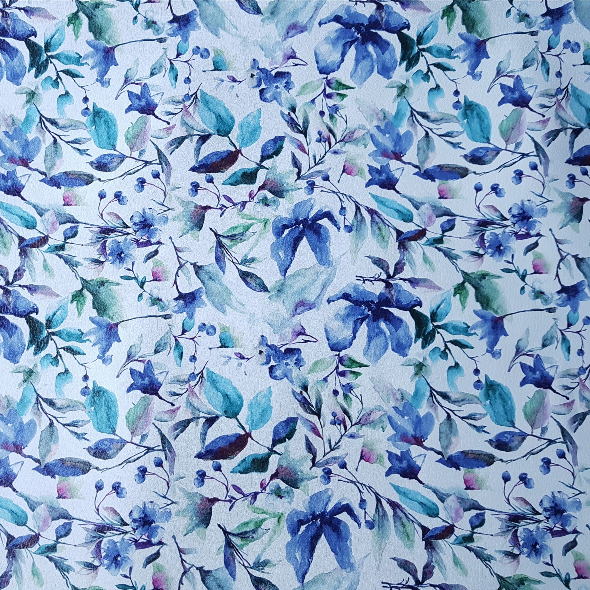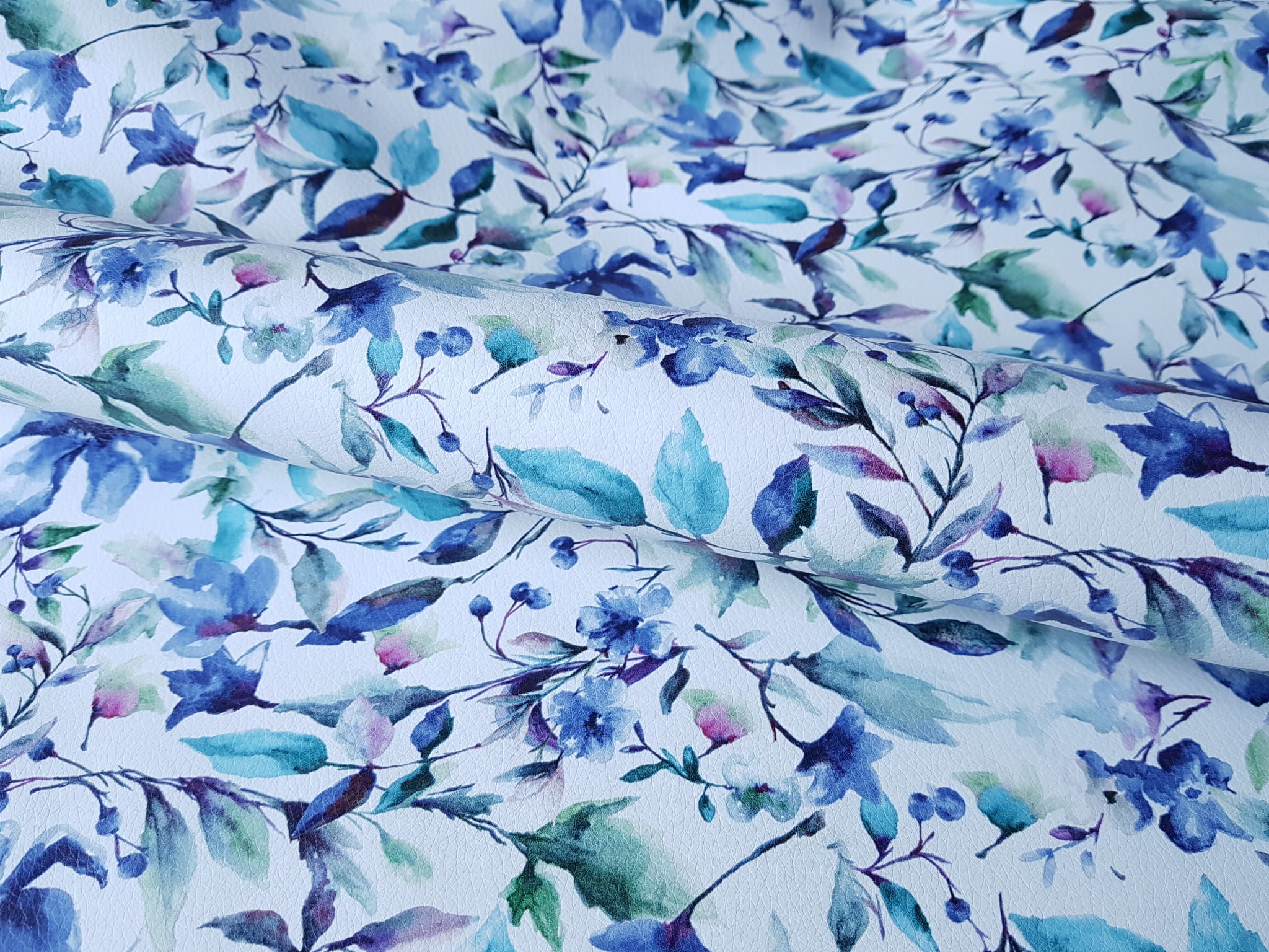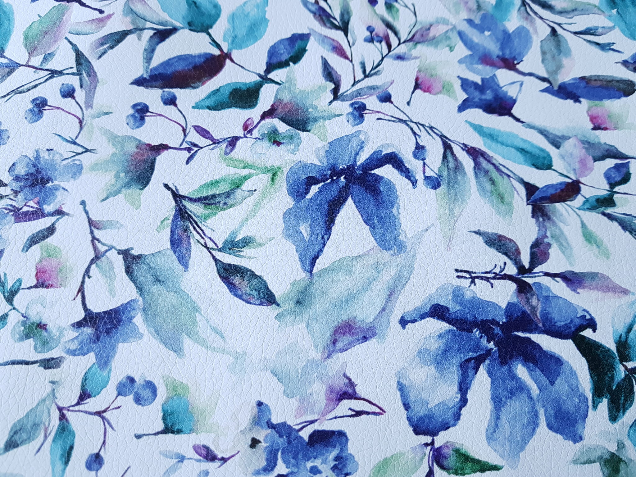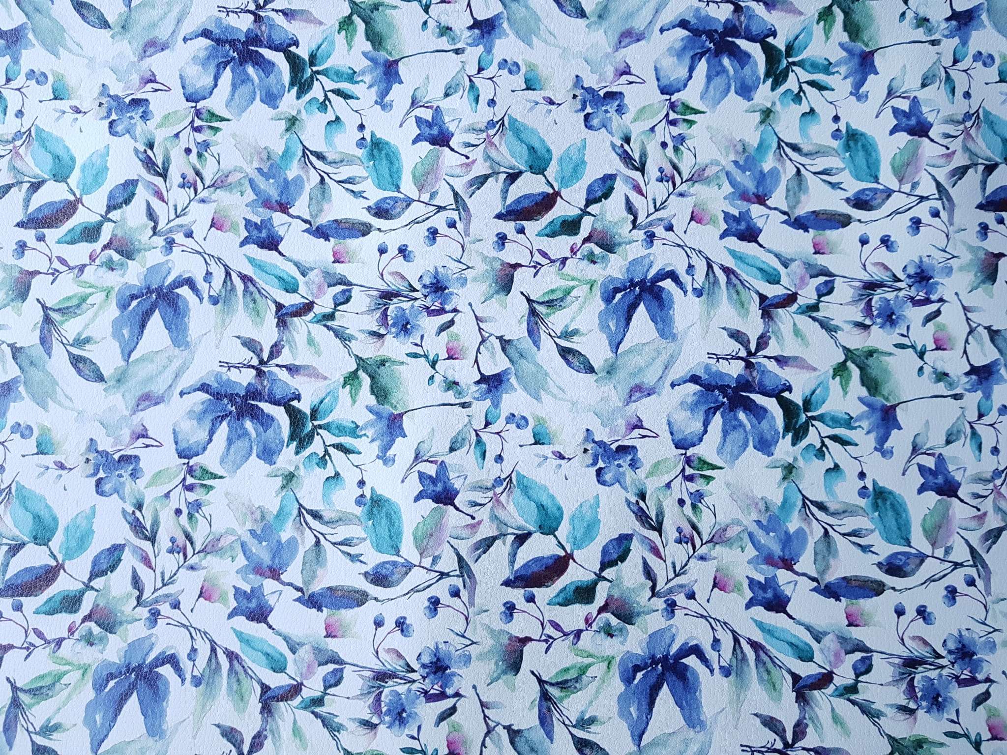 Ekoskóra drukowana ze wzorem akwarelowych kwiatów w kolorze niebieskim.