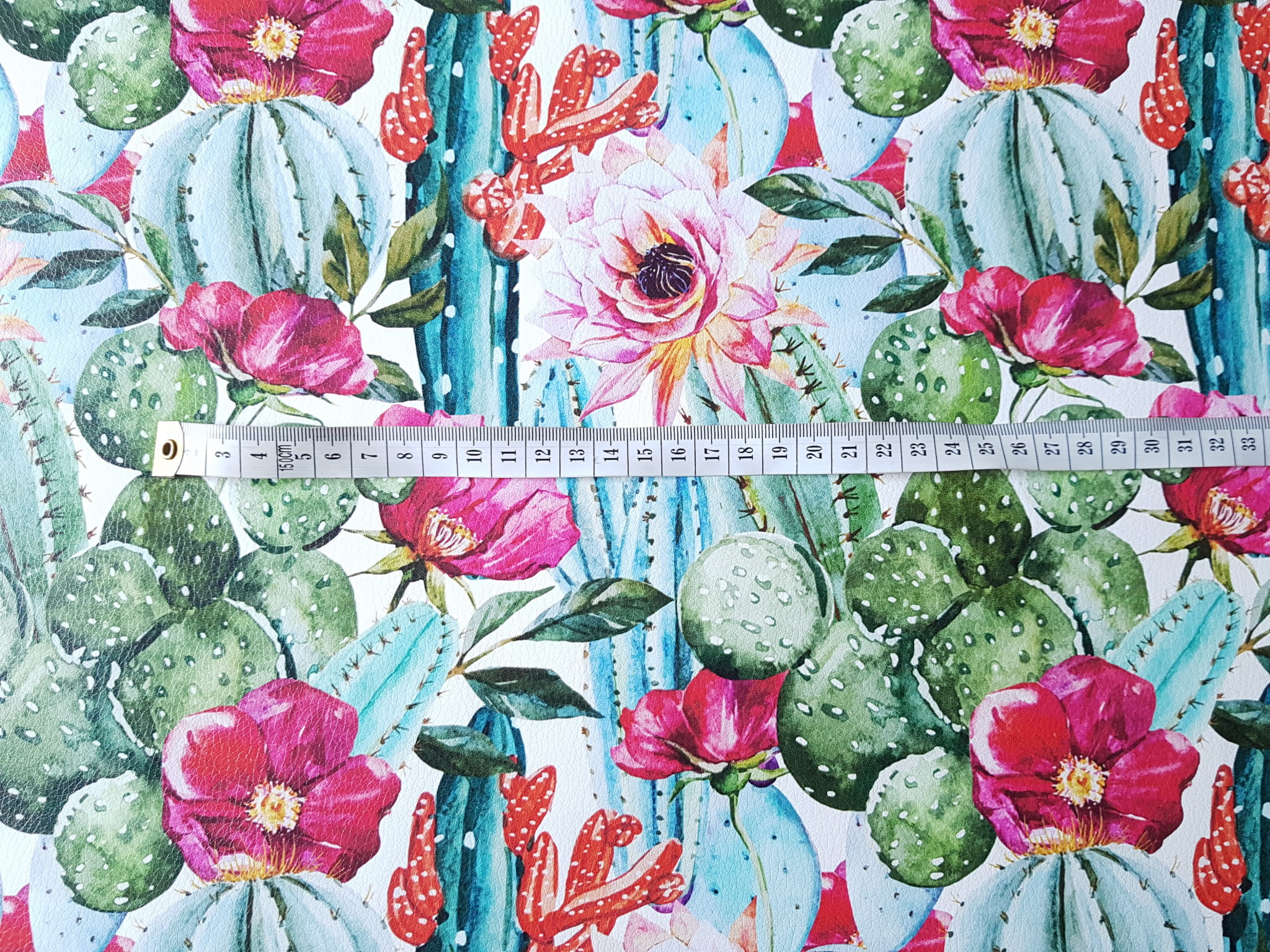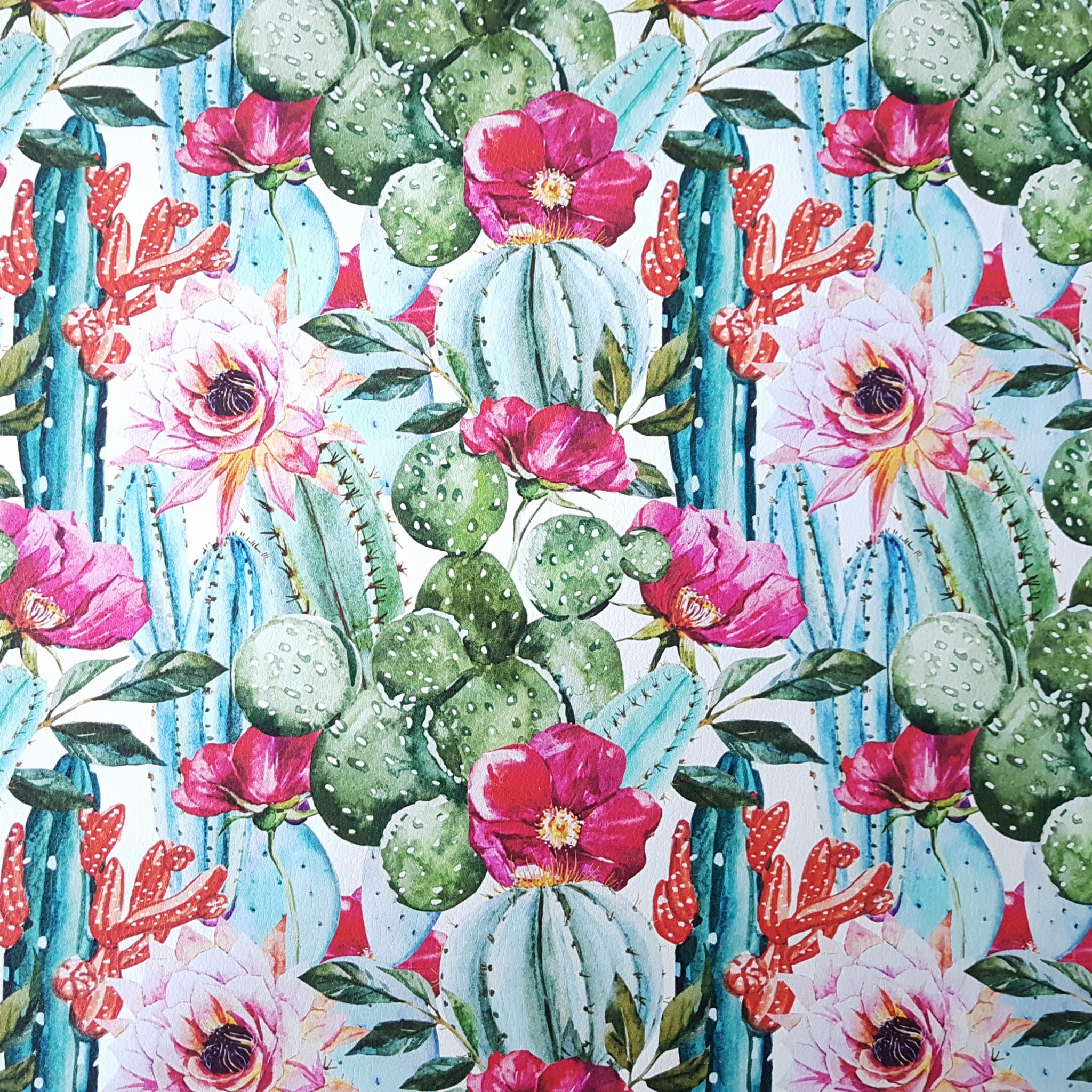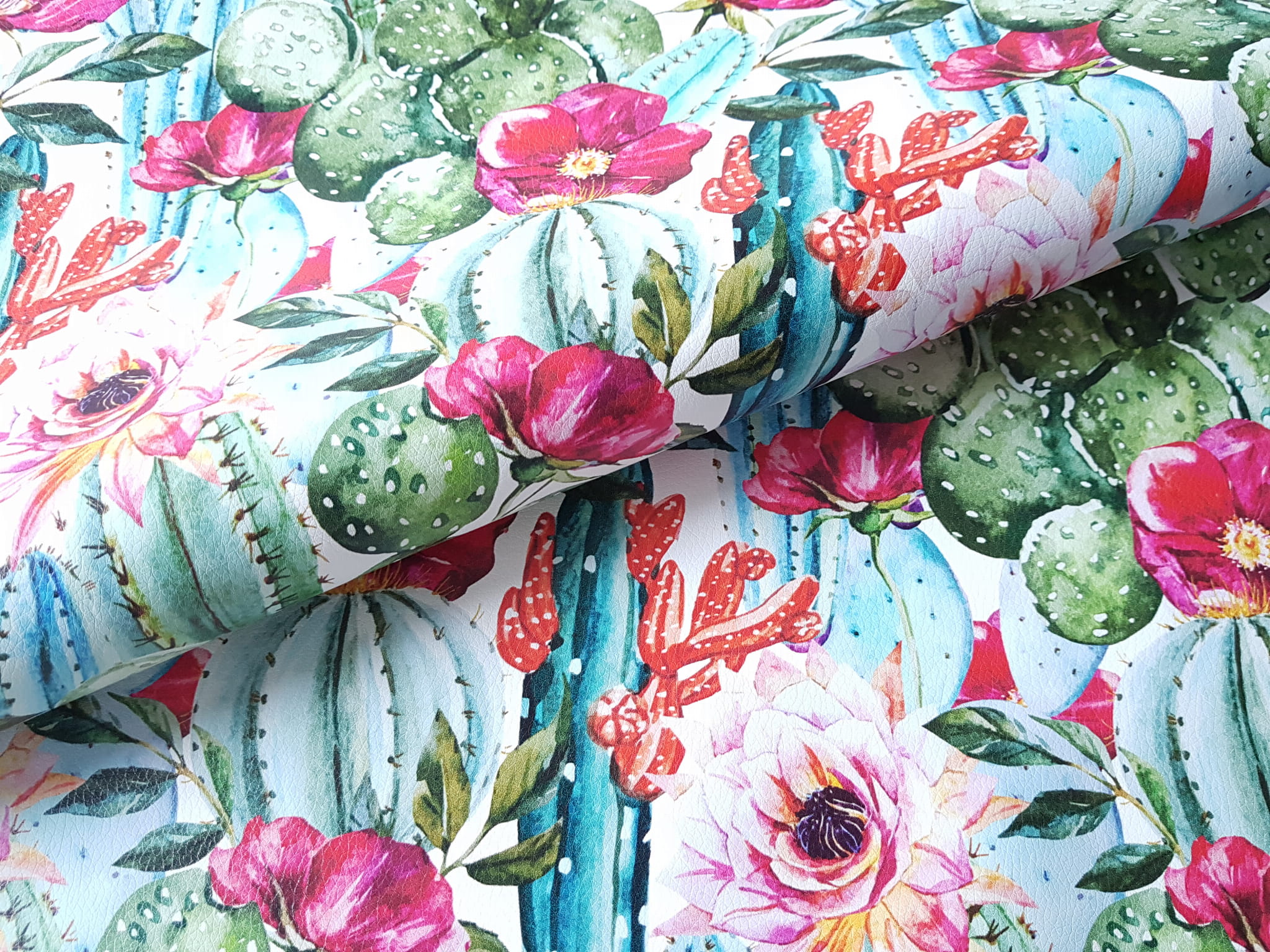 Ekoskóra drukowana ze wzorem fantastycznych kaktusów w otoczeniu kolorowych kwiatów.