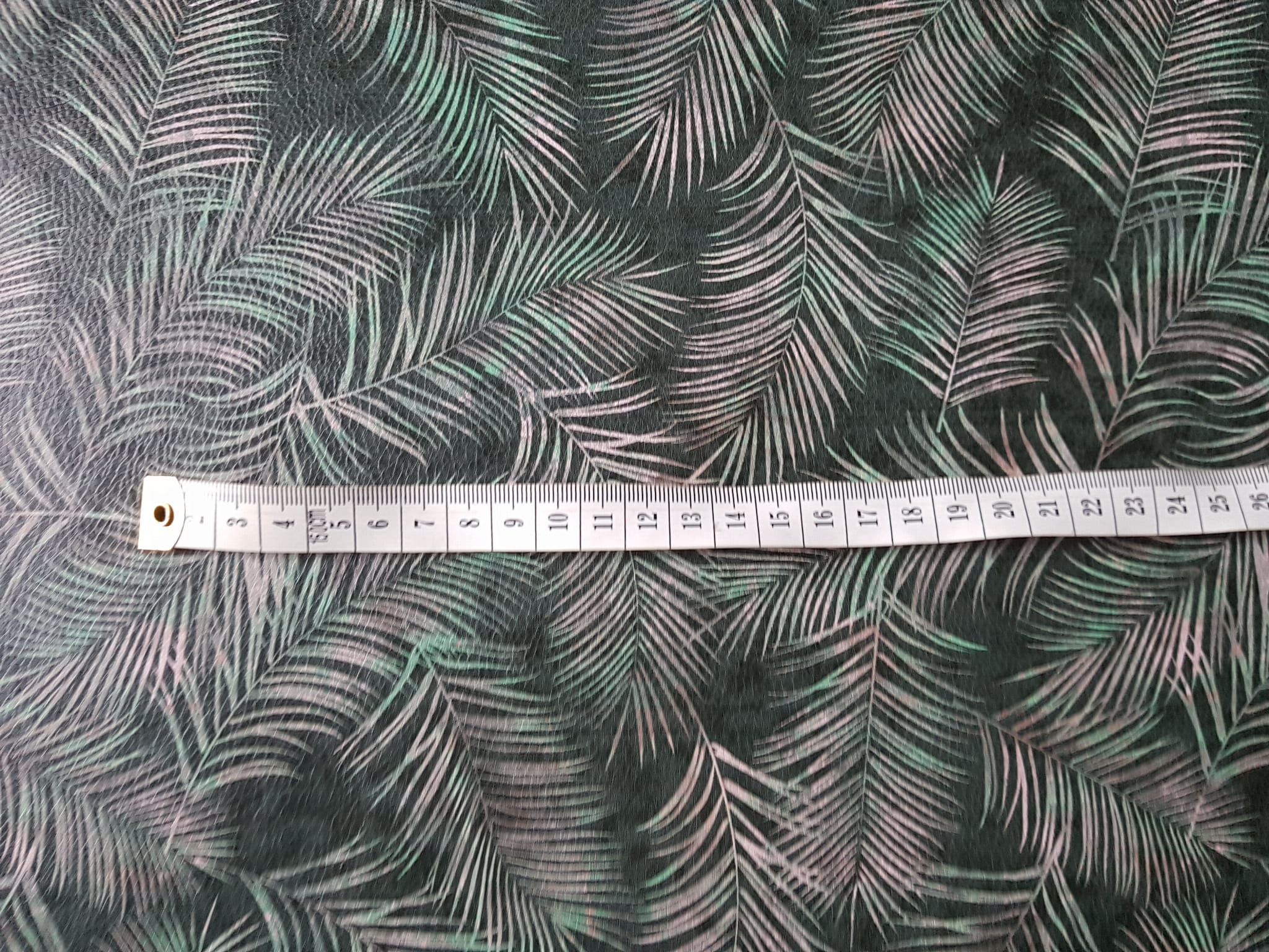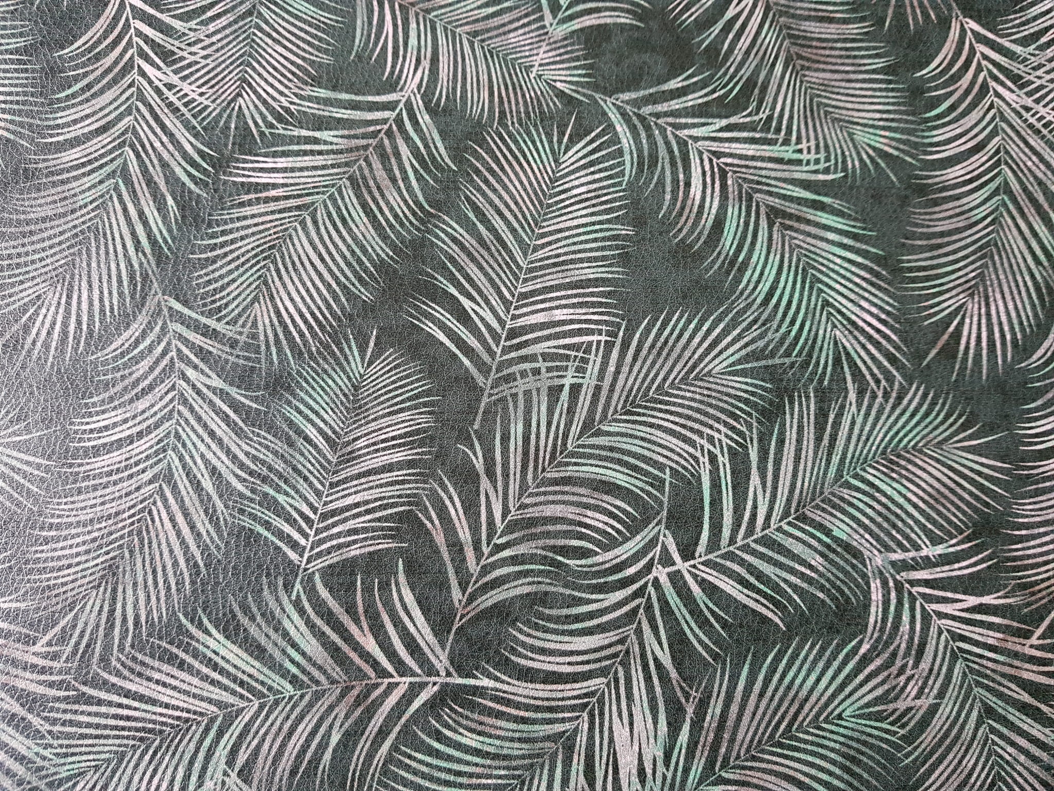 Ekoskóra drukowana ze wzorem liści tropikalnych na ciemnozielonym tle.