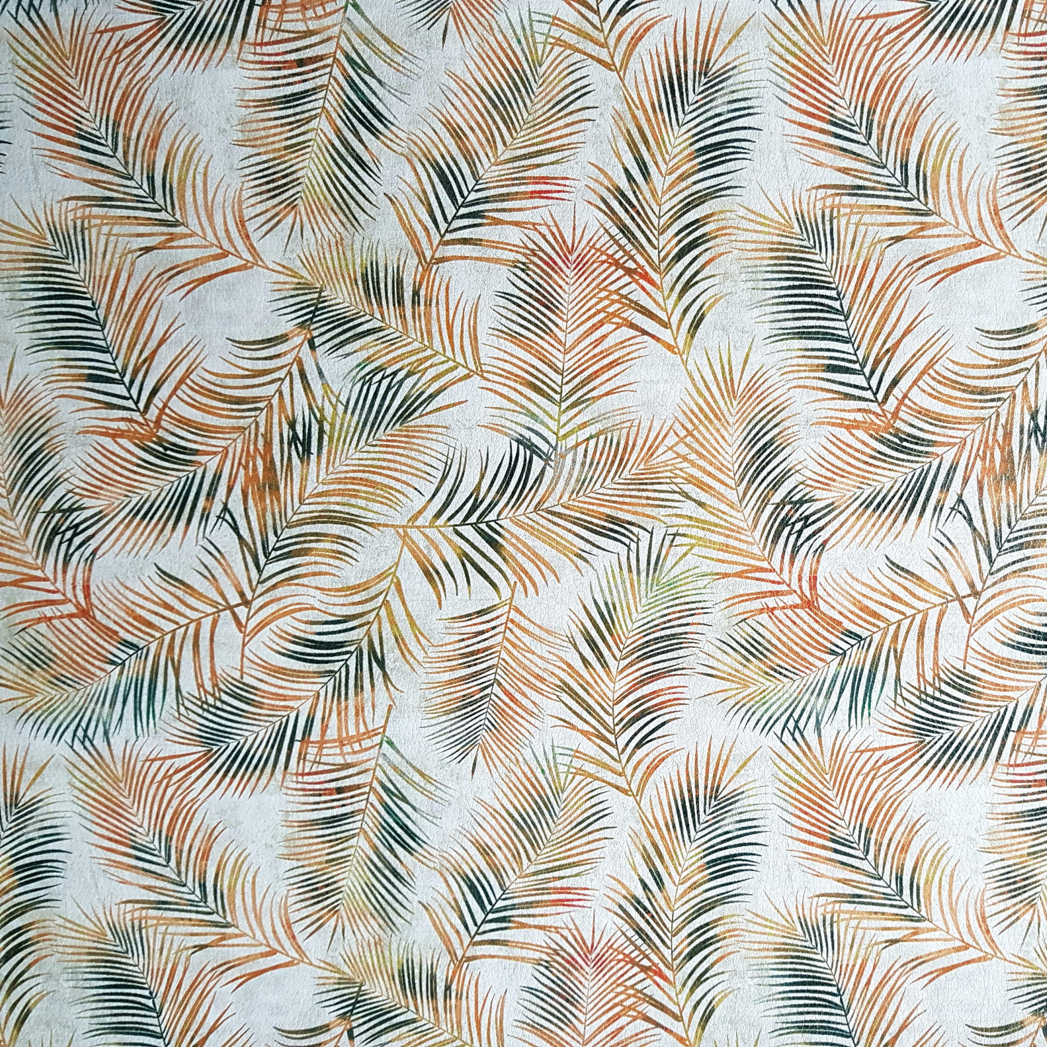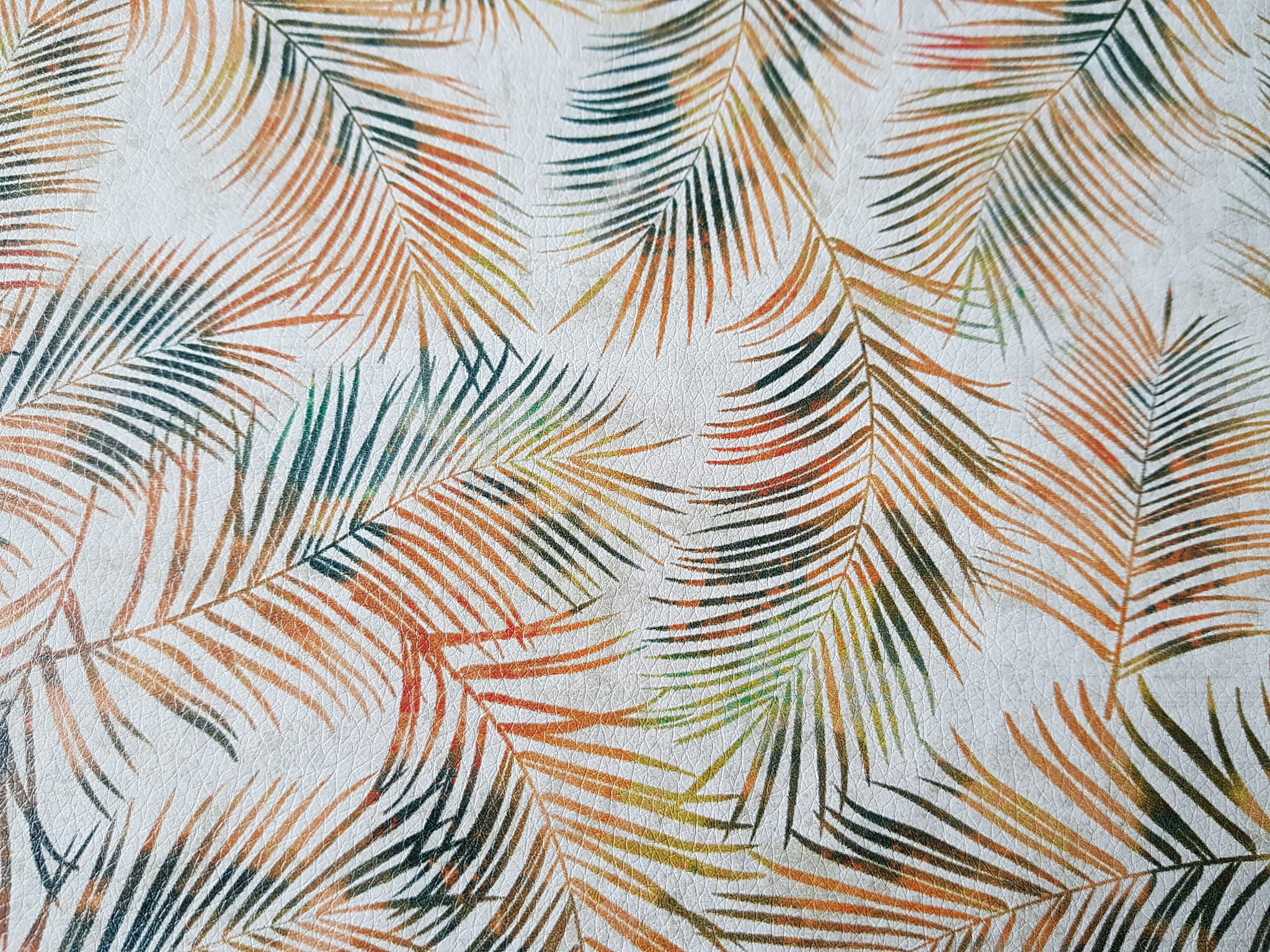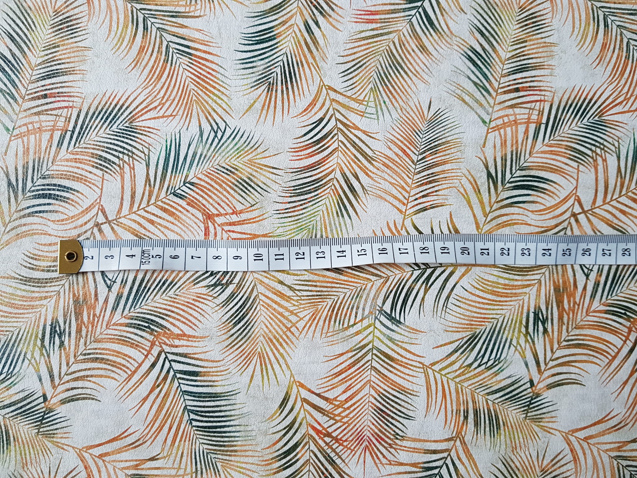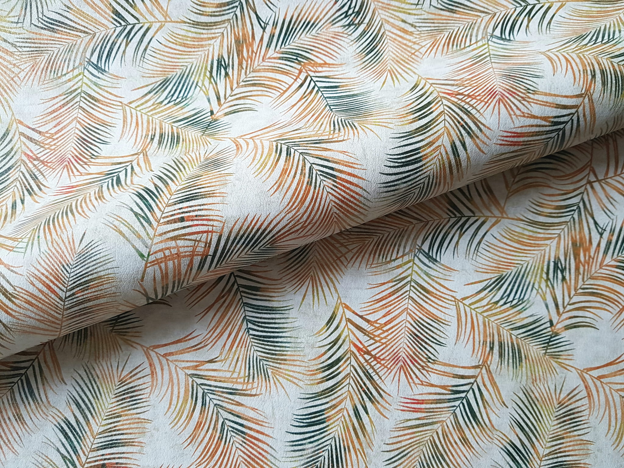 Ekoskóra drukowana ze wzorem złotych liści tropikalnych na beżowym tle.