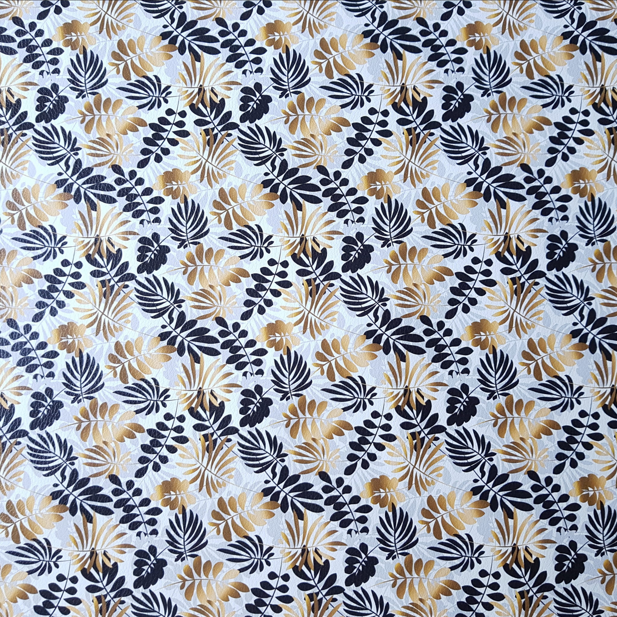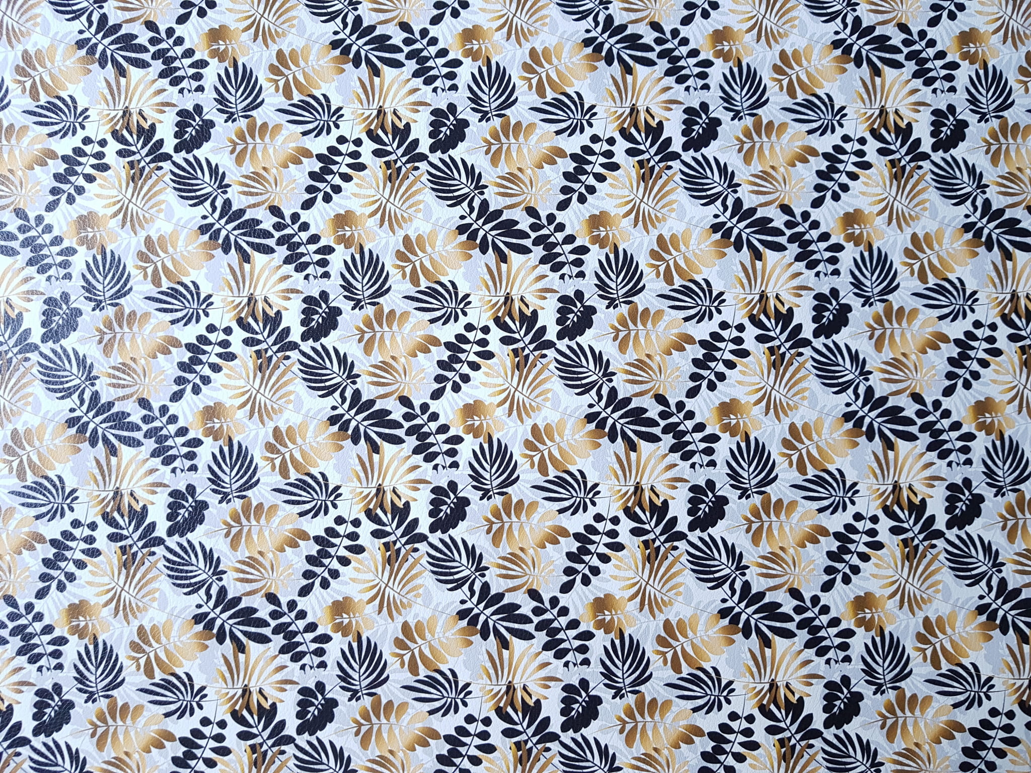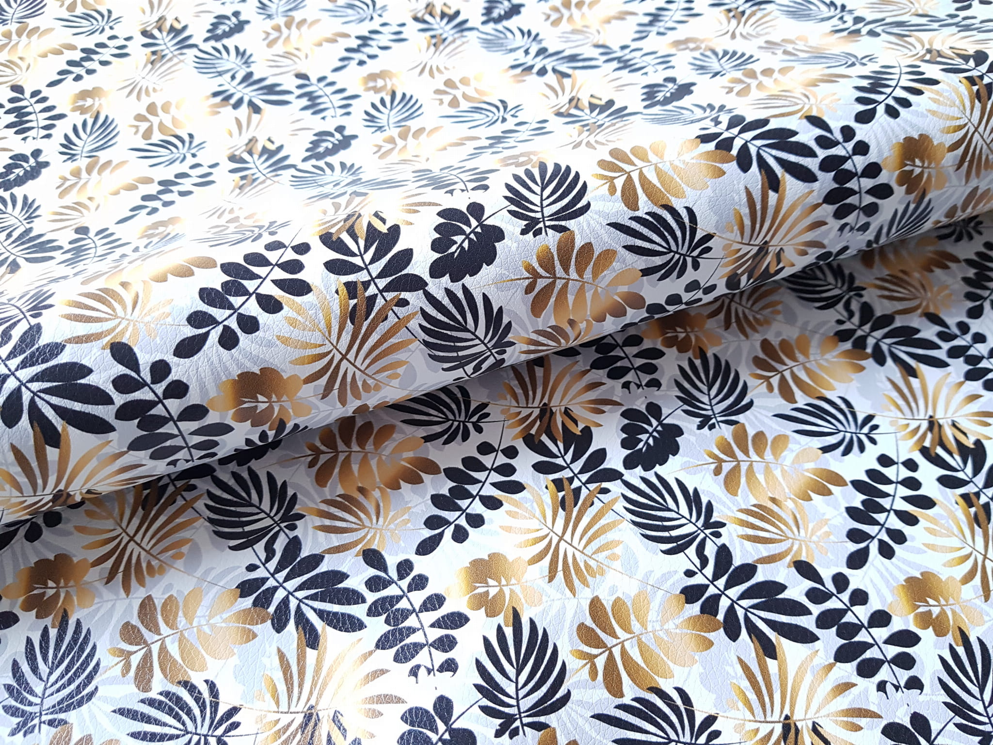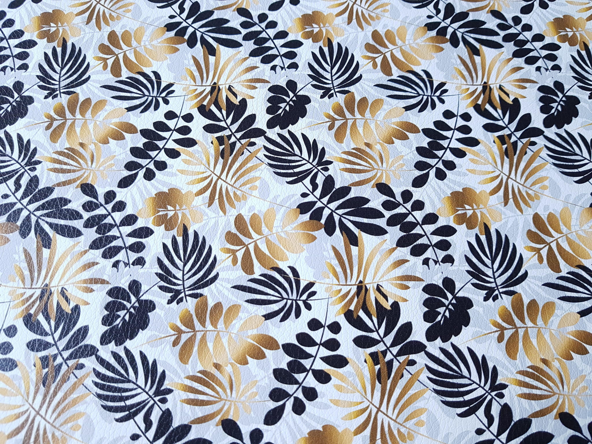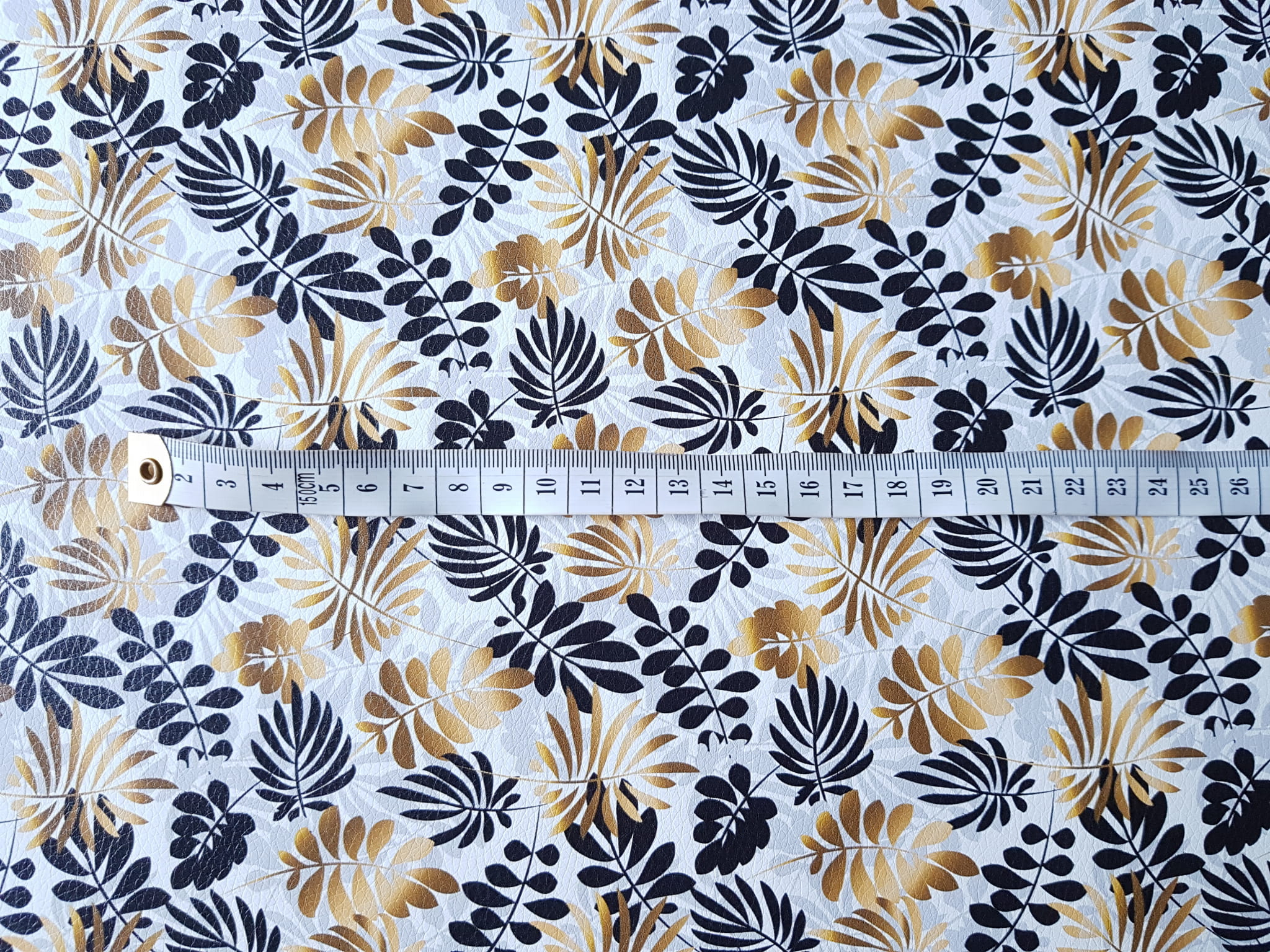 Ekoskóra drukowana ze wzorem jesiennych liści w kolorach złota i czerni.