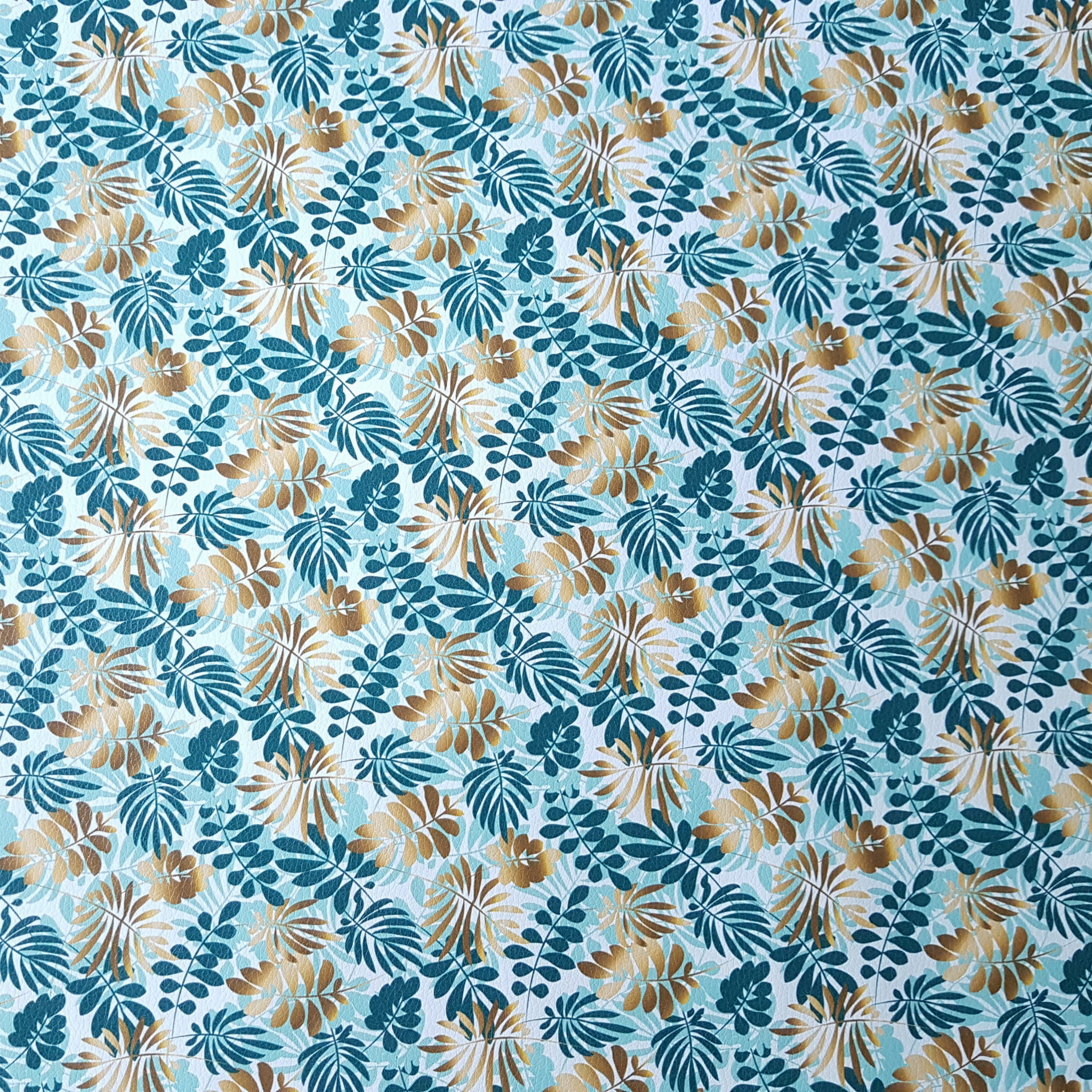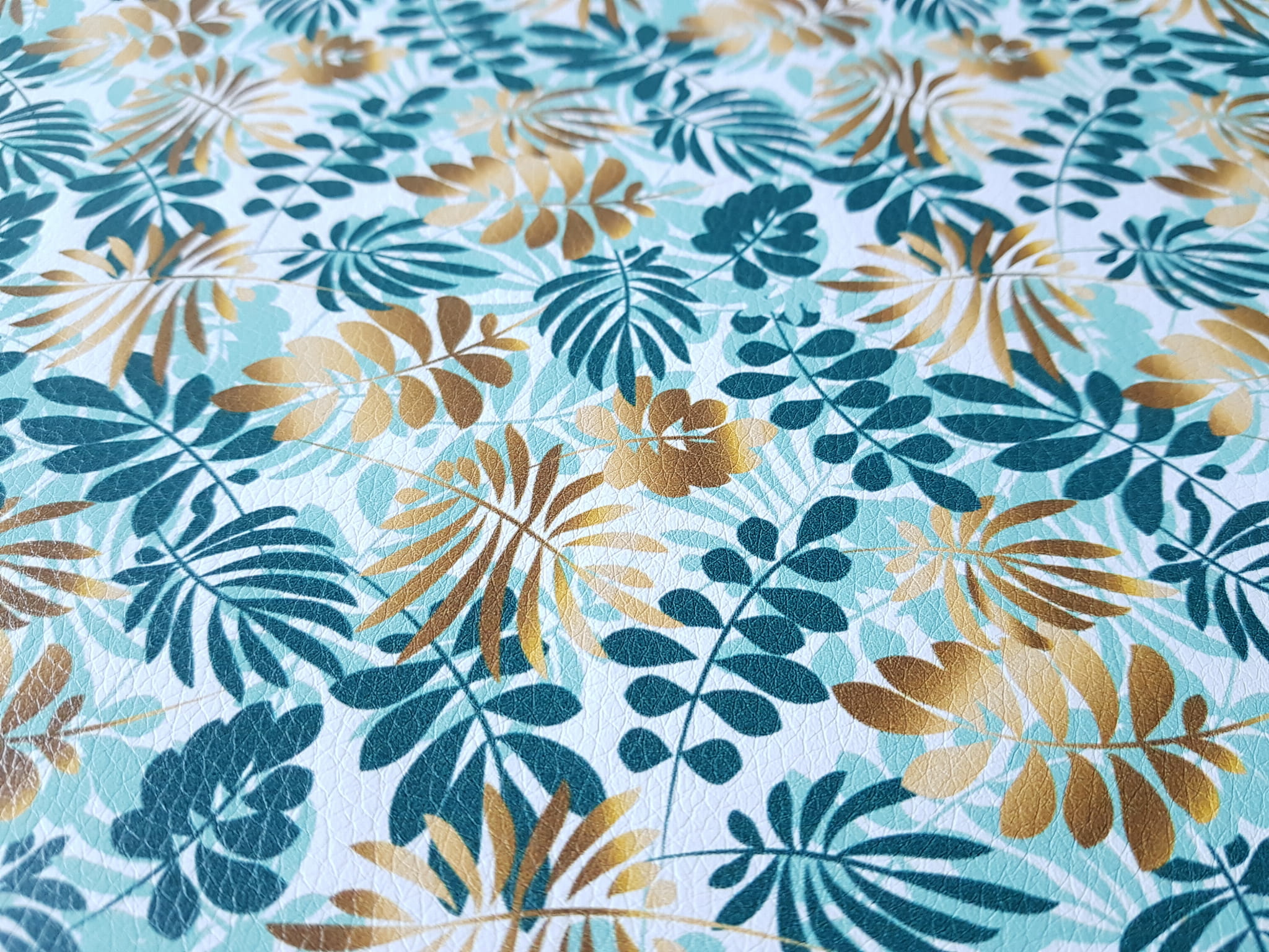 Ekoskóra drukowana ze wzorem jesiennych liści w kolorach złota i turkusu.