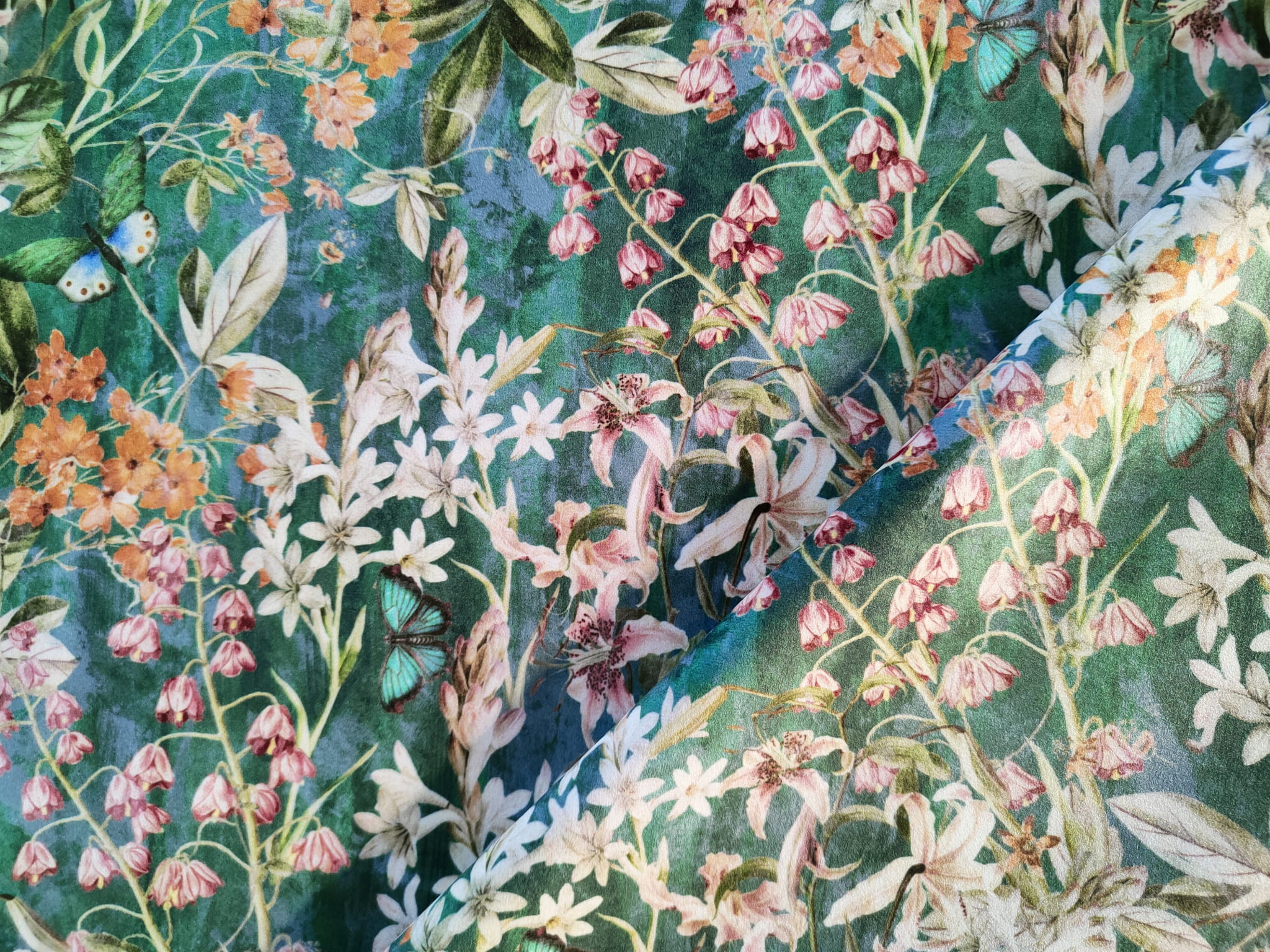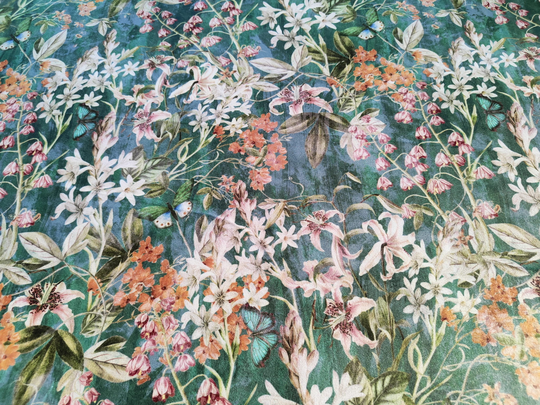 Unikatowa tkanina welurowa w niespotykany wzór łąkowych kwiatów w otoczeniu pięknych motyli. Zielone tło z delikatnym efektem rozmycia sprawia, że materiał drukowany ze wzorem kwiatów stanowi idealną propozycję dla miłośników urządzania wnętrz.