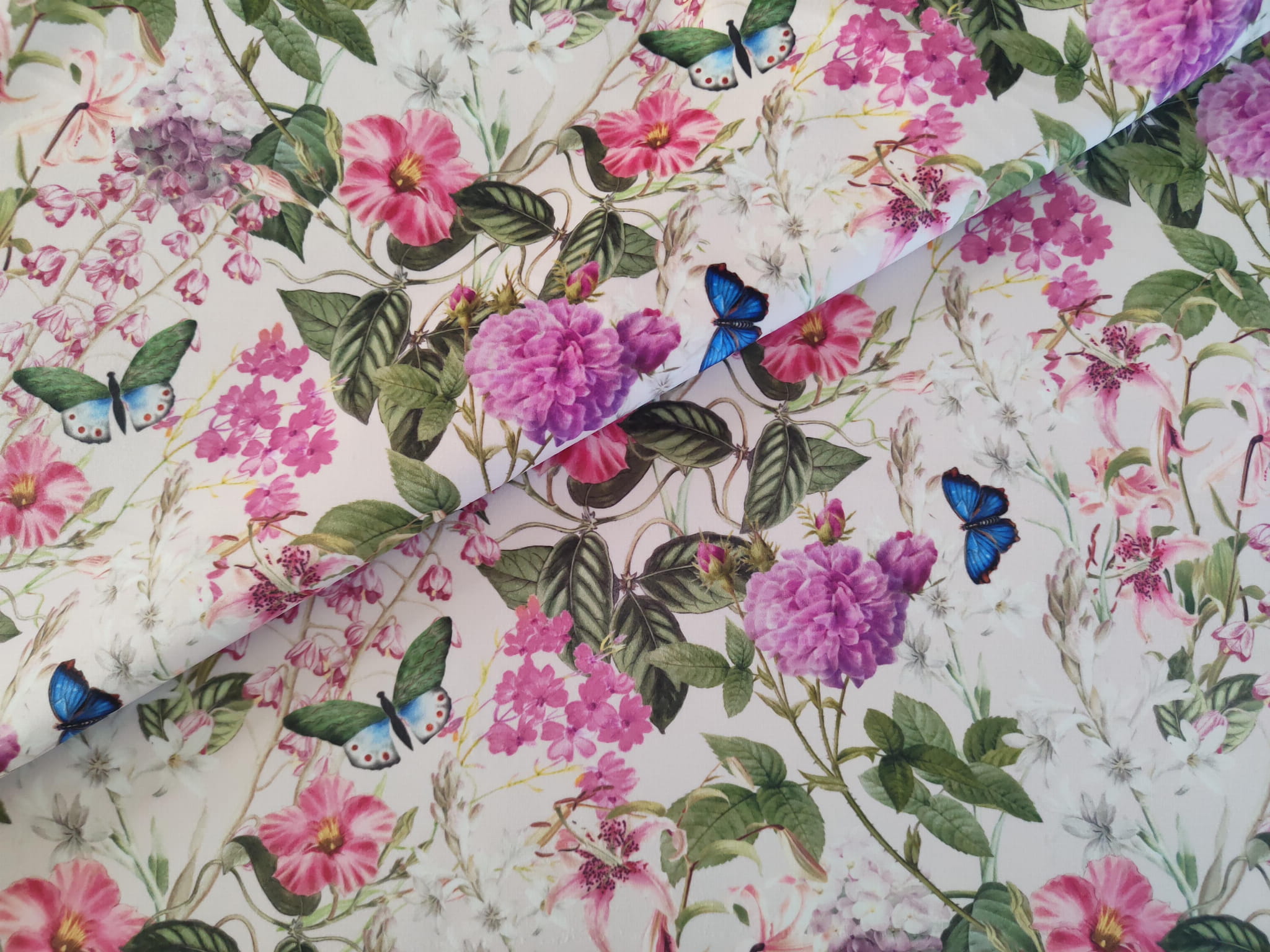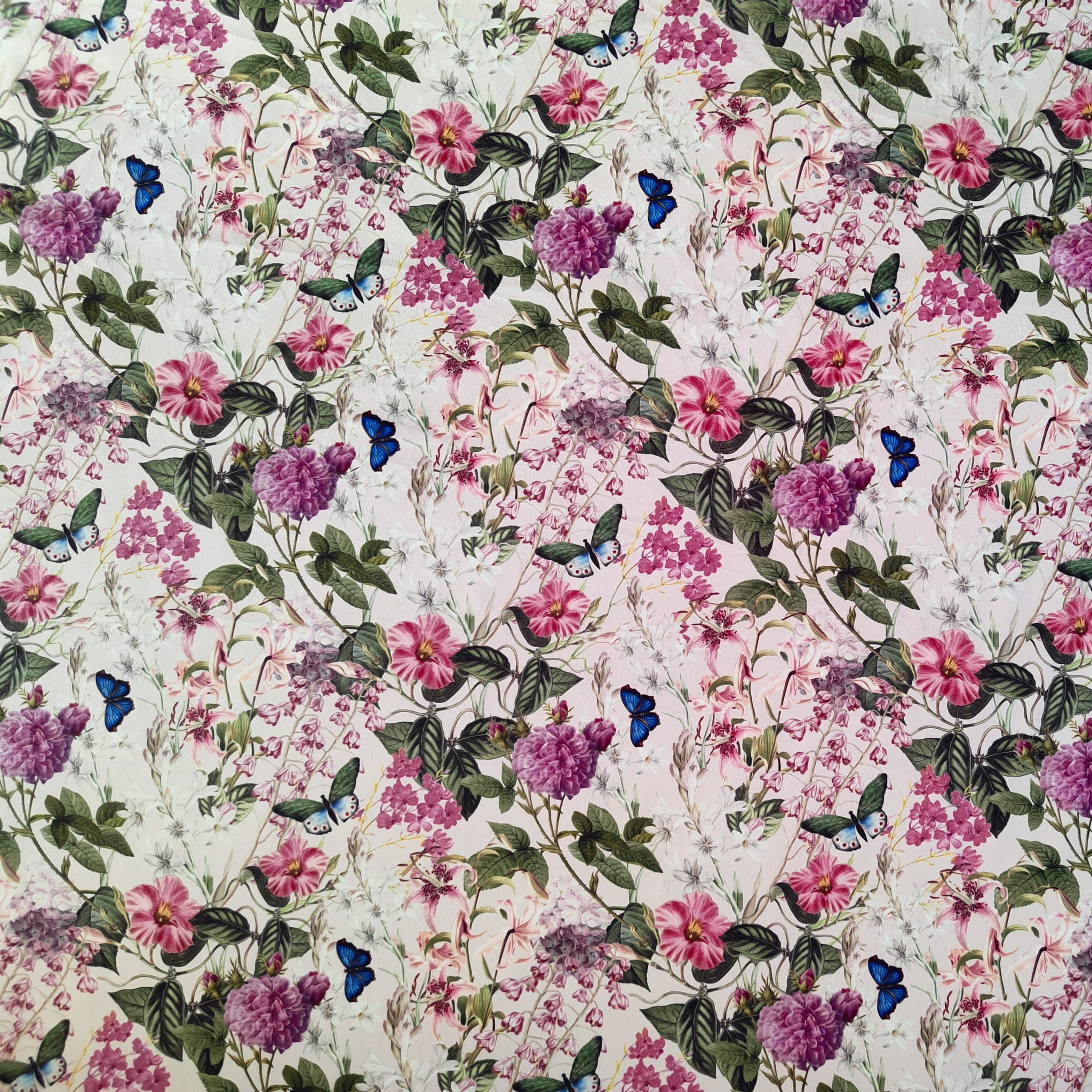 Unikatowa tkanina welurowa w energetyczny wzór różowych kwiatów w otoczeniu pięknych motyli. Tkaninę tapicerską tworzy połączenie różu z kolorem beżowym dominującym jako tło. Przełamanie stanowi dodatek akcentu zielonego i granatowego.