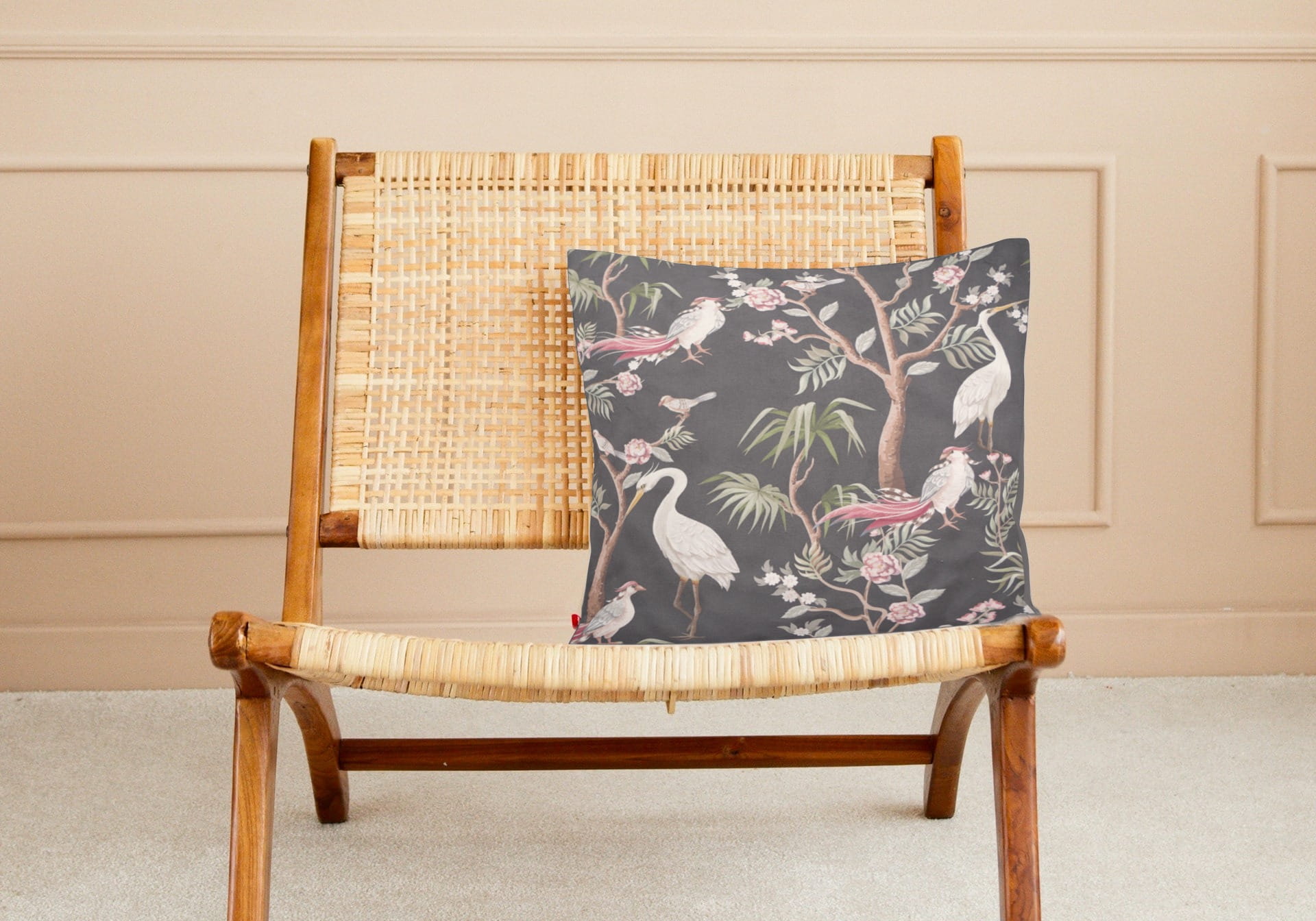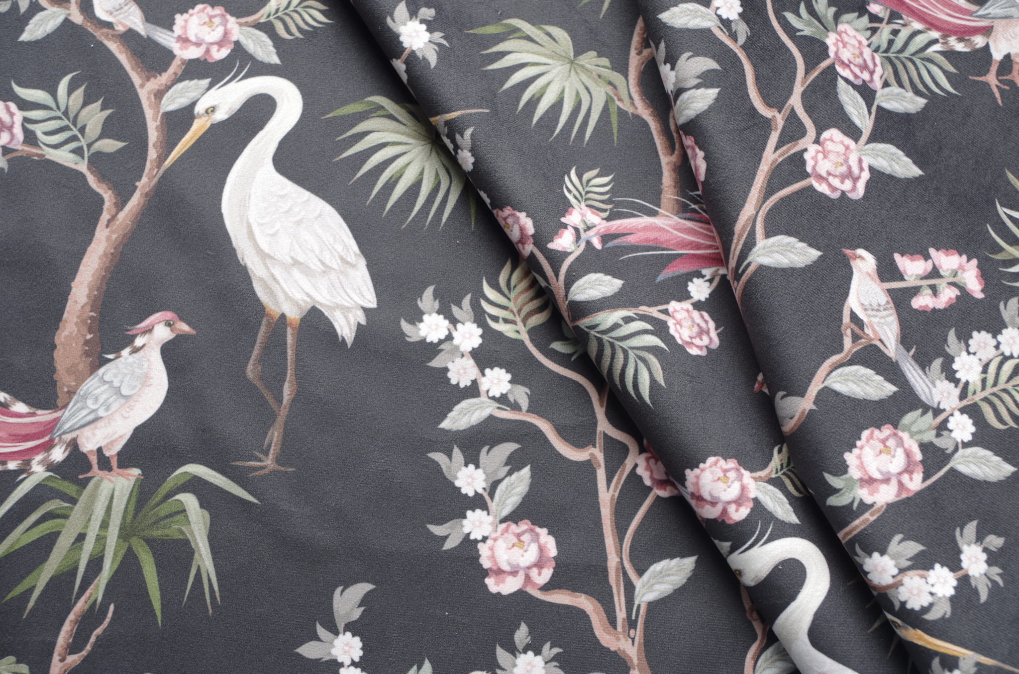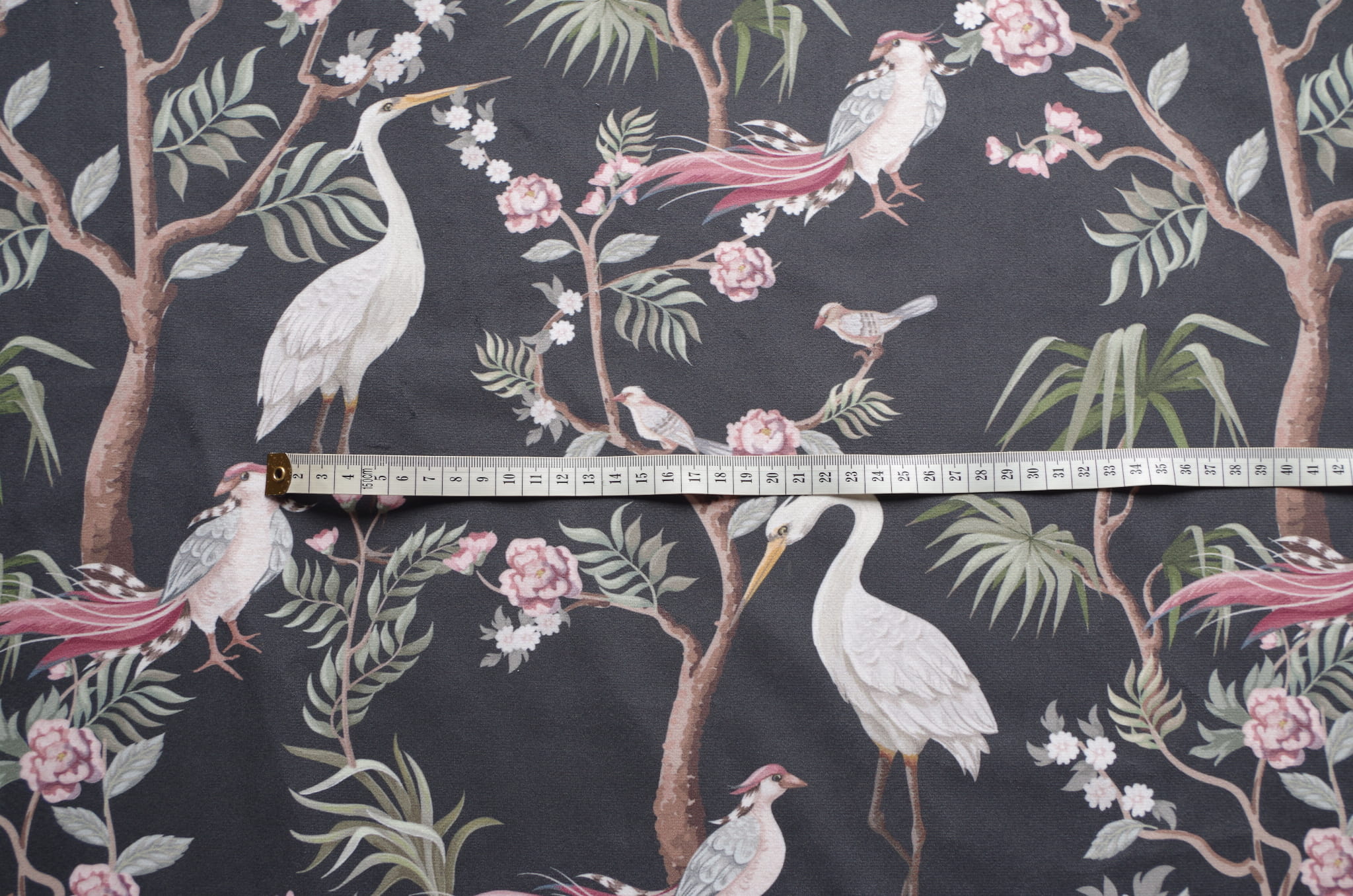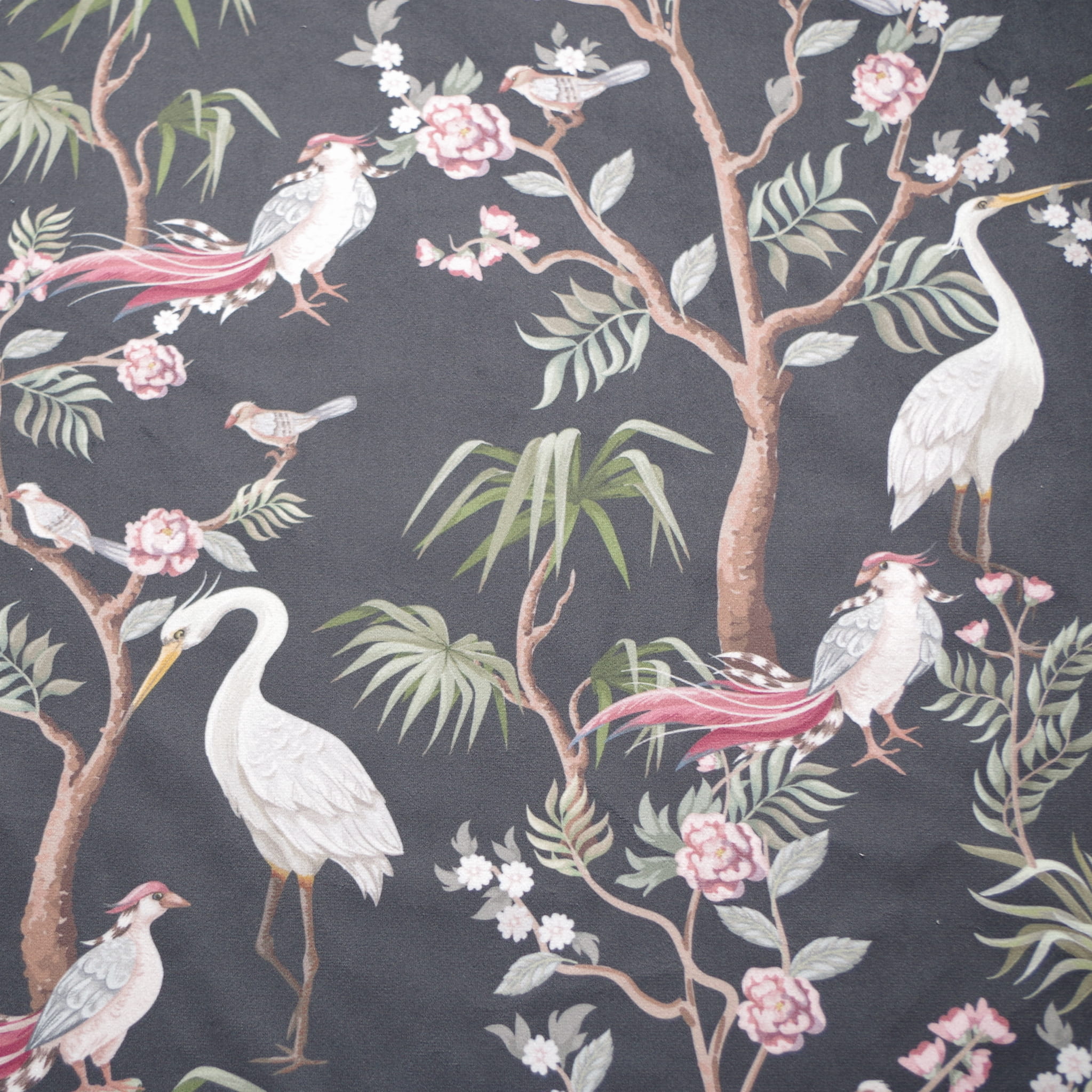 Tkanina tapicerska welur drukowany z pięknym wzorem dostojnych czapli i rajskich ptaków w otoczeniu kwiatów na czarnym tle.