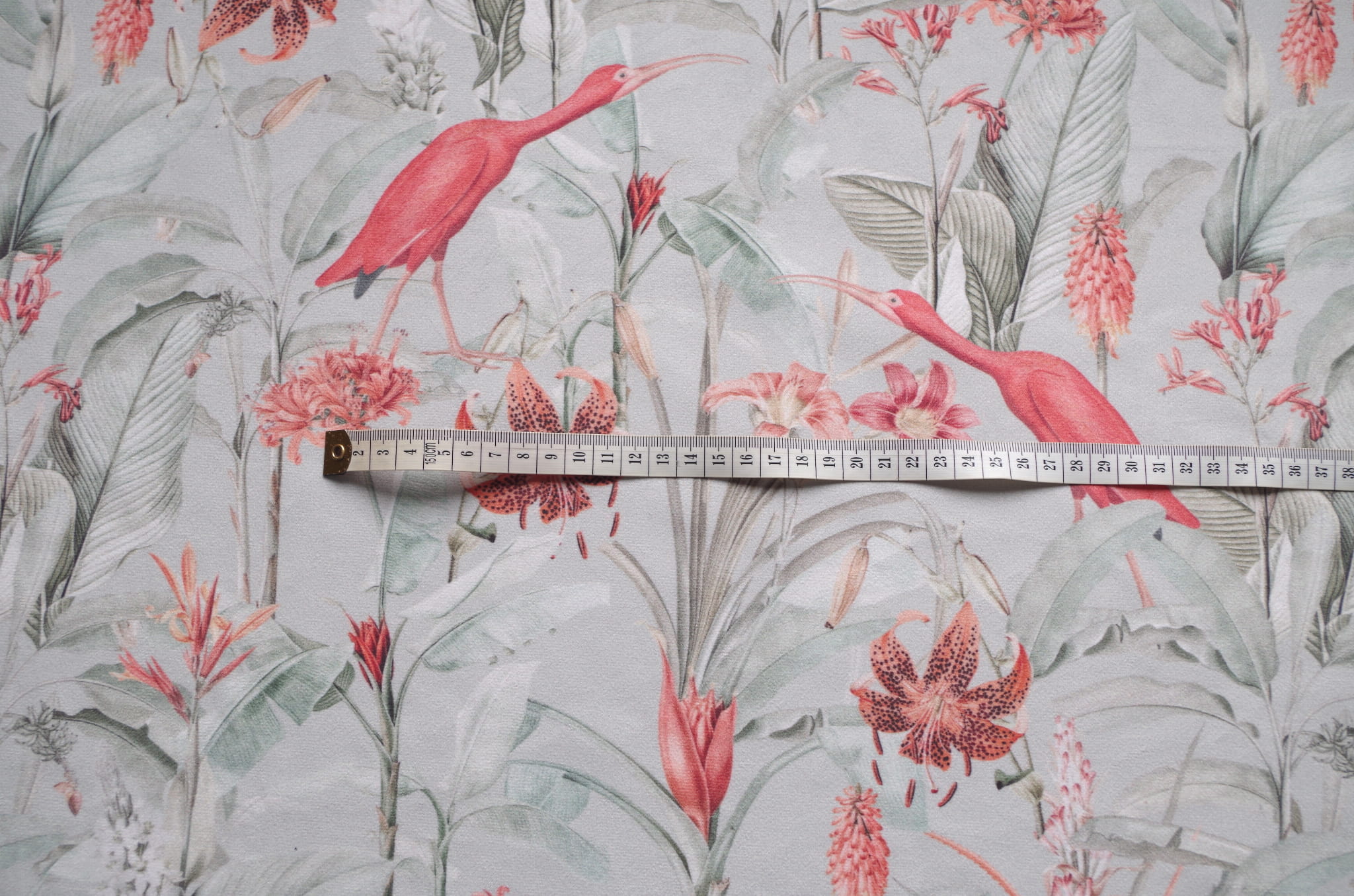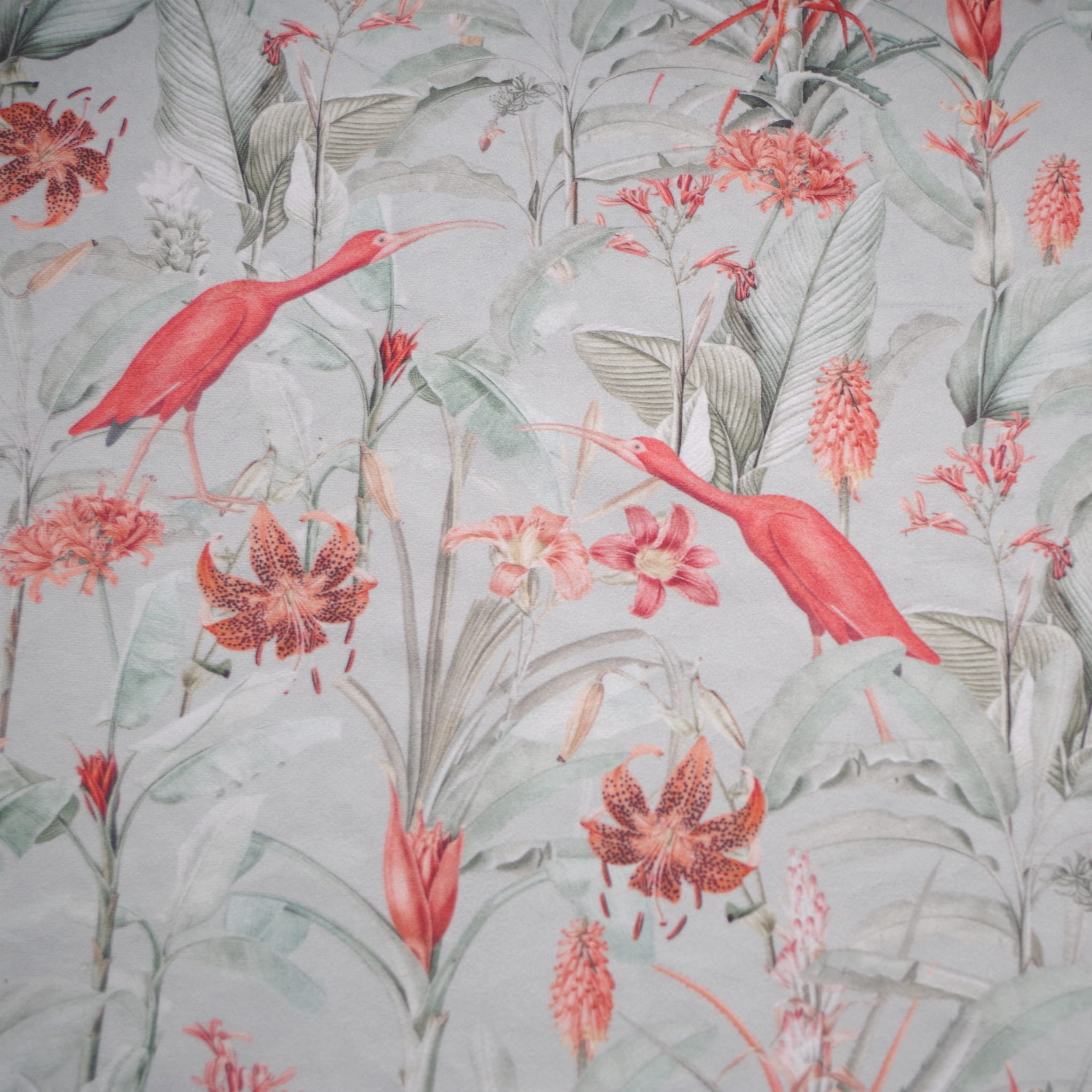 Tkanina tapicerska welur drukowany z bardzo energetycznym wzorem egzotycznych ptaków i liści na miętowym tle.