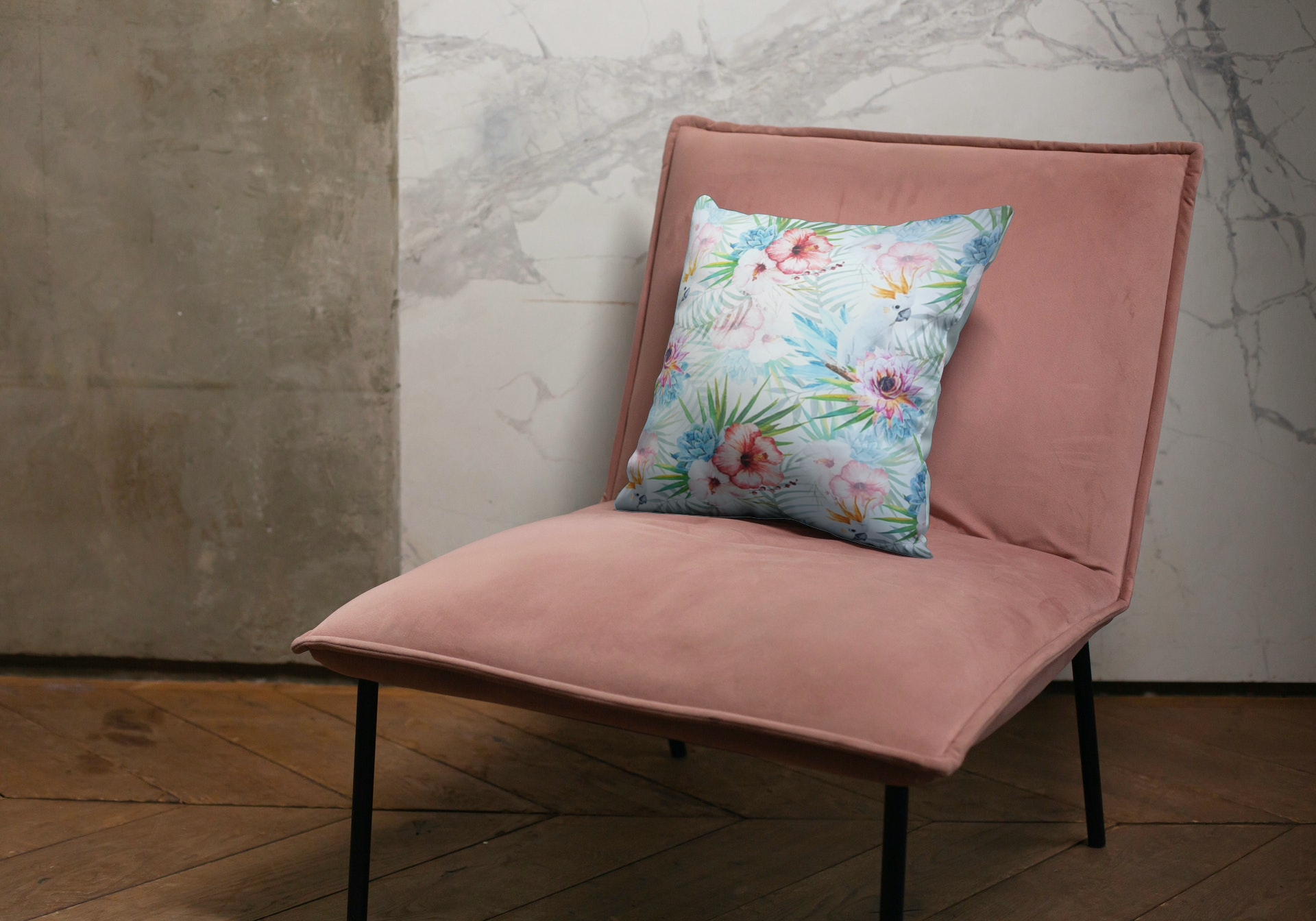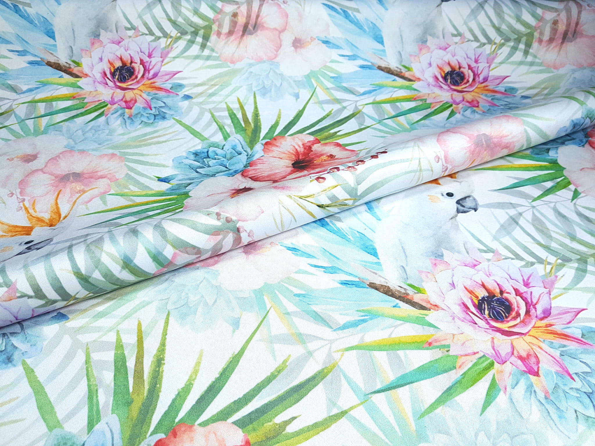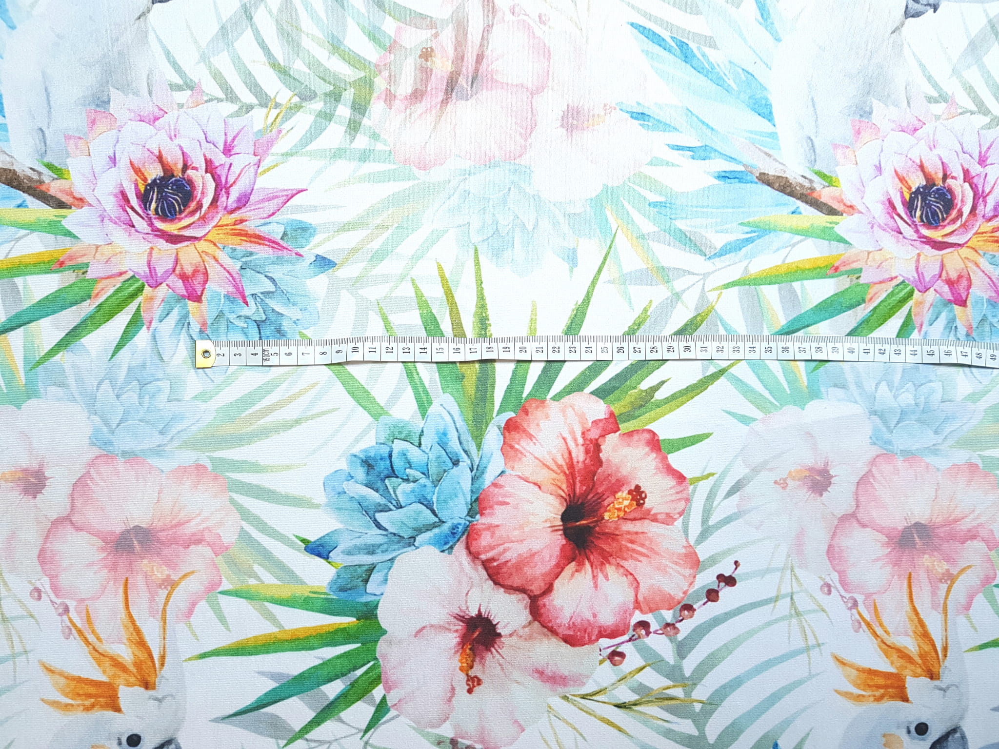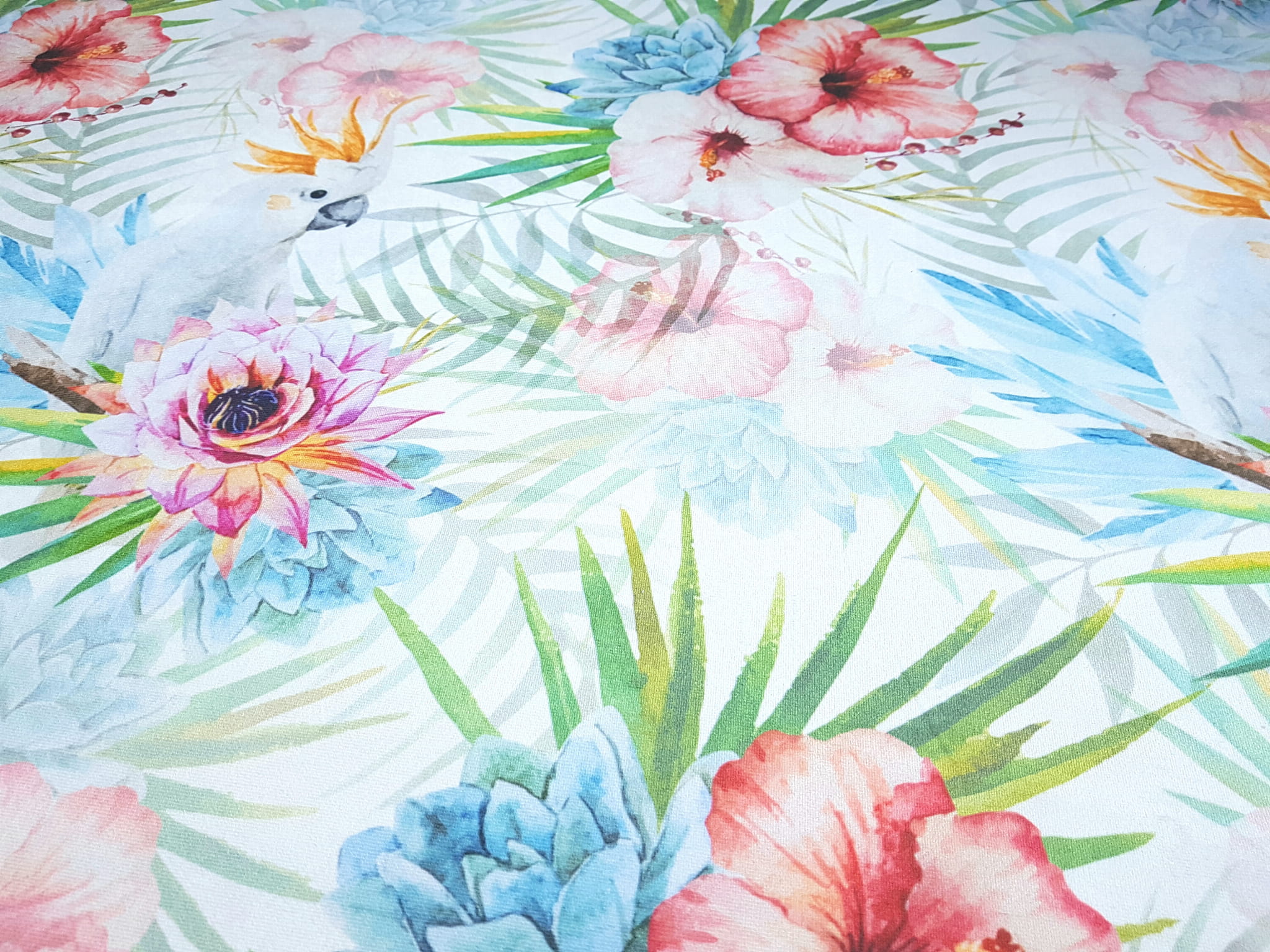 Tkanina tapicerska welur drukowany z bardzo energetycznym wzorem kolorowych kwiatów w otoczeniu egzotycznych papug.