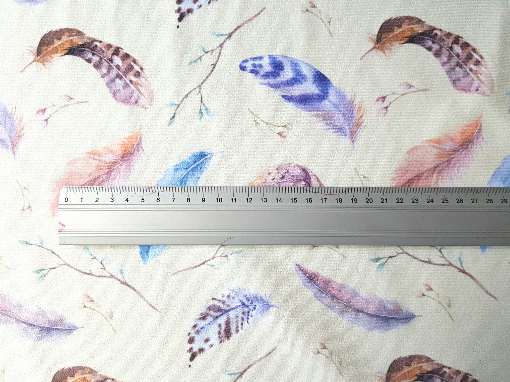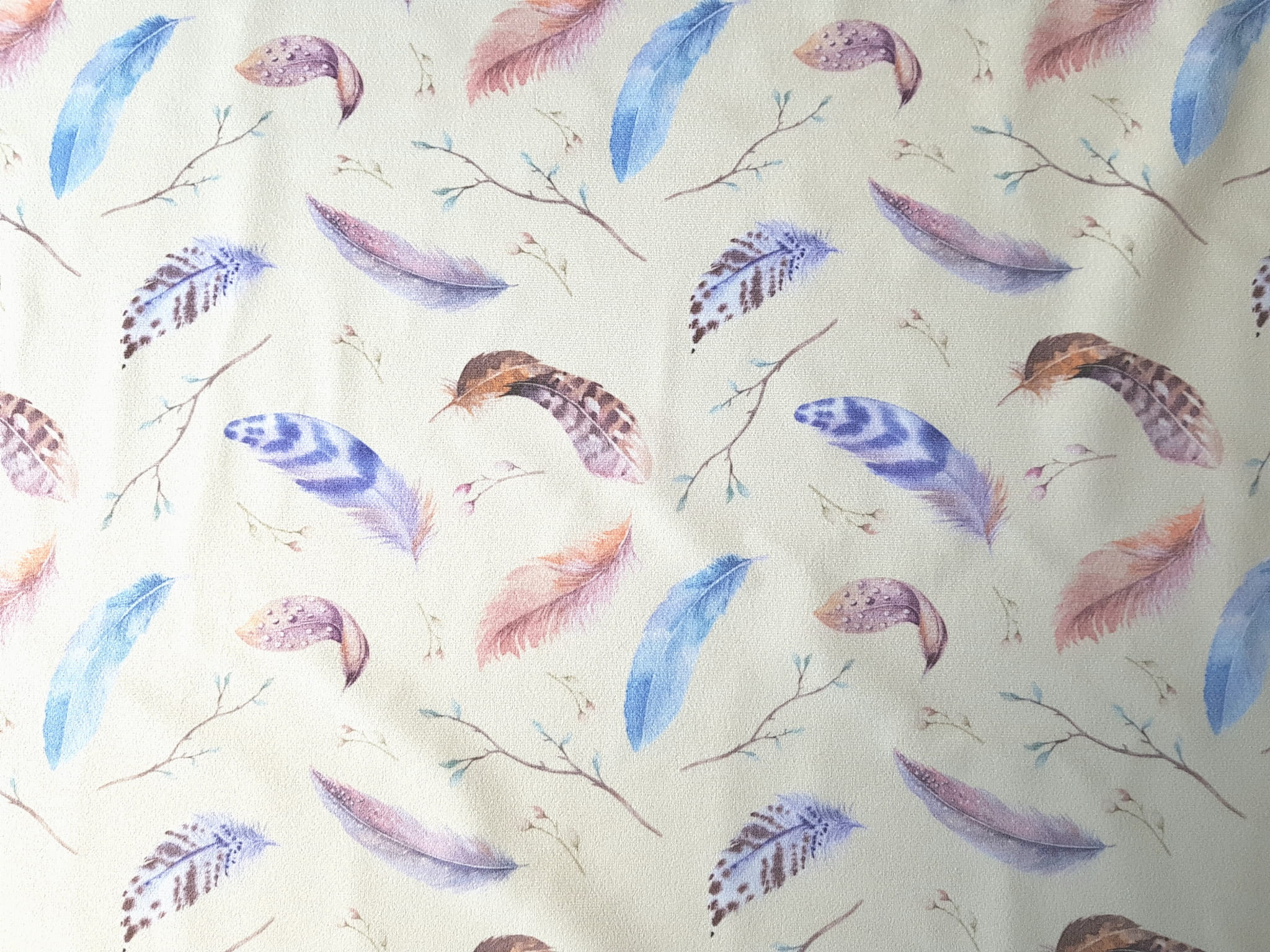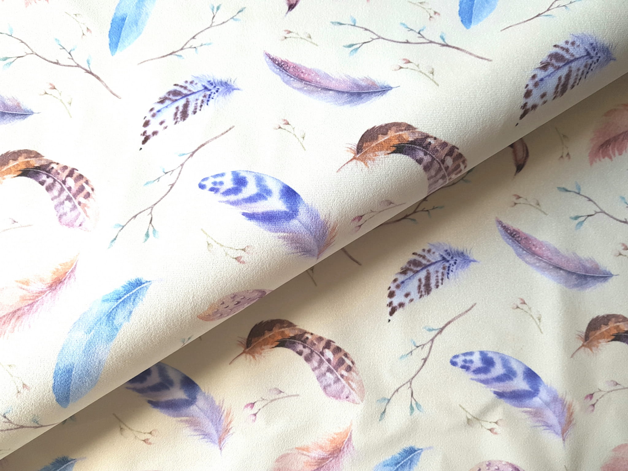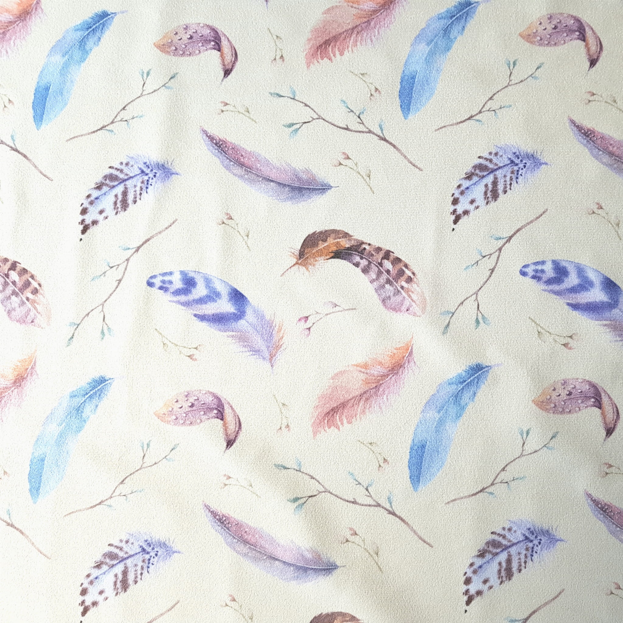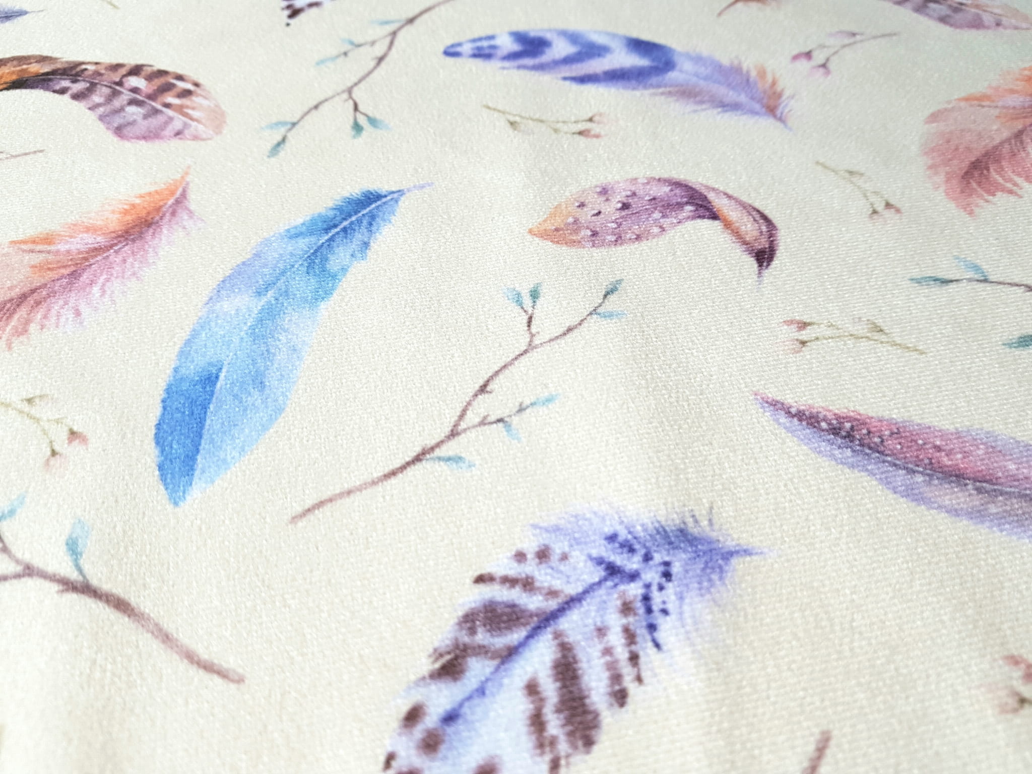 Tkanina tapicerska welur drukowany z kolorowymi piórkami na beżowym tle.