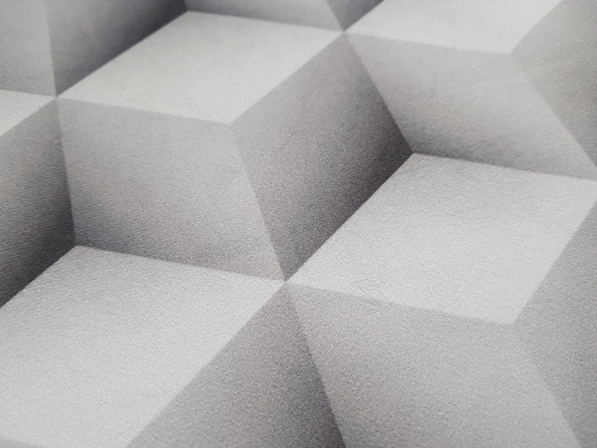Tkanina tapicerska welur drukowany z nowoczesnym wzorem geometrycznych kostek w wersji 3D.