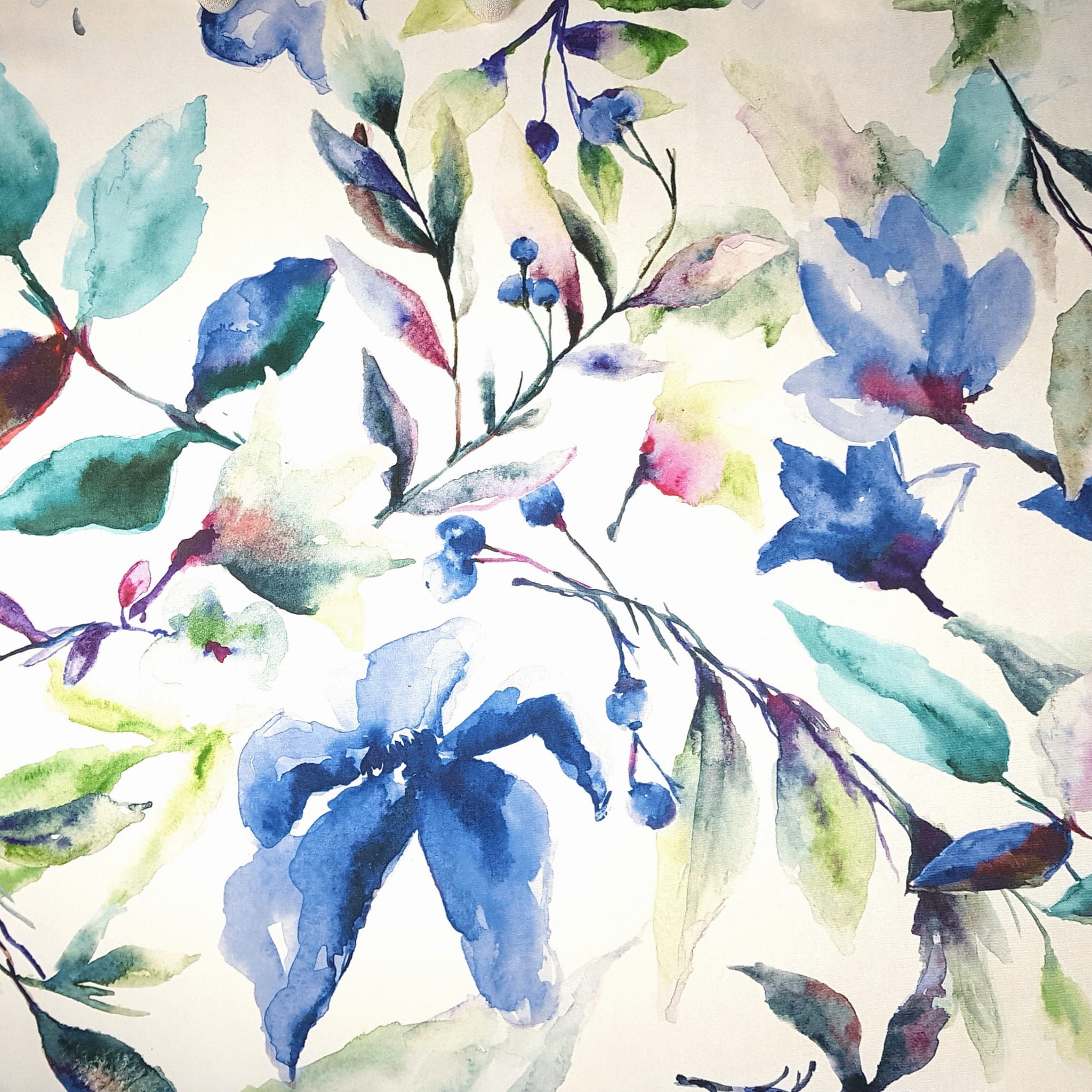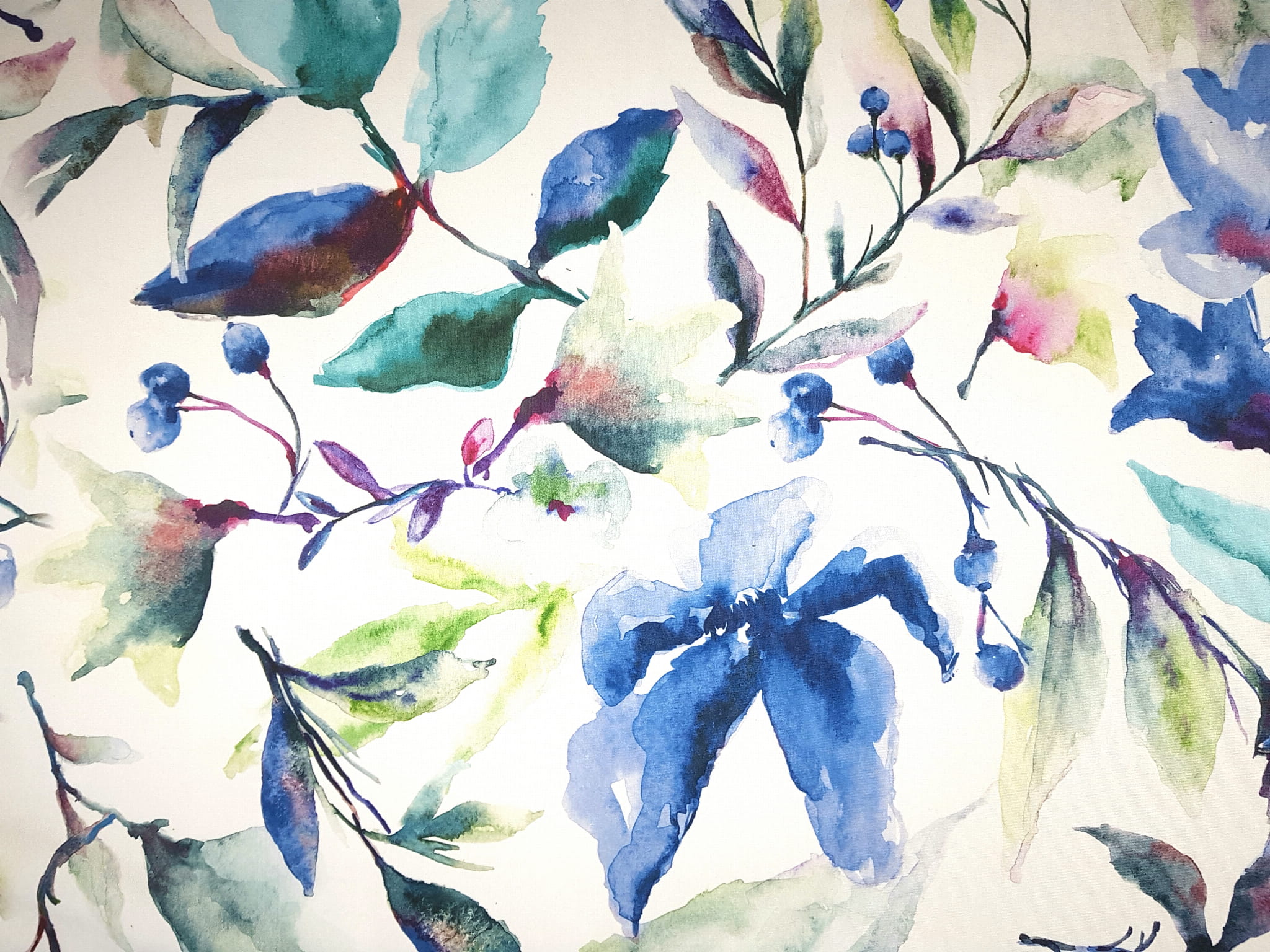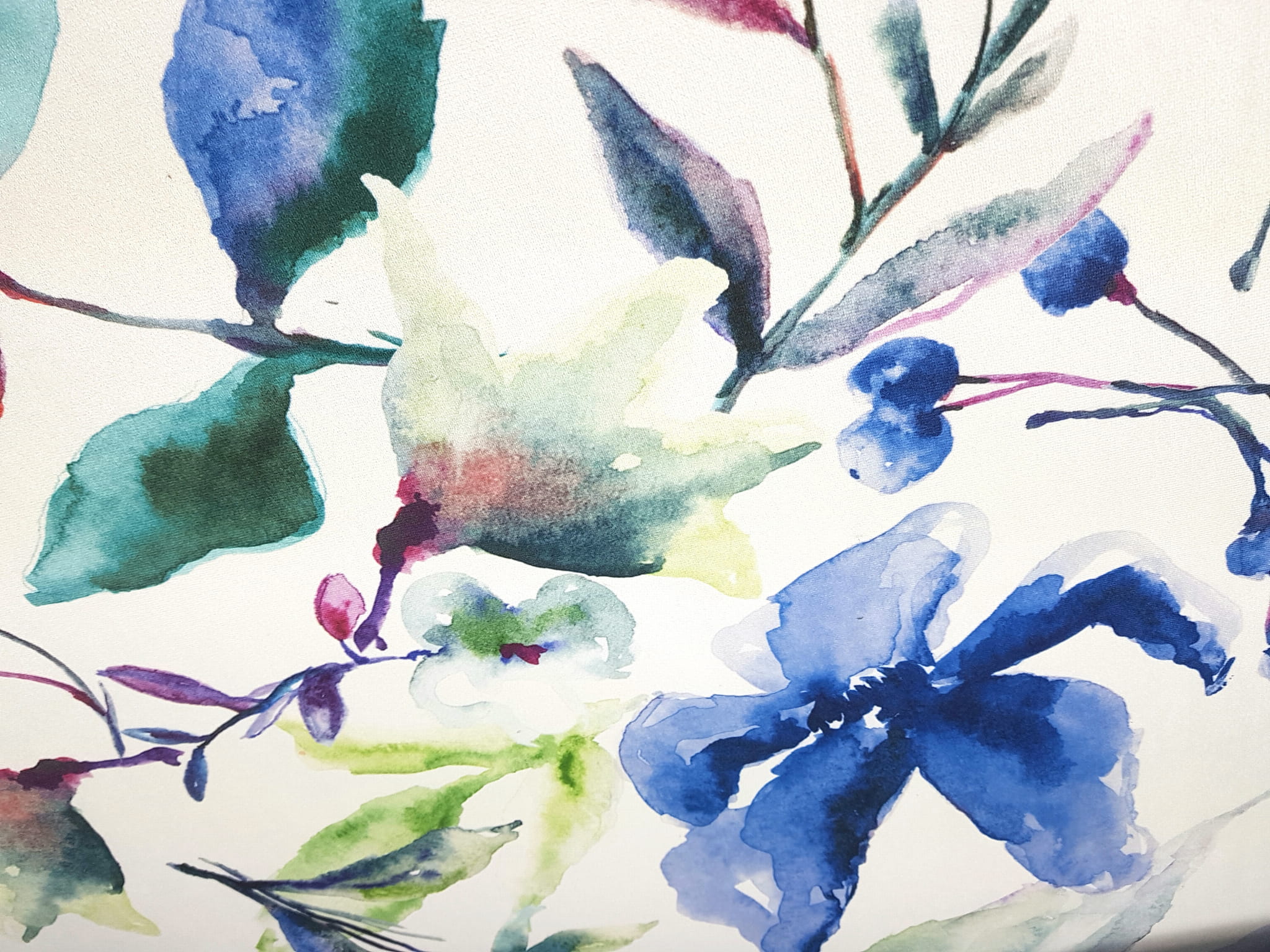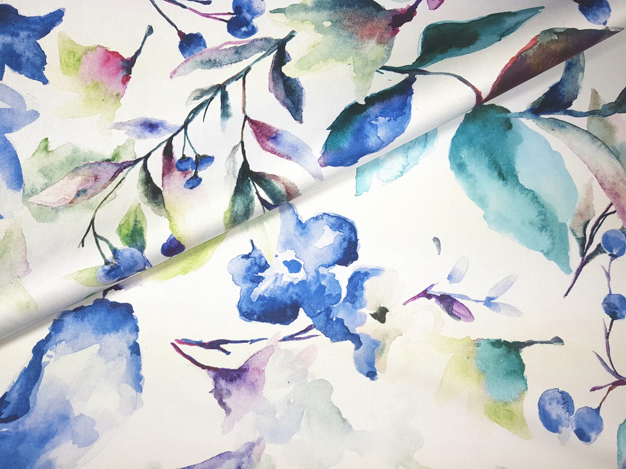 Tkanina tapicerska welur drukowany z nietuzinkowym wzorem akwarelowych kwiatów w kolorze niebieskim.