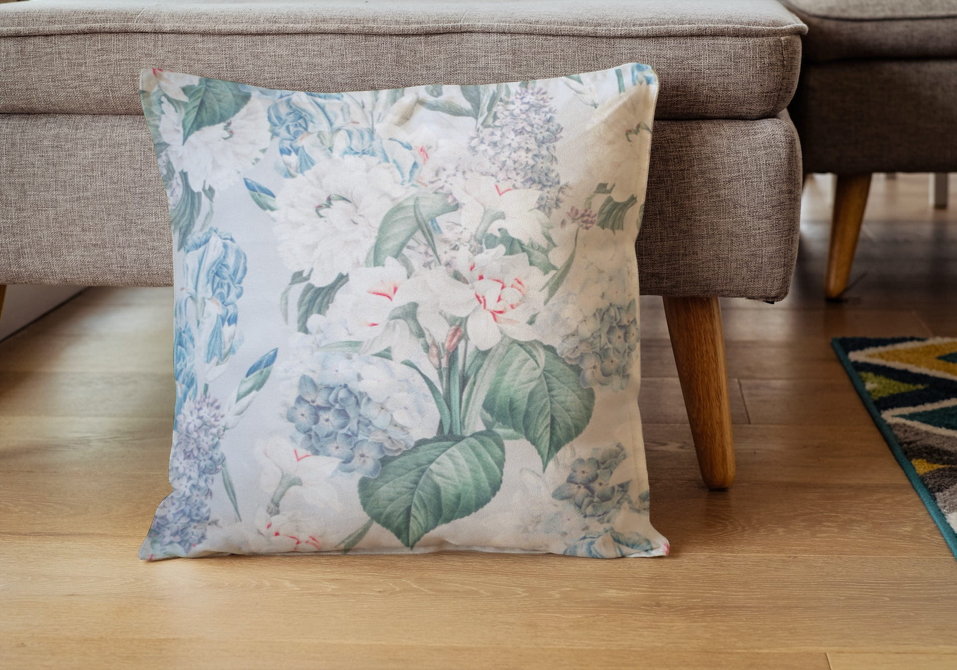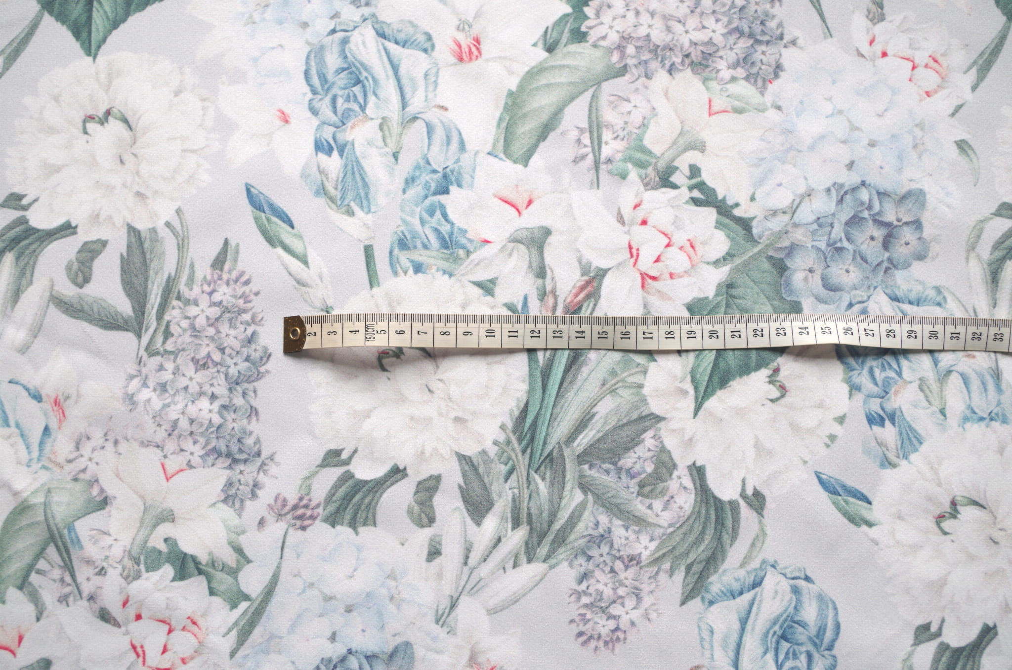 Tkanina tapicerska welur drukowany z pięknym wzorem niebieskich kwiatów bzu w otoczeniu białych lilii na szarym tle.