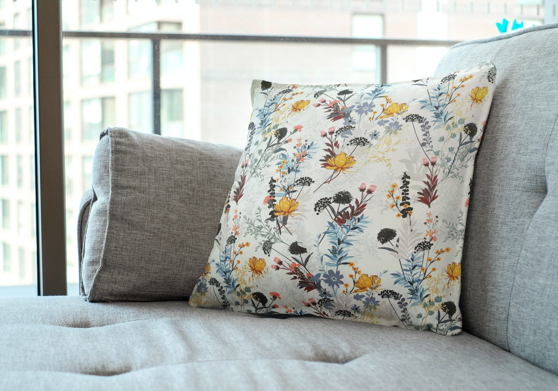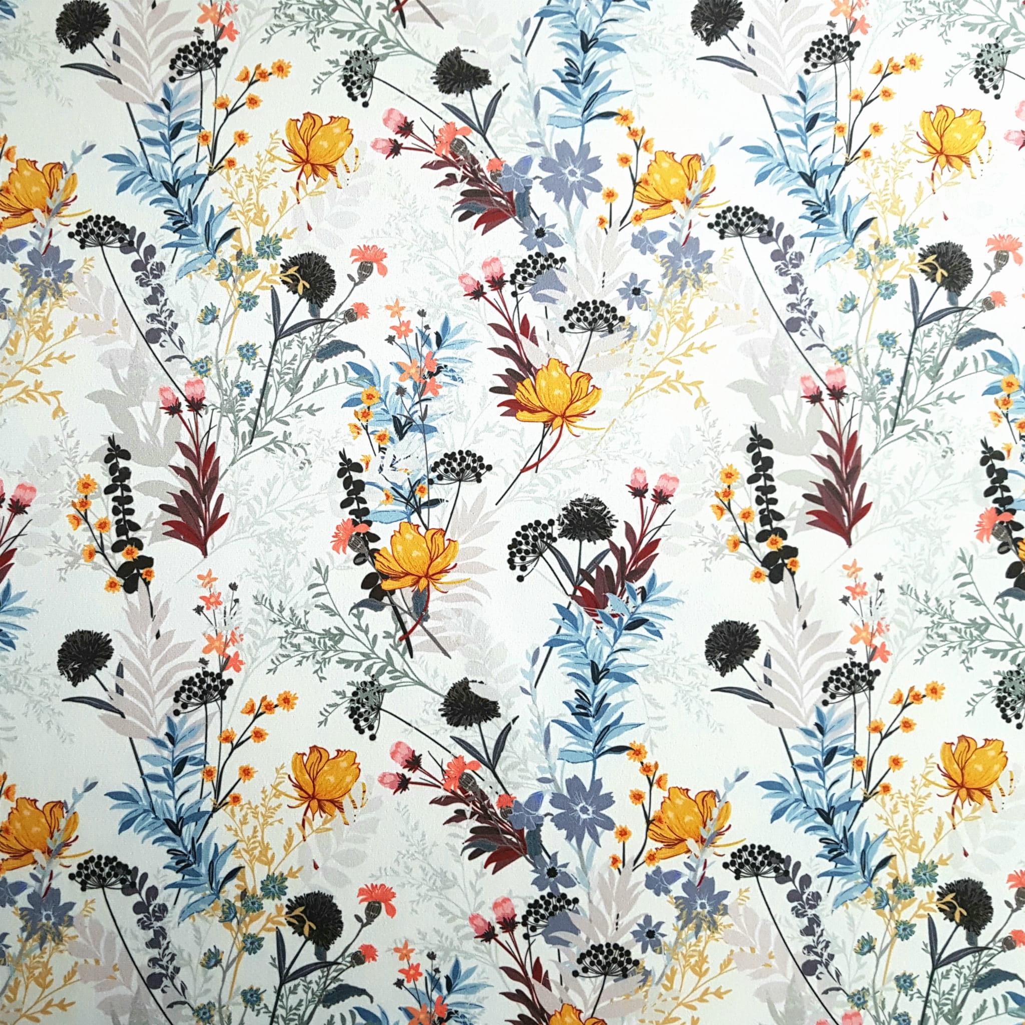 Tkanina tapicerska welur drukowany z pięknym wzorem polnych kwiatów na białym tle.