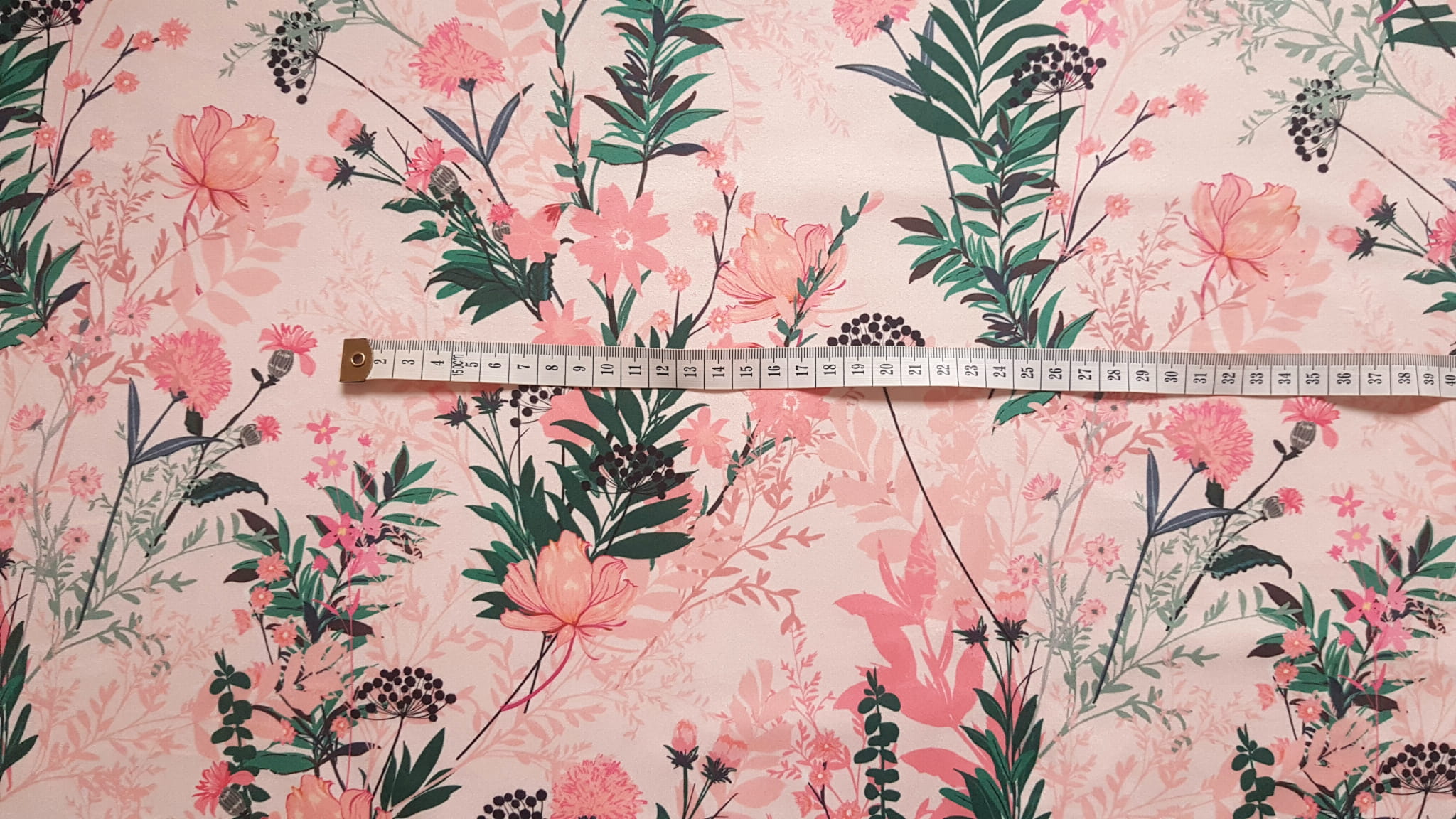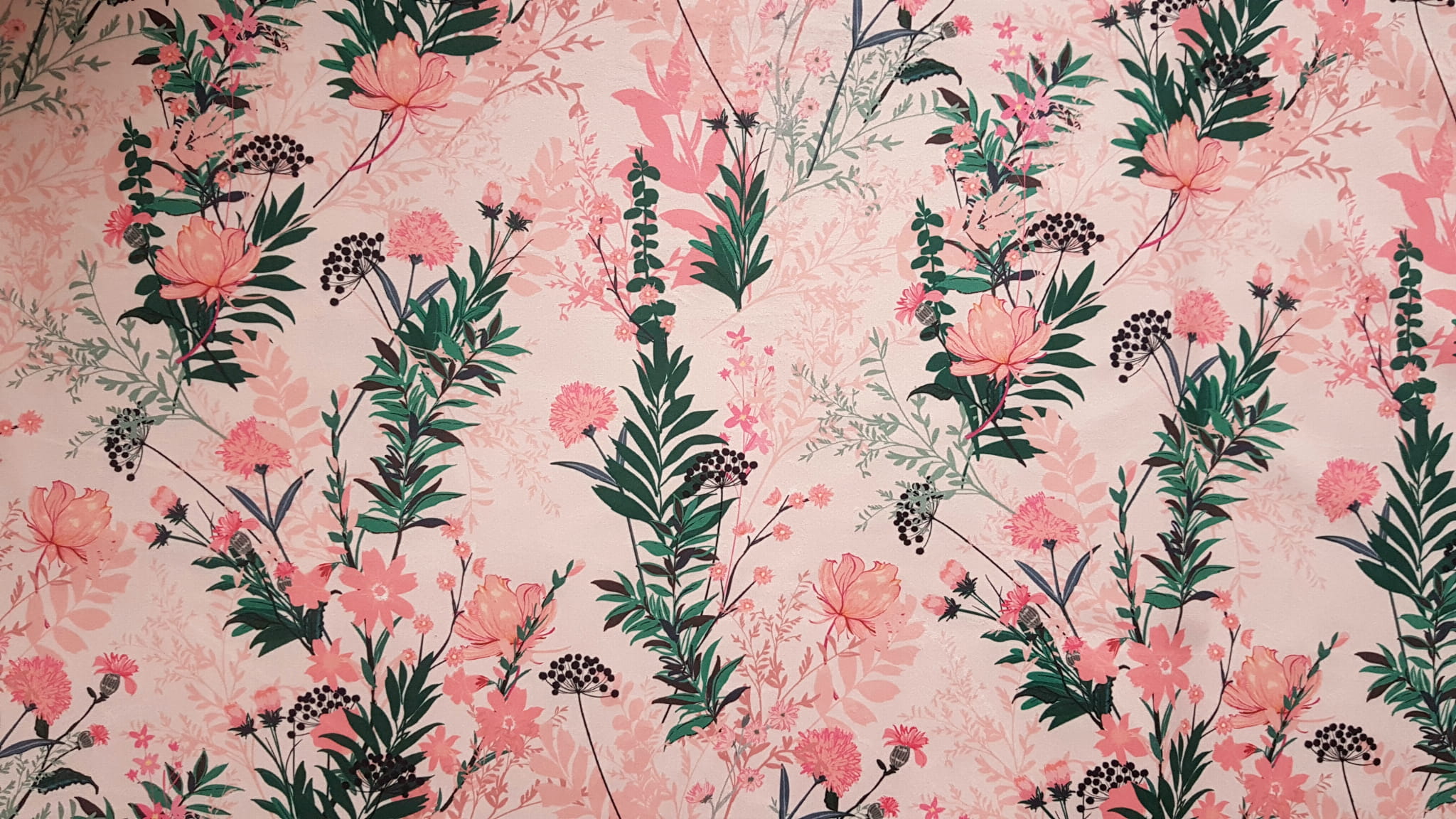 Tkanina tapicerska welur drukowany z pięknym wzorem polnych kwiatów na różowym tle.