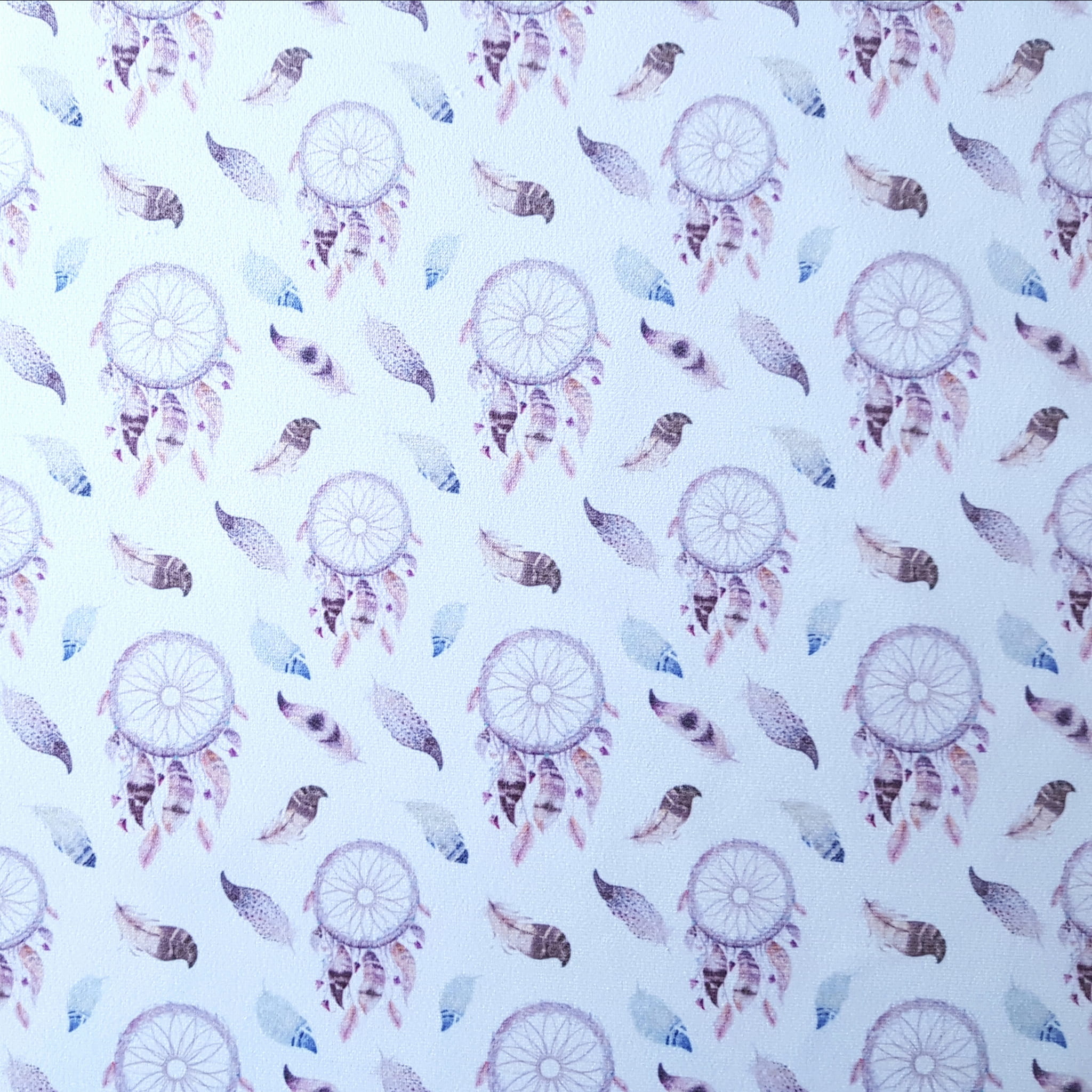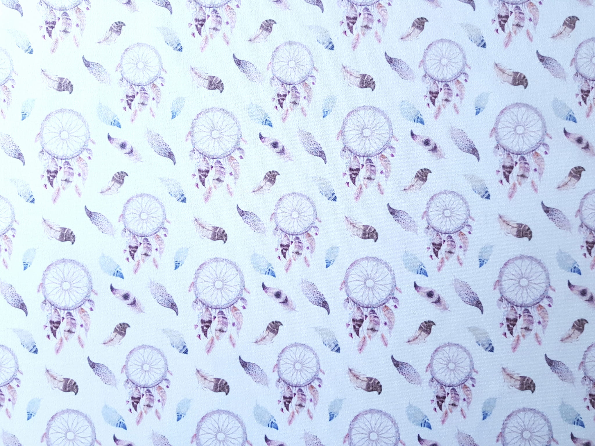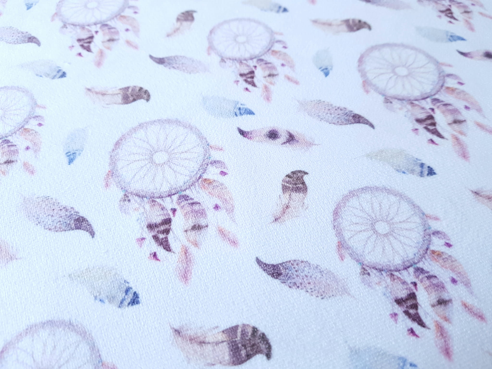 Tkanina tapicerska welur drukowany z przepięknym wzorem łapaczy snów z kolorowymi piórkami.