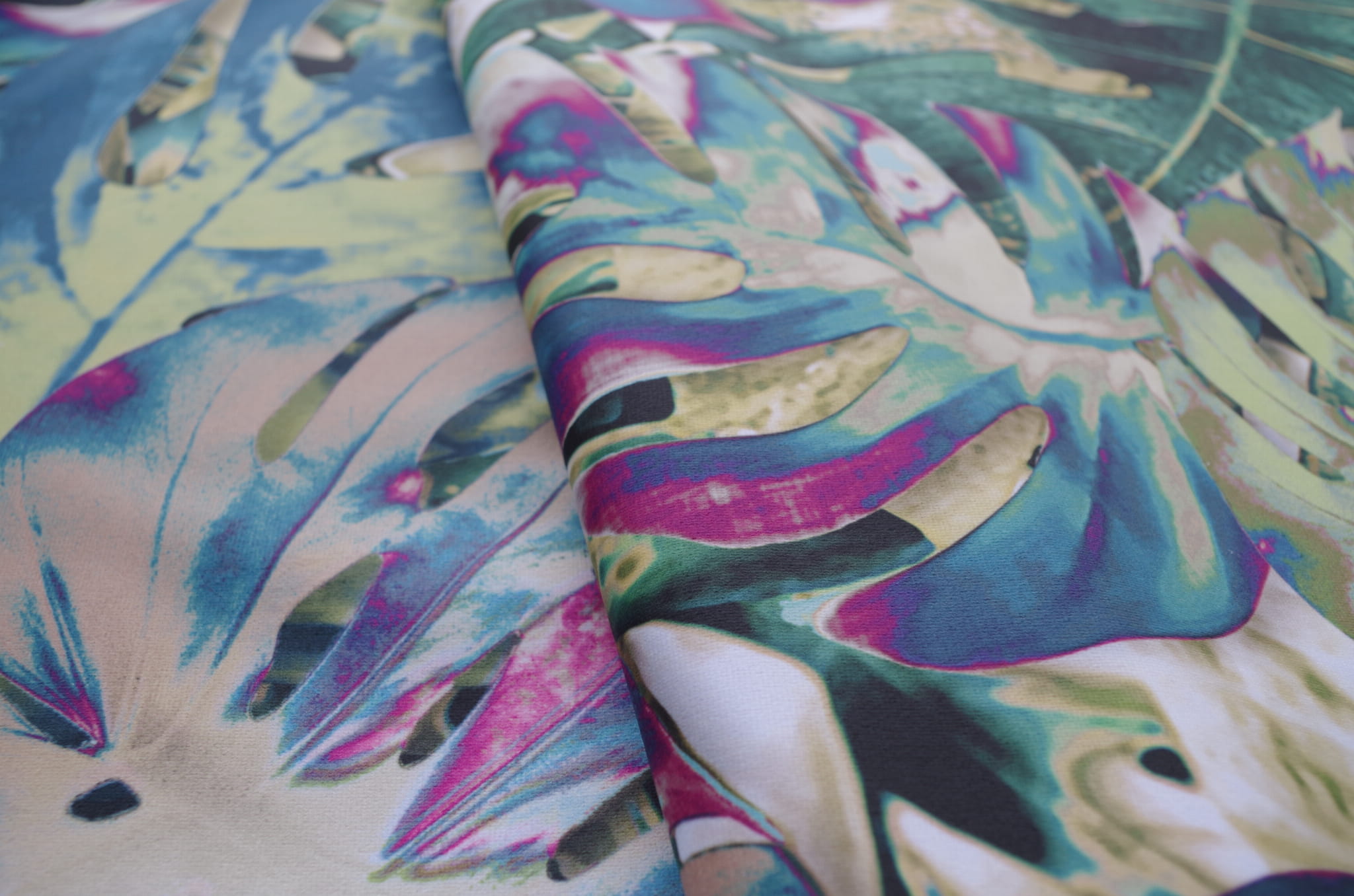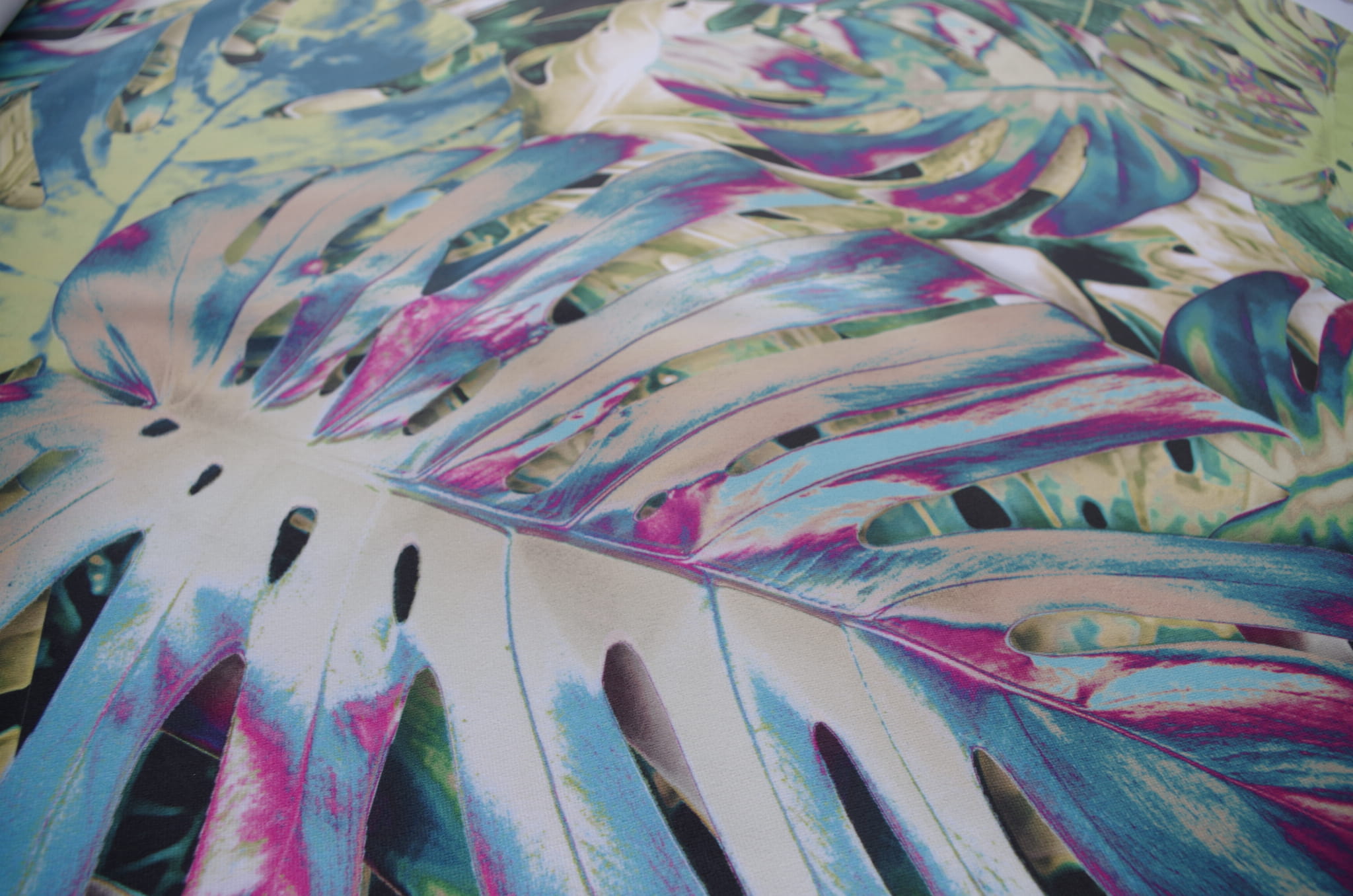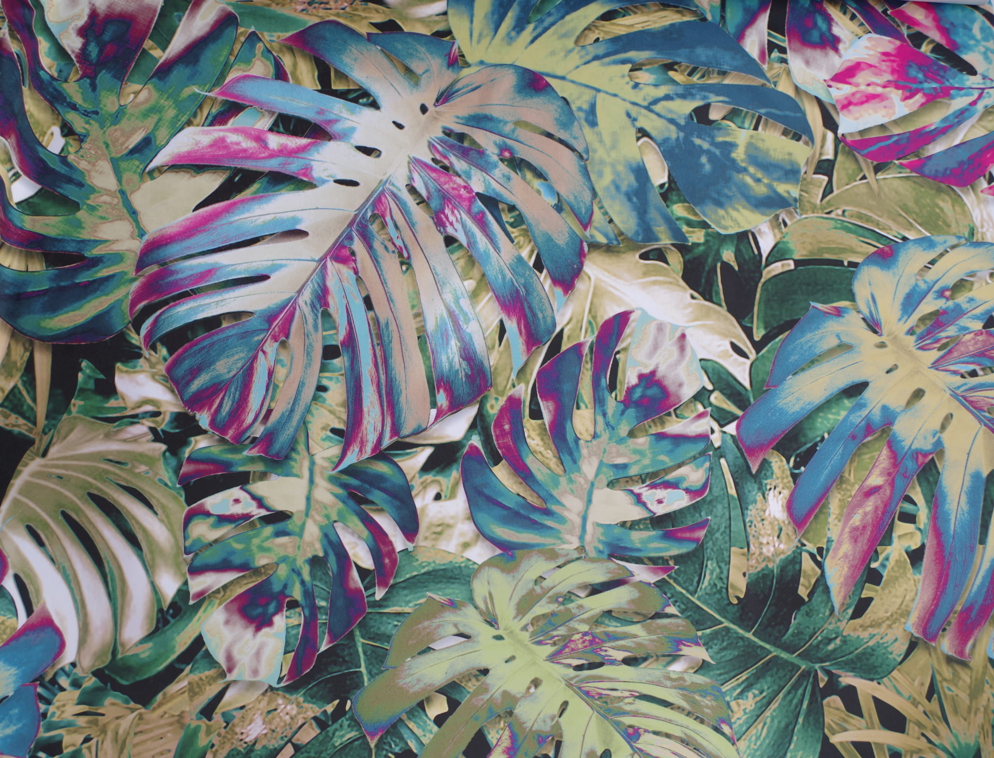 Tkanina tapicerska welur drukowany z nowoczesnym wzorem w klimatach botanicznych w kolorowe liście monstery.