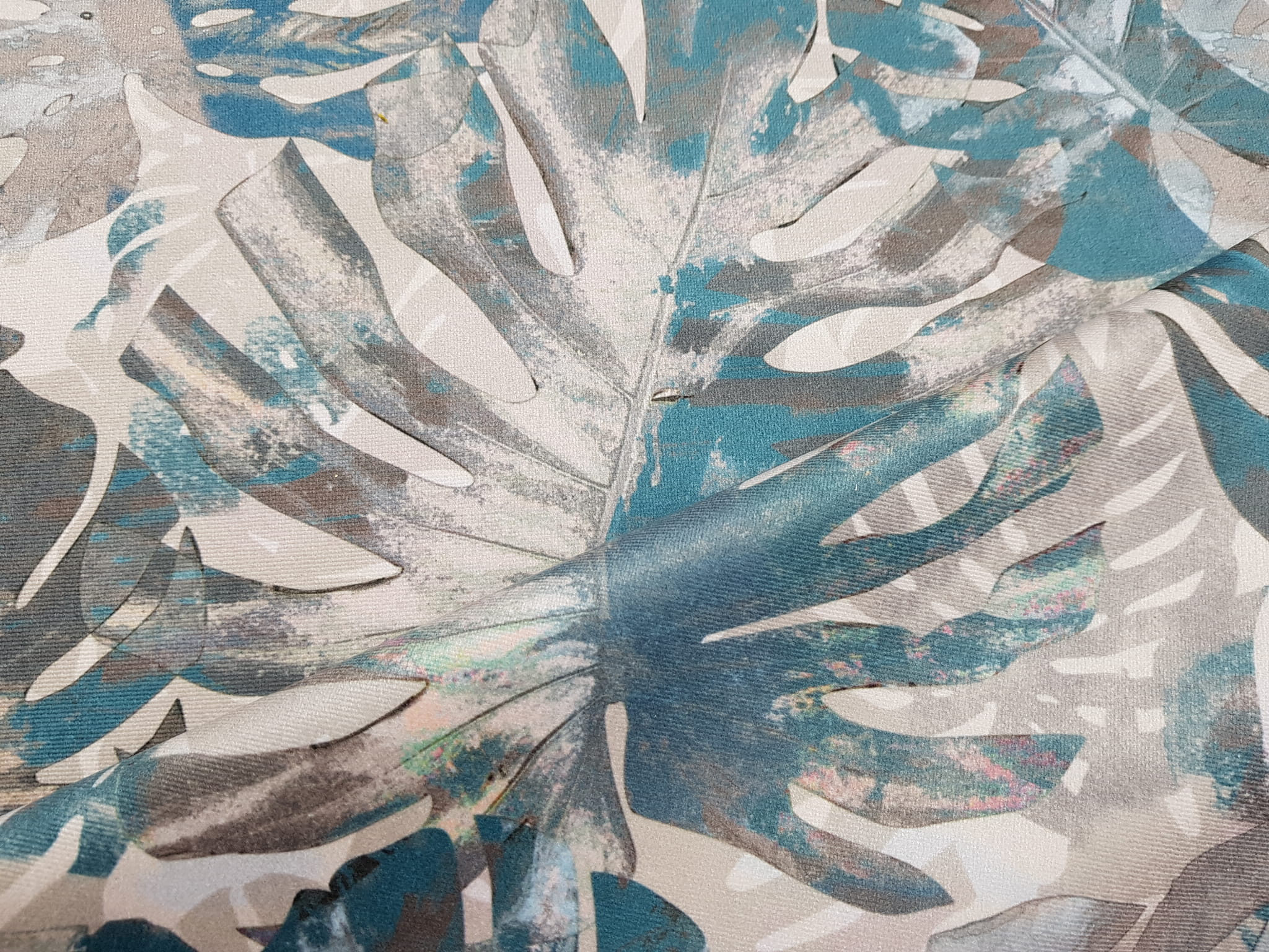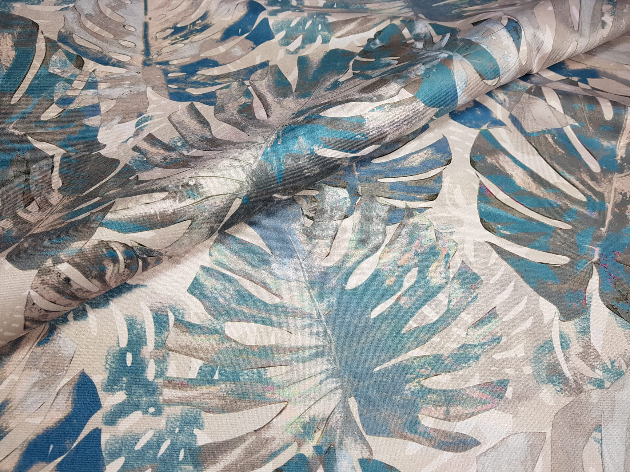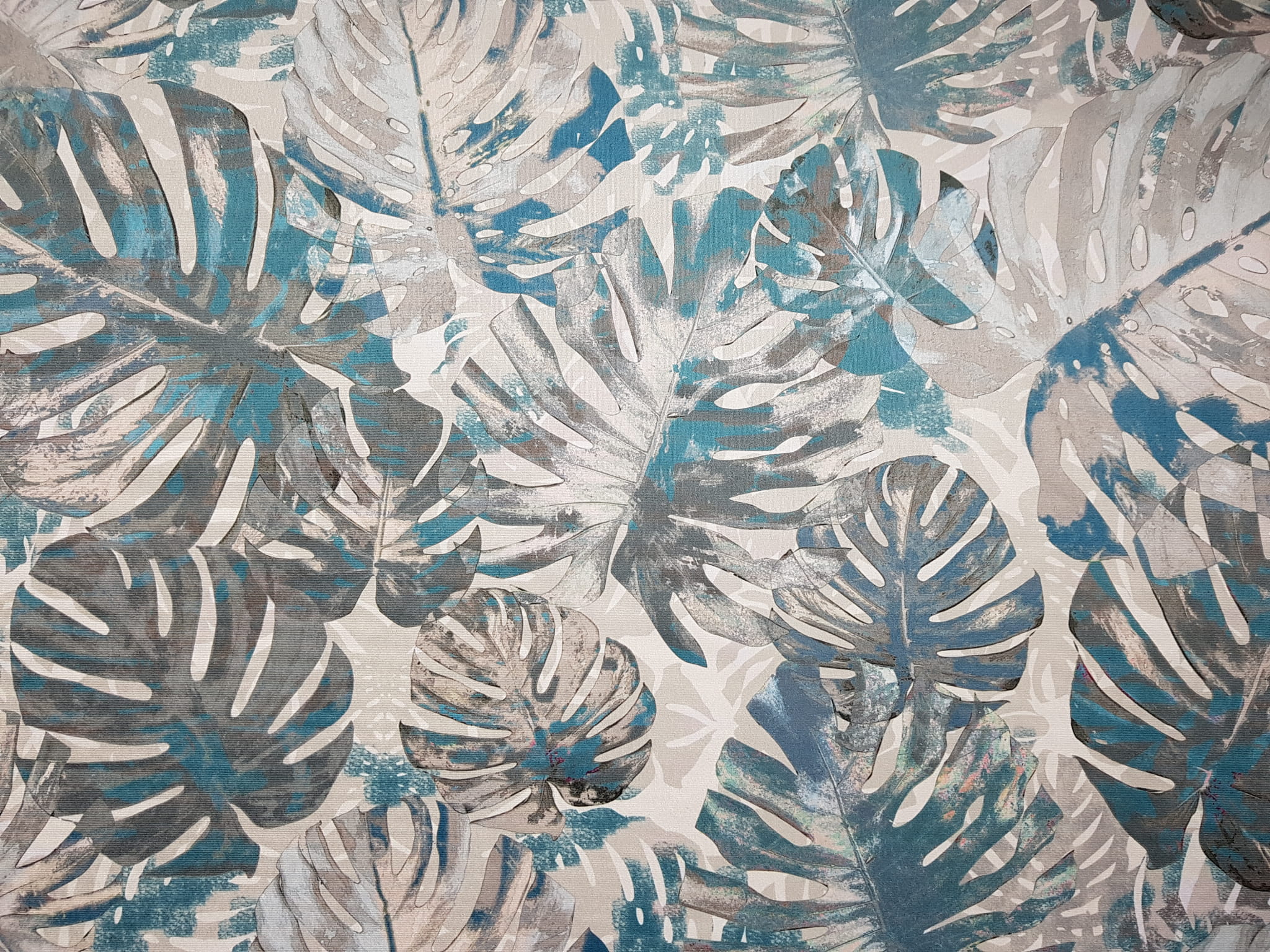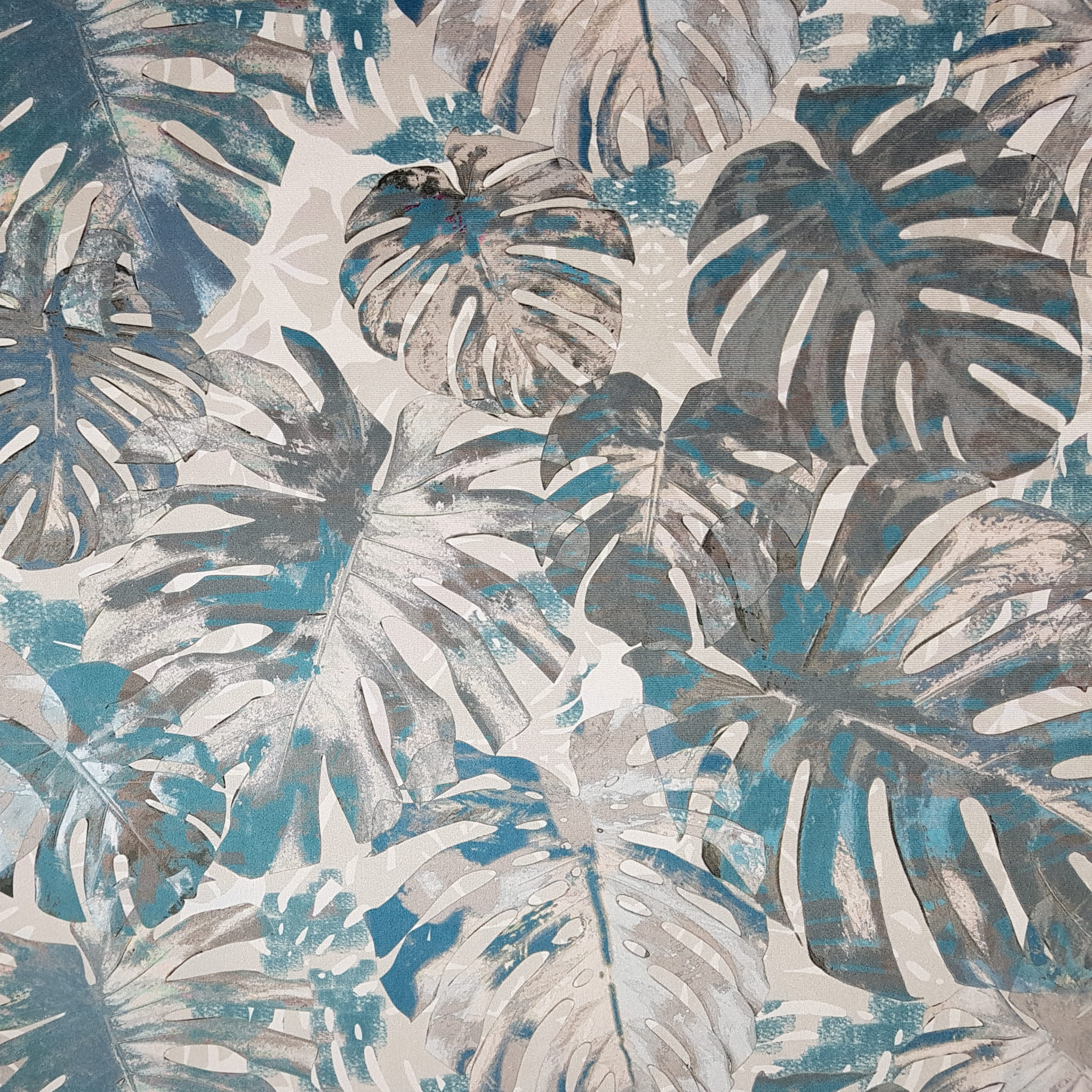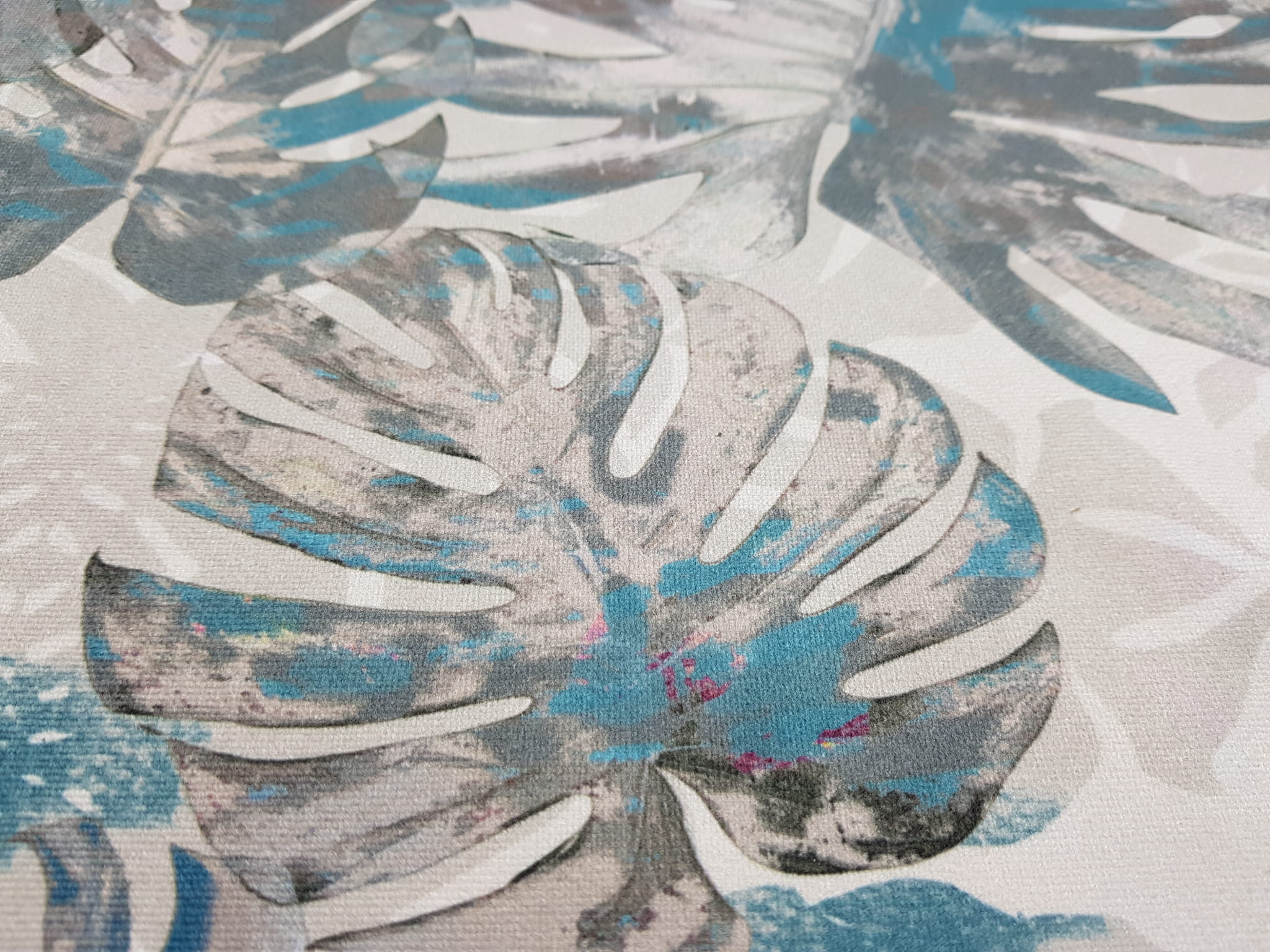 Tkanina tapicerska welur drukowany z nowoczesnym wzorem liści monstery w kolorze turkusowym.