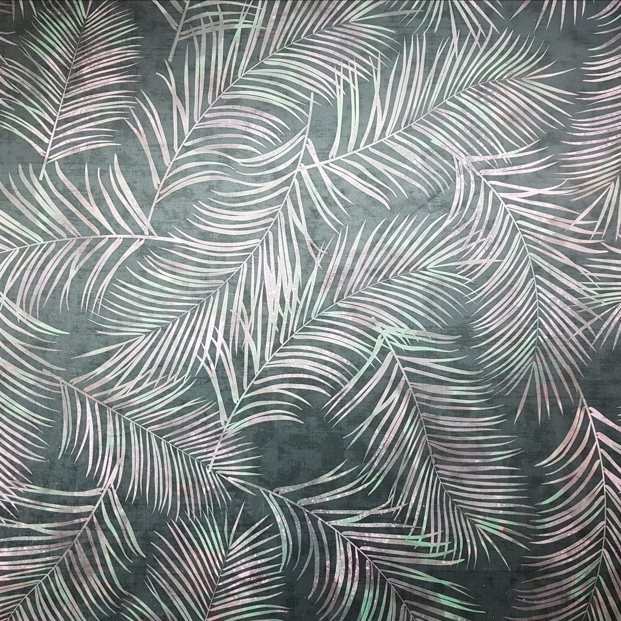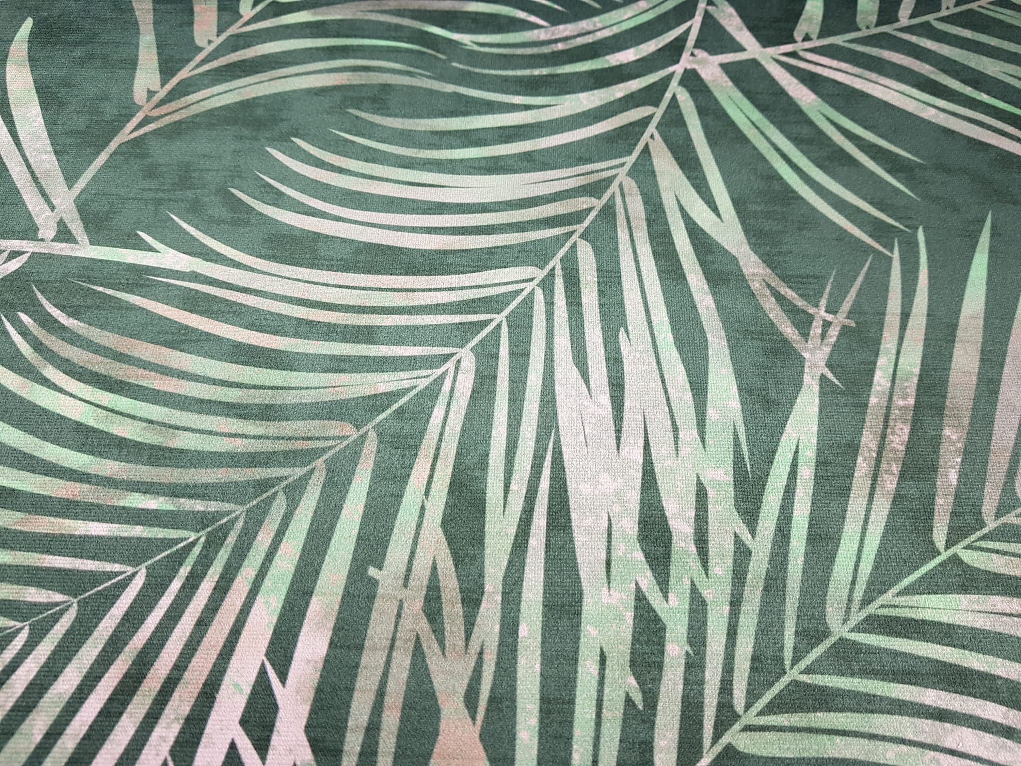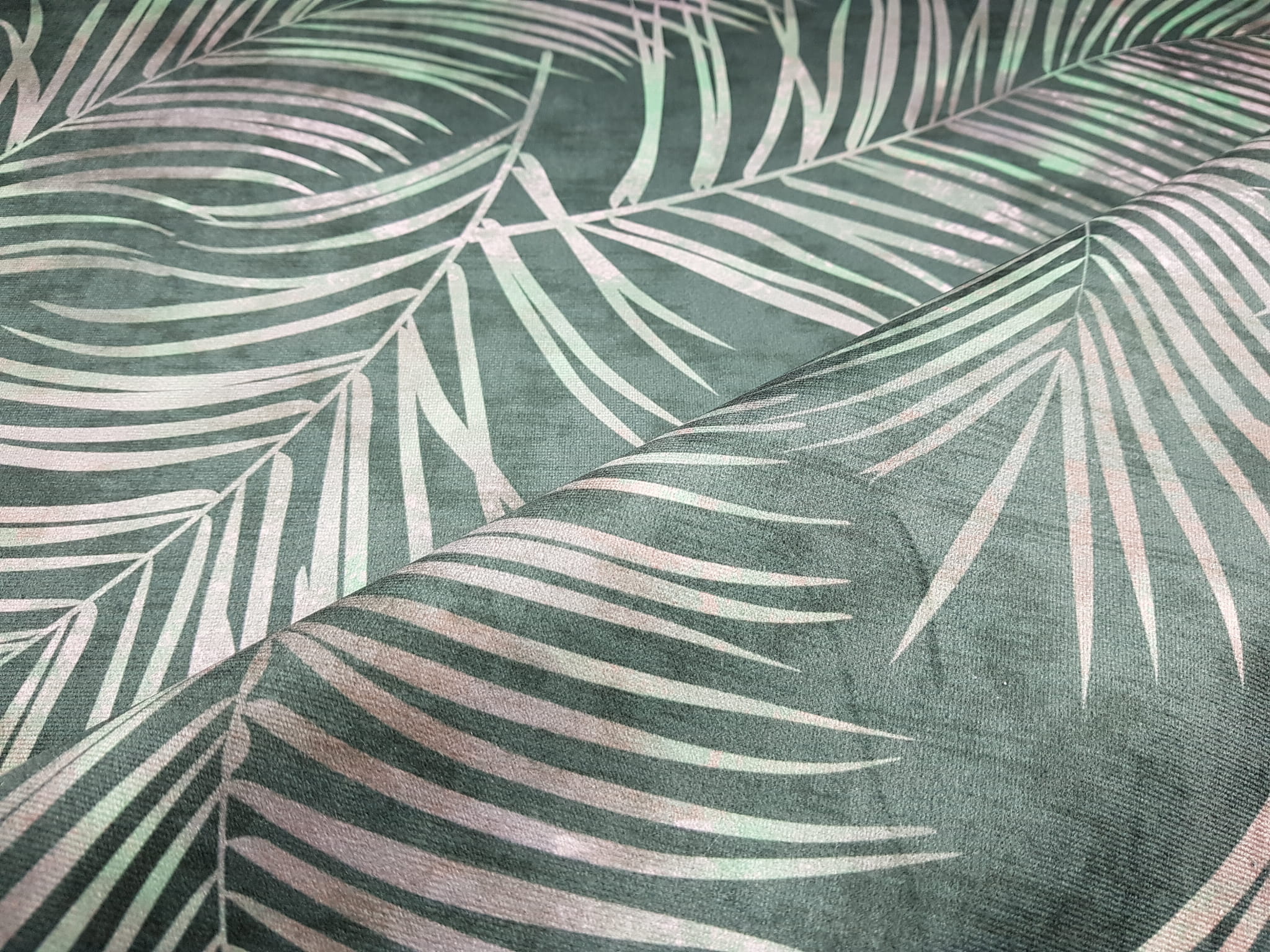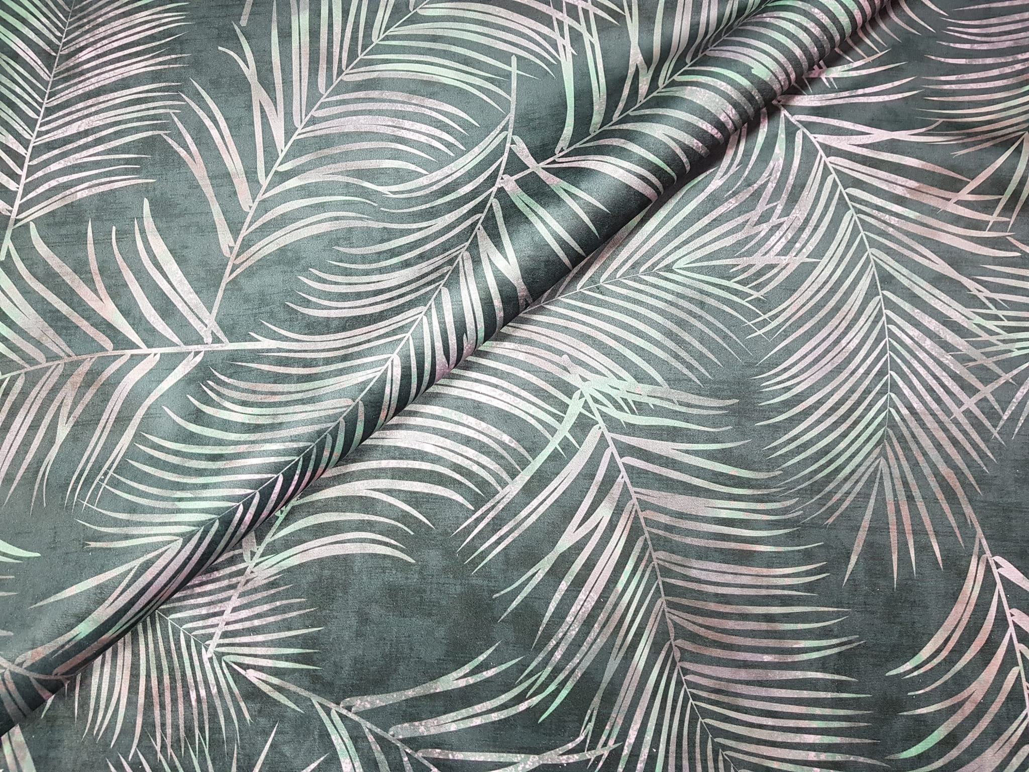 Tkanina tapicerska welur drukowany z nowoczesnym wzorem tropikalnych liści na ciemnozielonym tle.