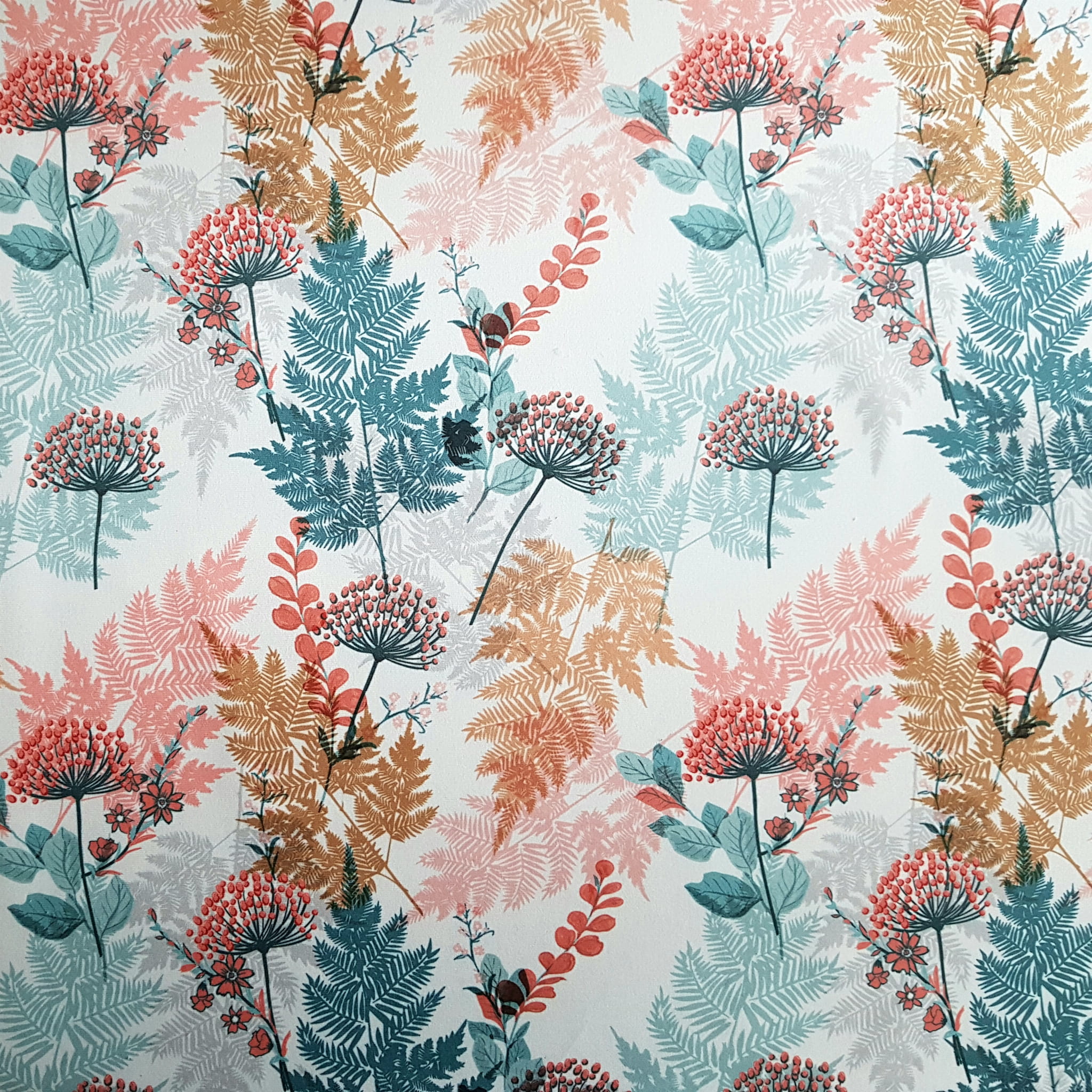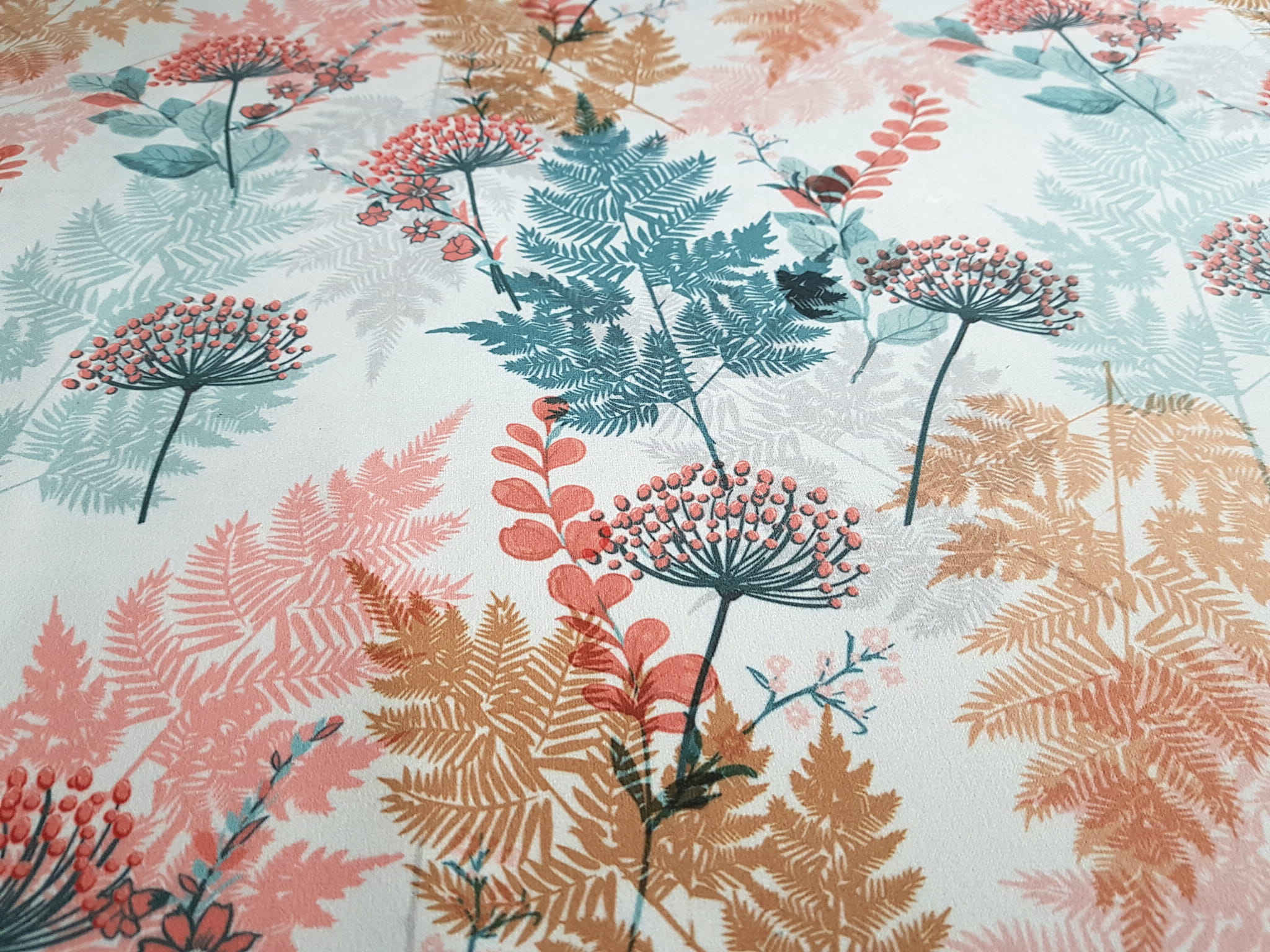 Tkanina tapicerska welur drukowany z pięknym wzorem kolorowych paproci w otoczeniu jarzębiny na białym tle.