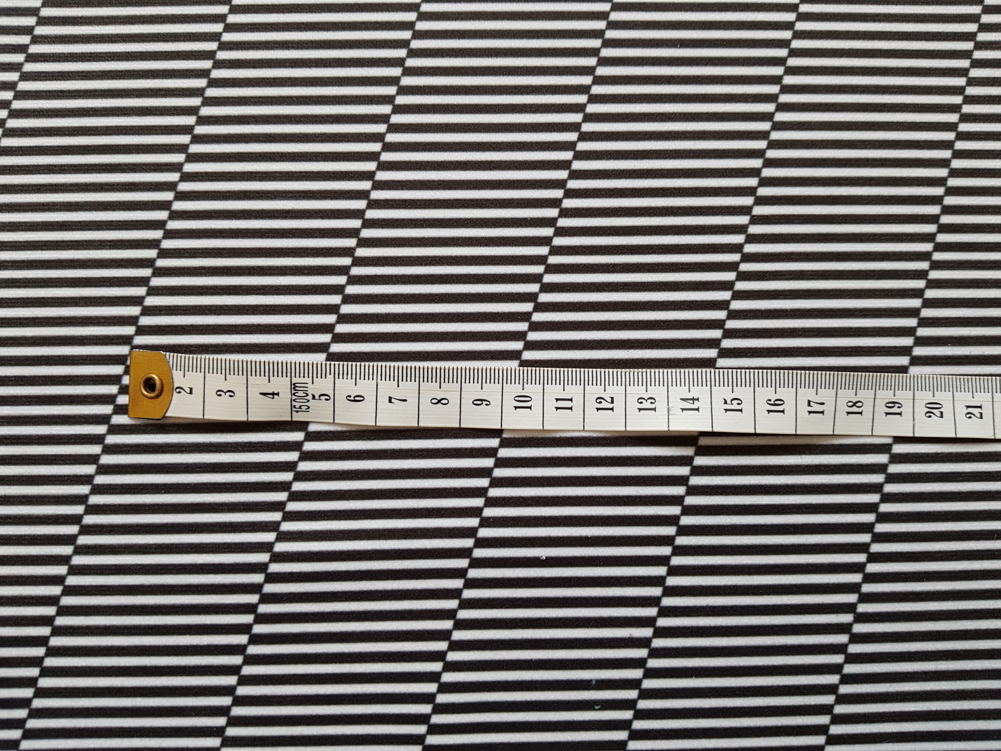Tkanina tapicerska welur drukowany z nowoczesnym wzorem czarno-białych nieregularnych pasków.