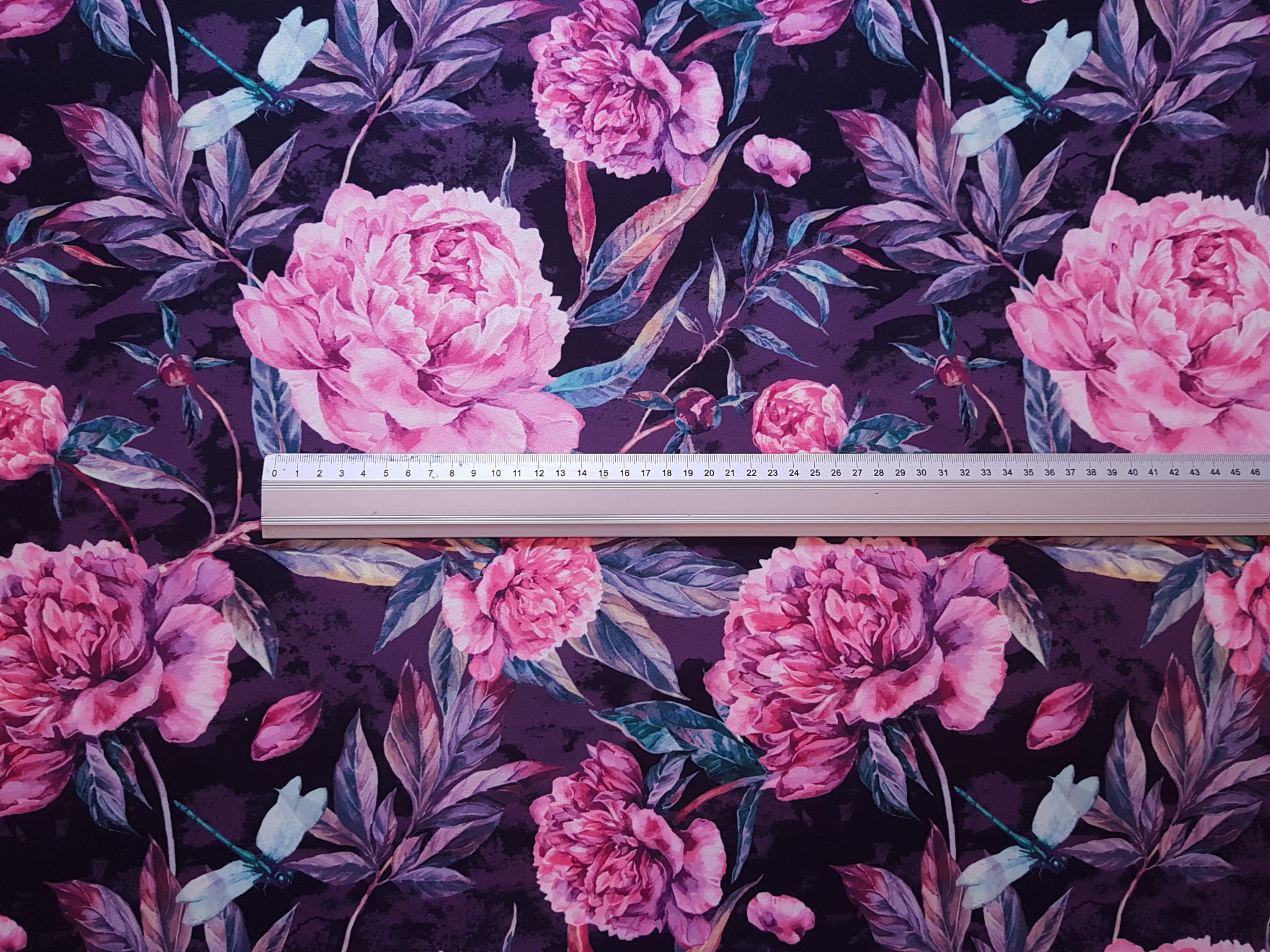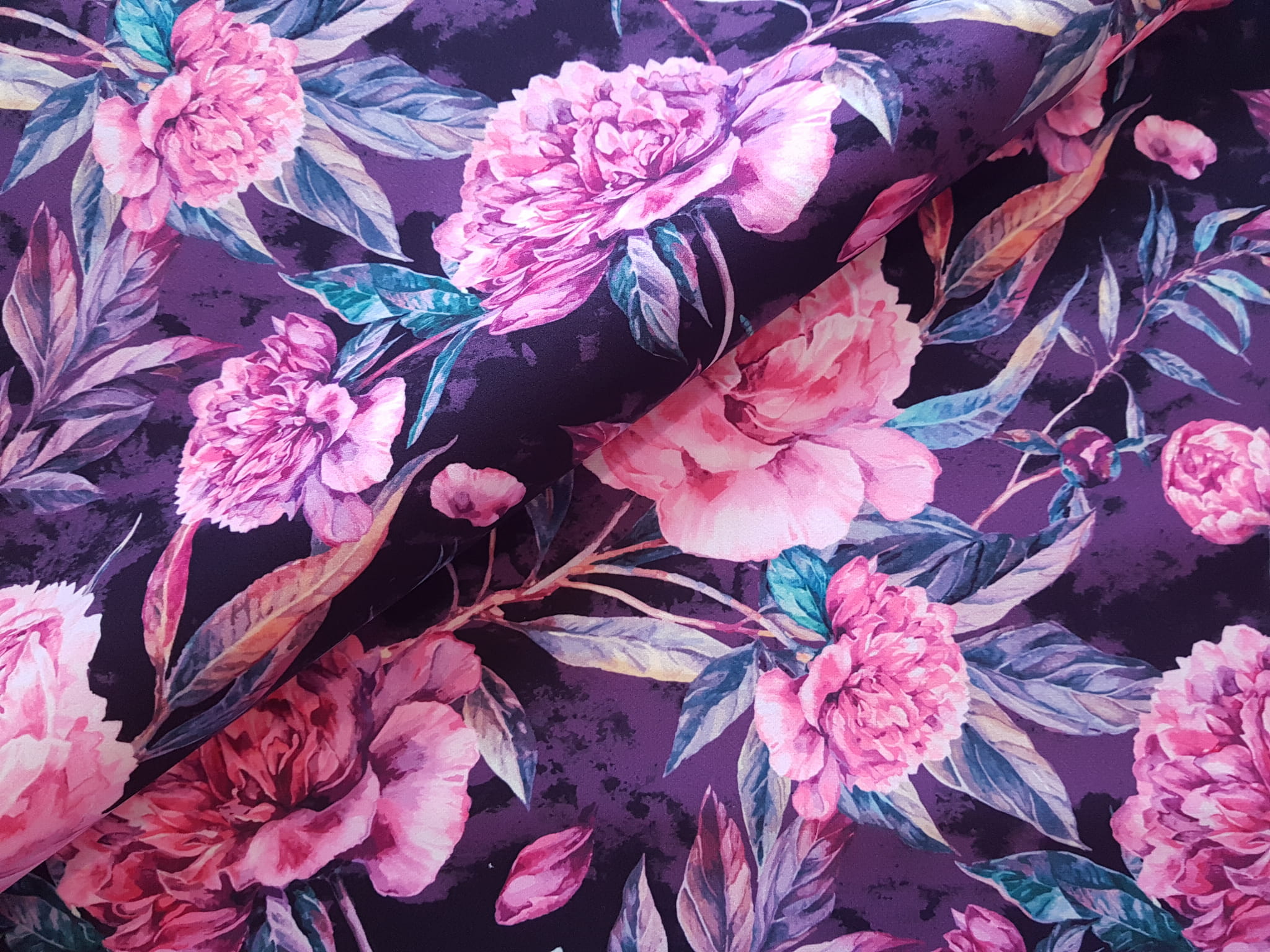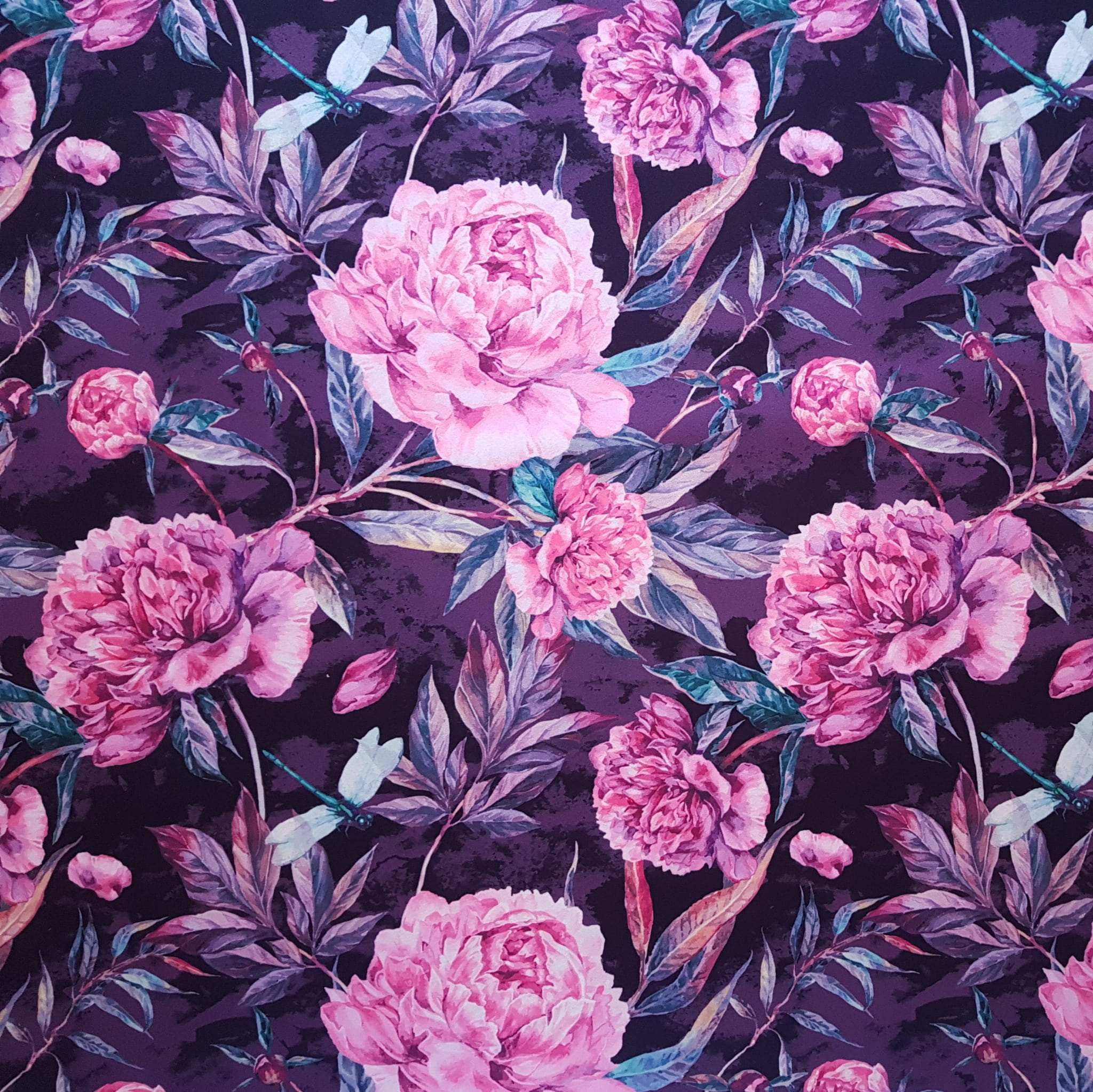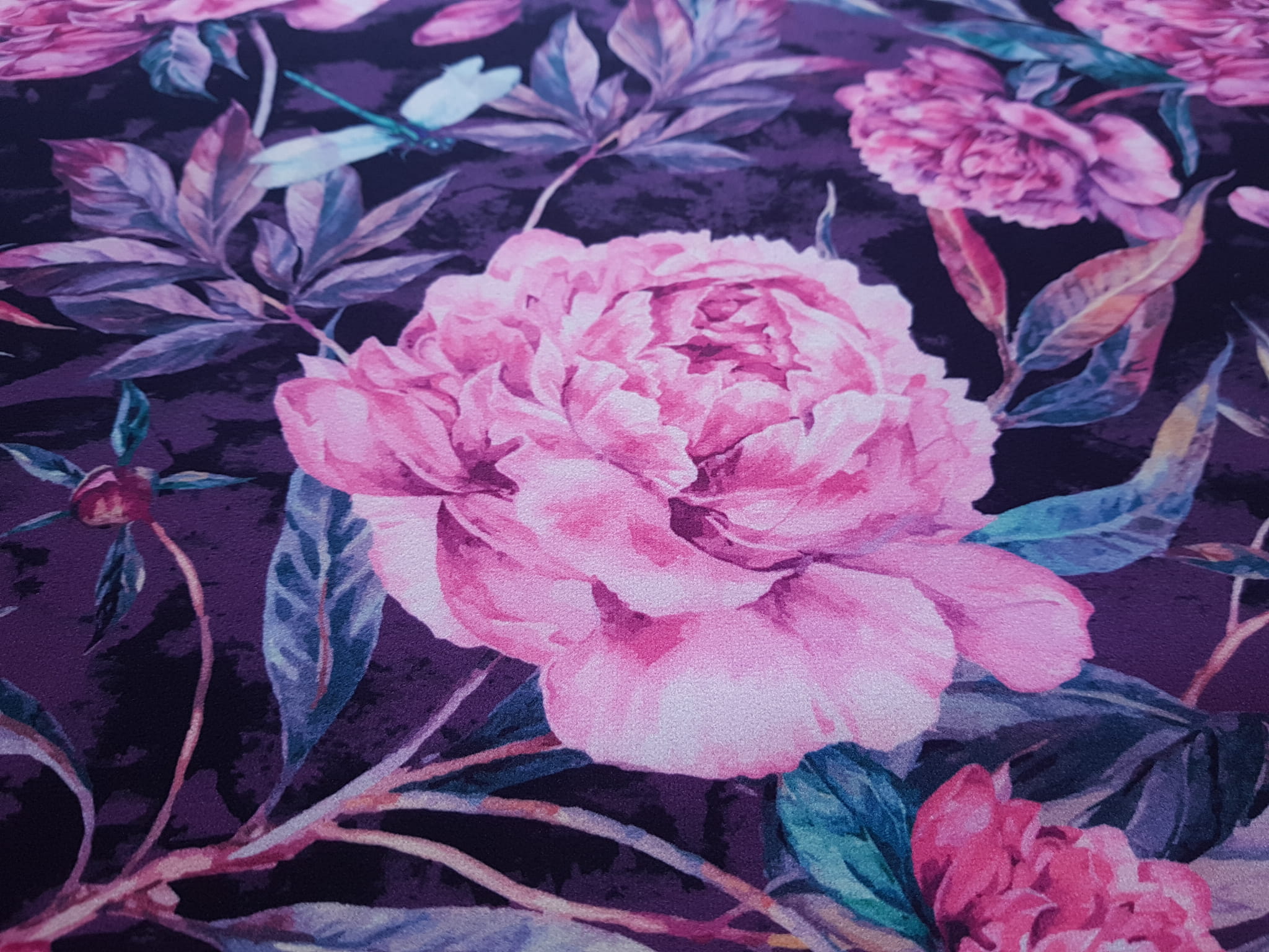 Tkanina tapicerska welur drukowany z pięknym wzorem różowych kwiatów piwonii.
