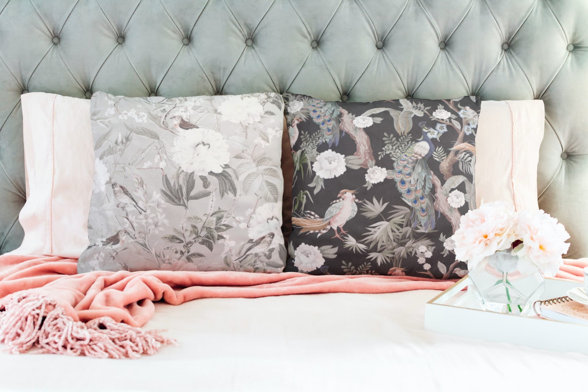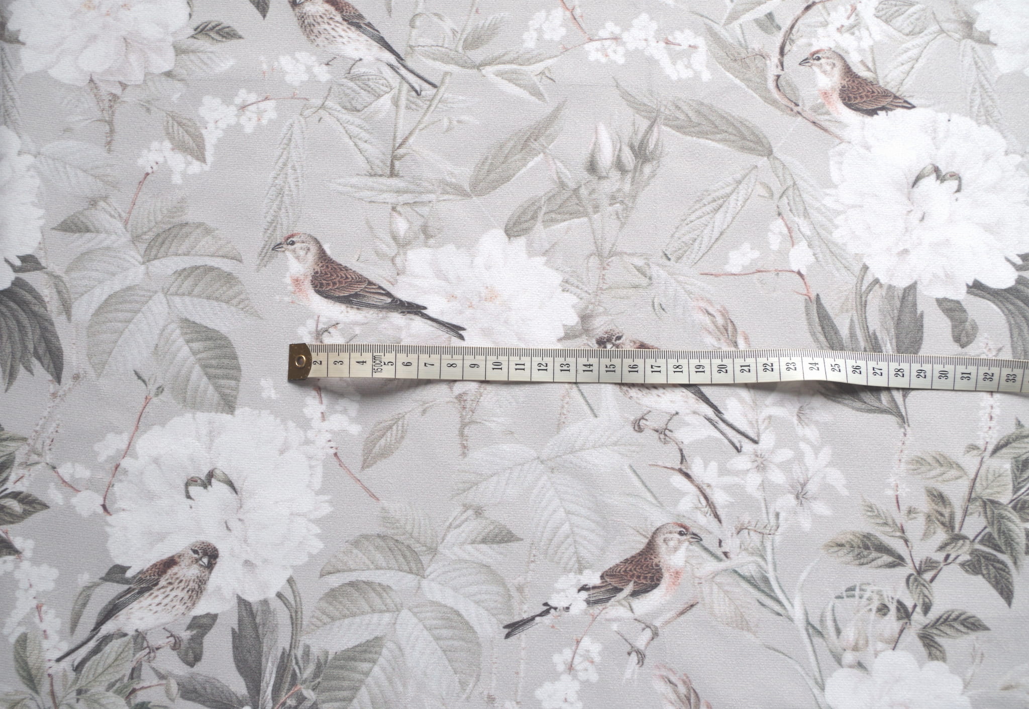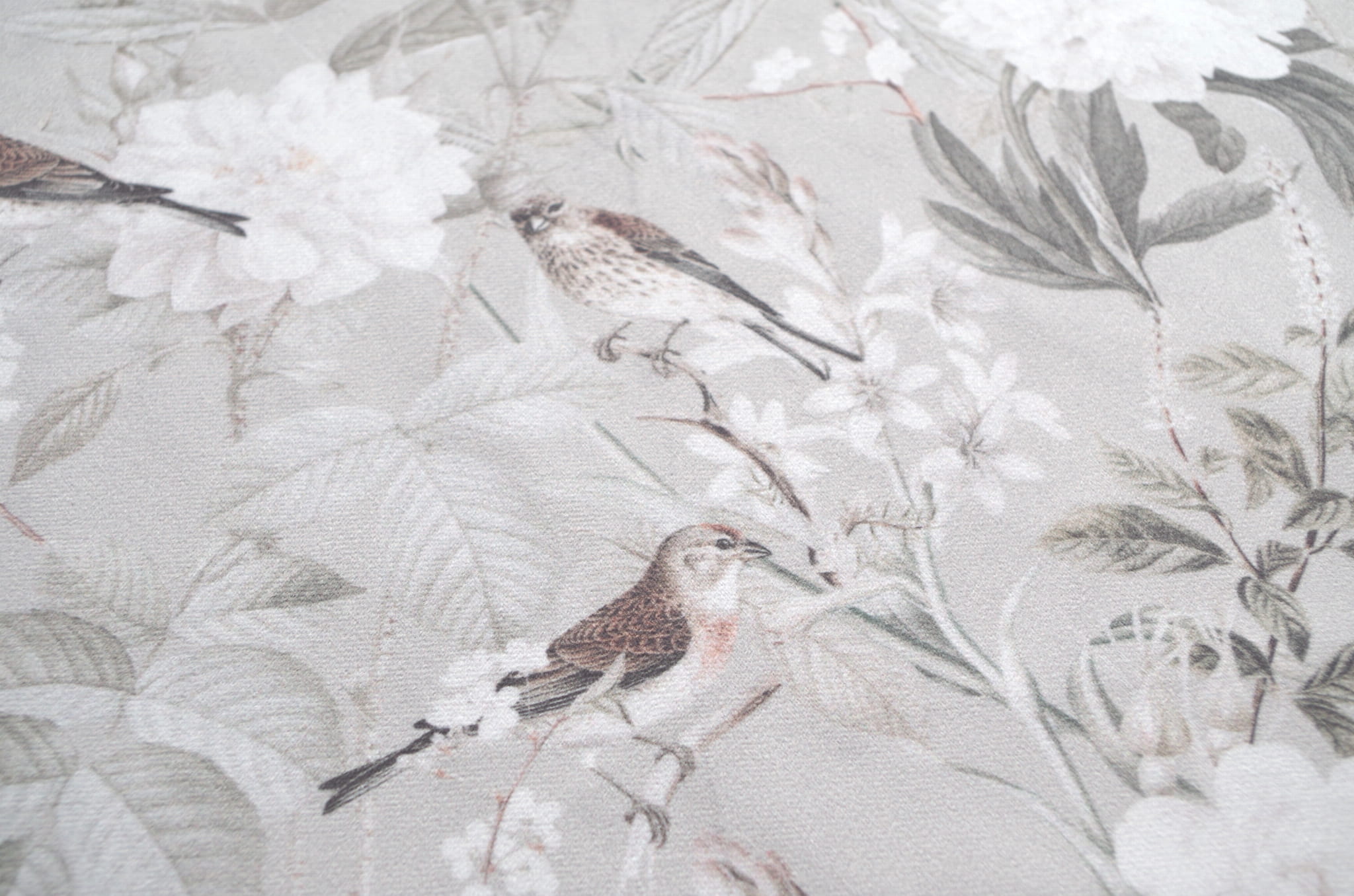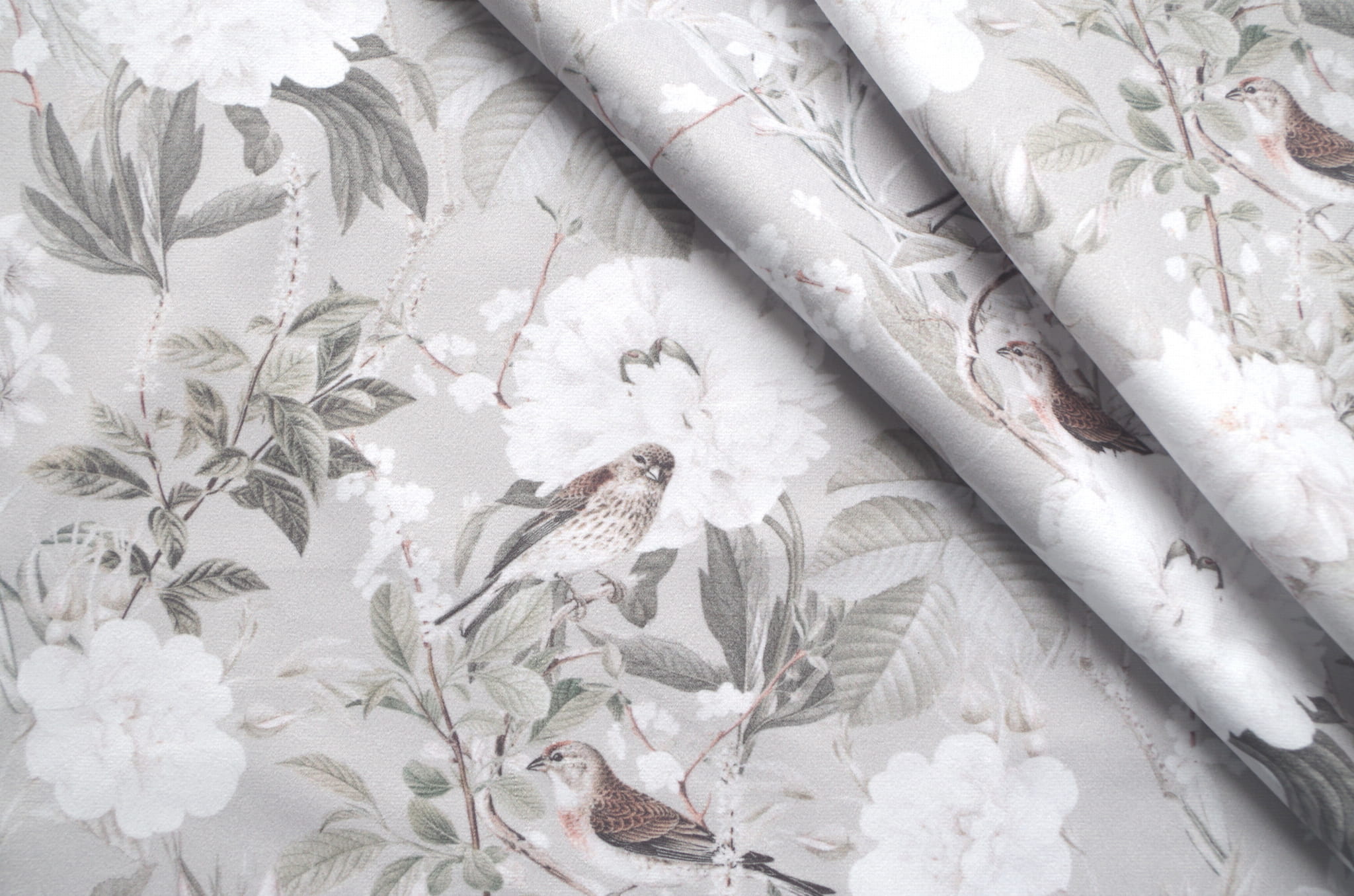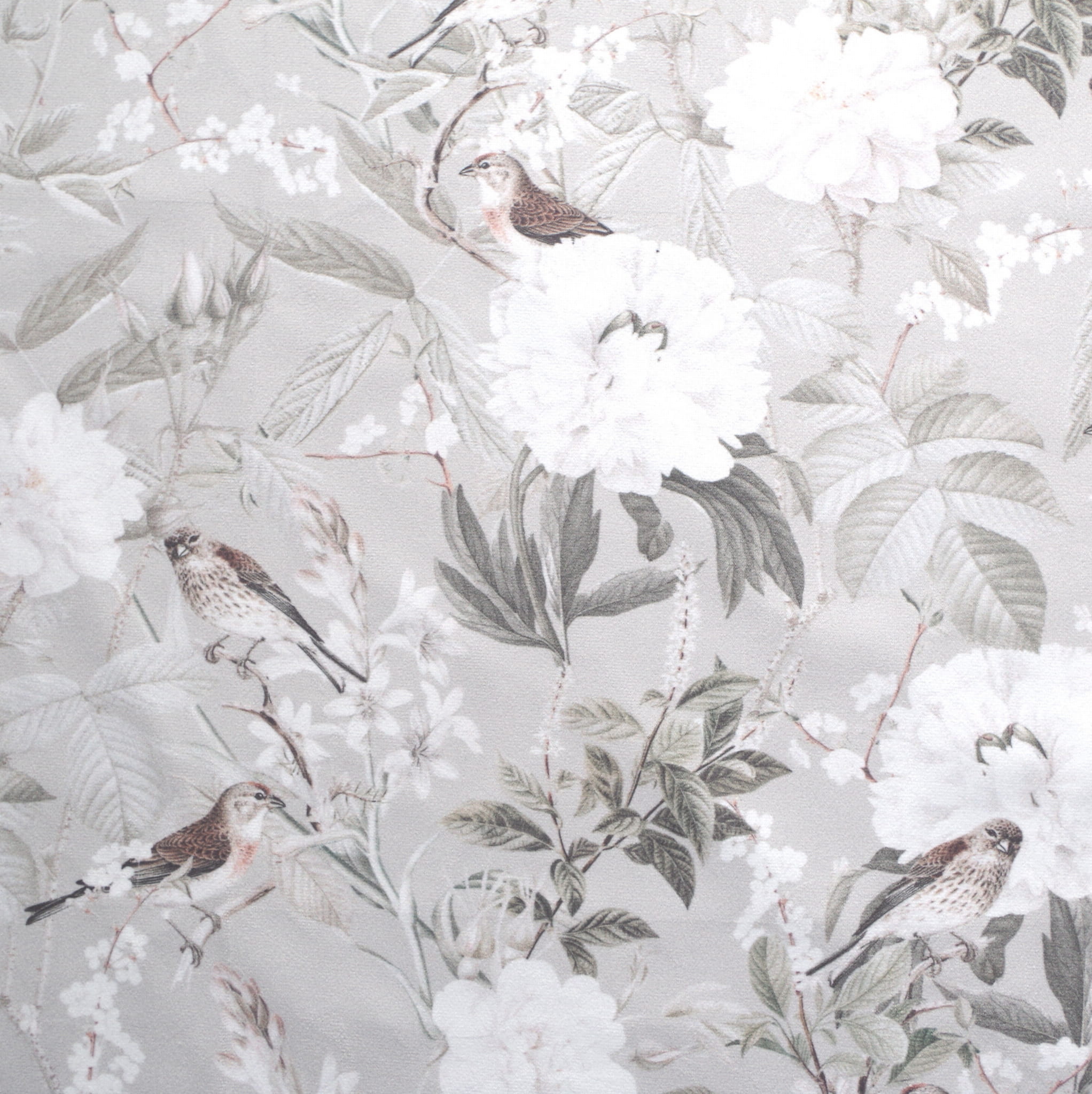 Tkanina tapicerska welur drukowany z pięknym wzorem ptaszków w otoczeniu białych kwiatów na szarym tle.