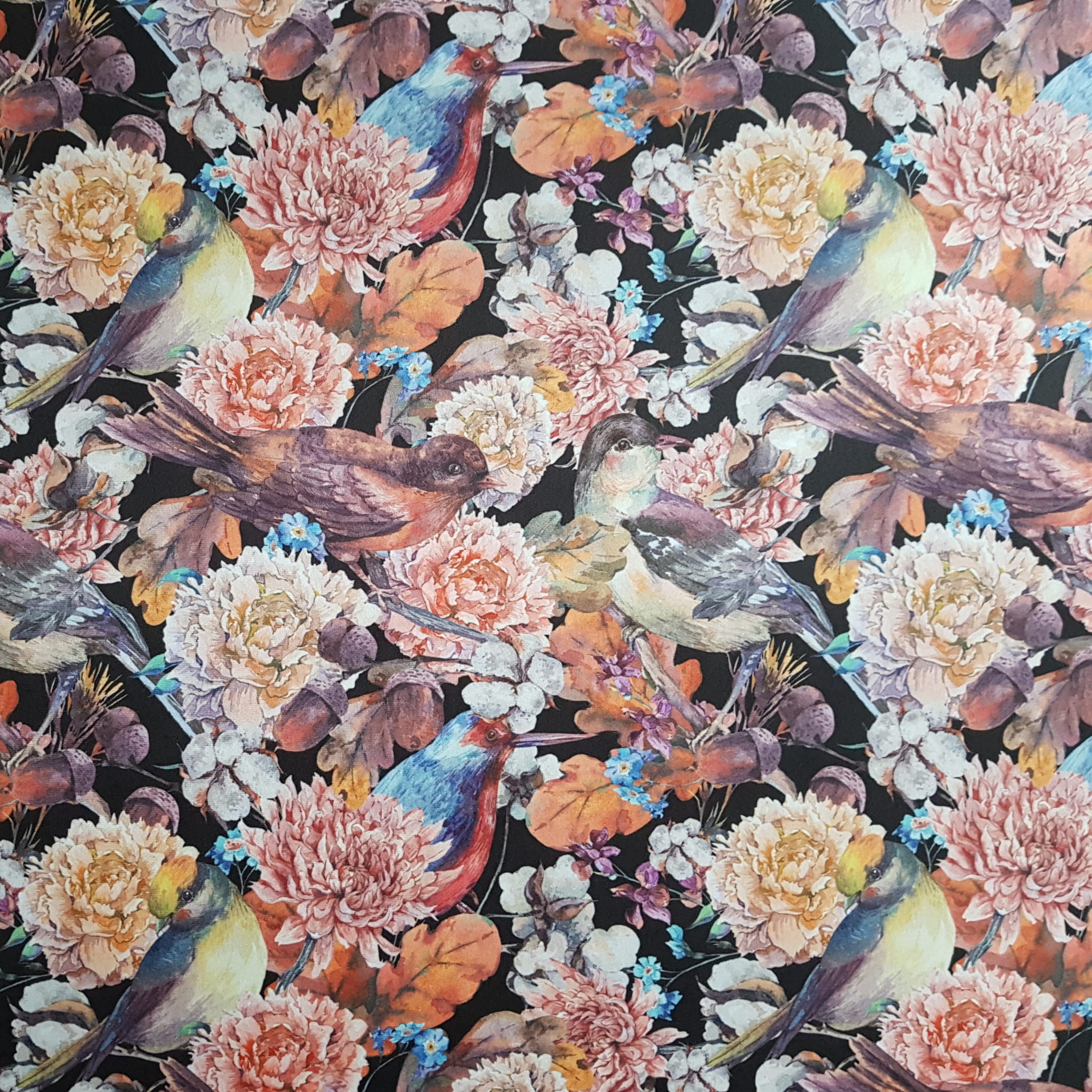 Tkanina tapicerska welur drukowany z pięknym wzorem kolorowych jesiennych kwiatów w otoczeniu ptaszków z elementami czarnego tła.