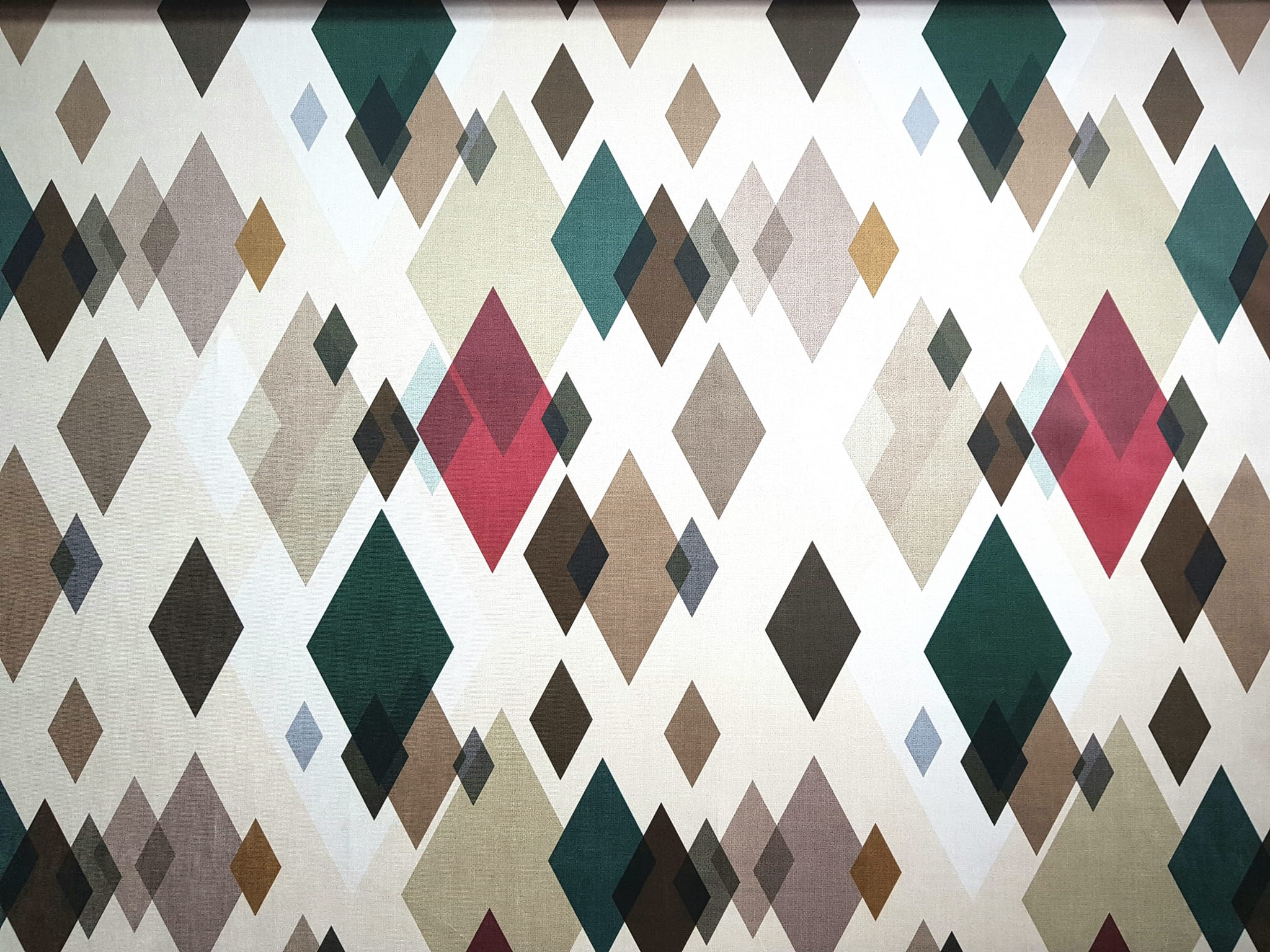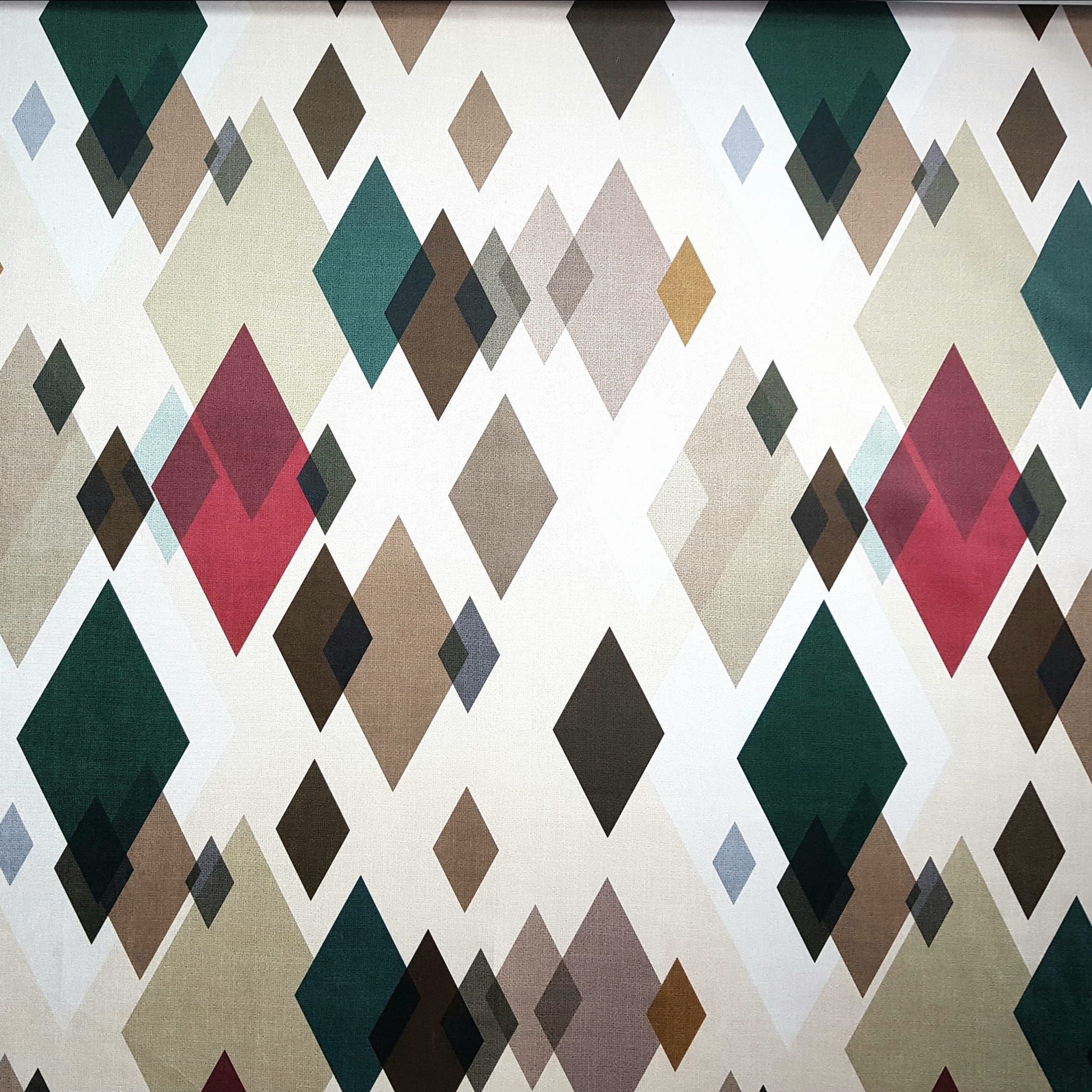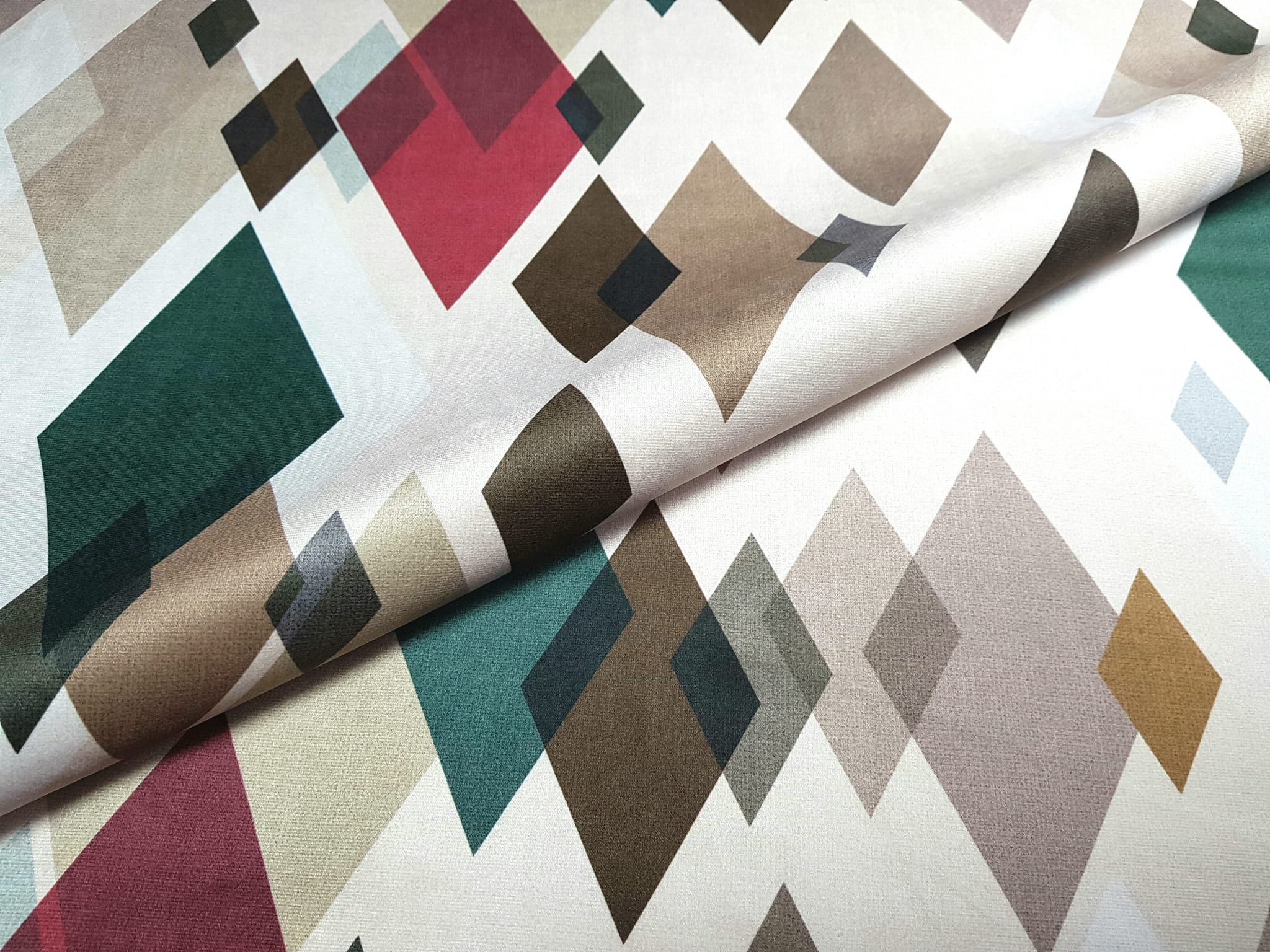 Tkanina tapicerska welur drukowany z nowoczesnym wzorem geometrycznych kolorowych rombów.