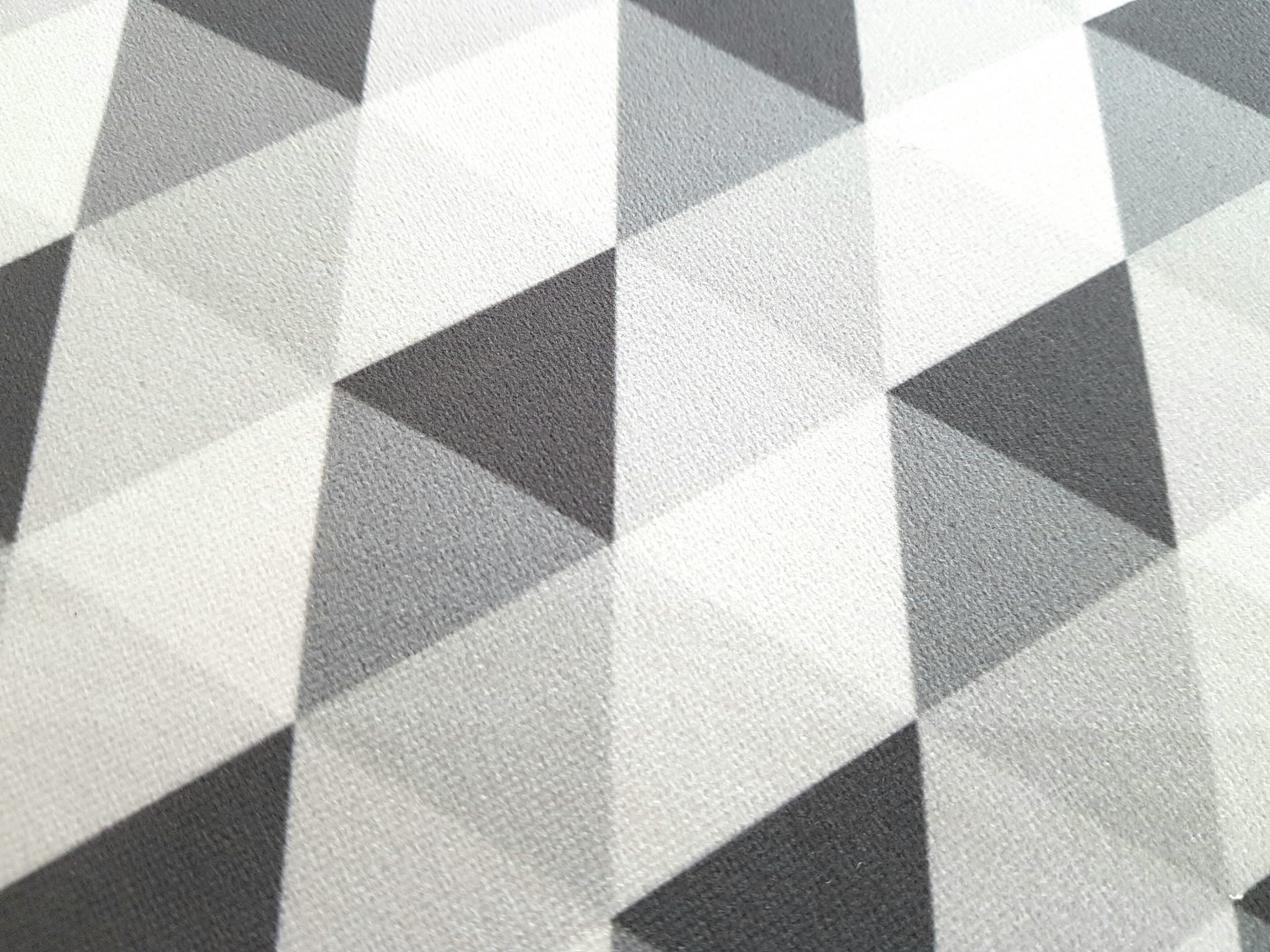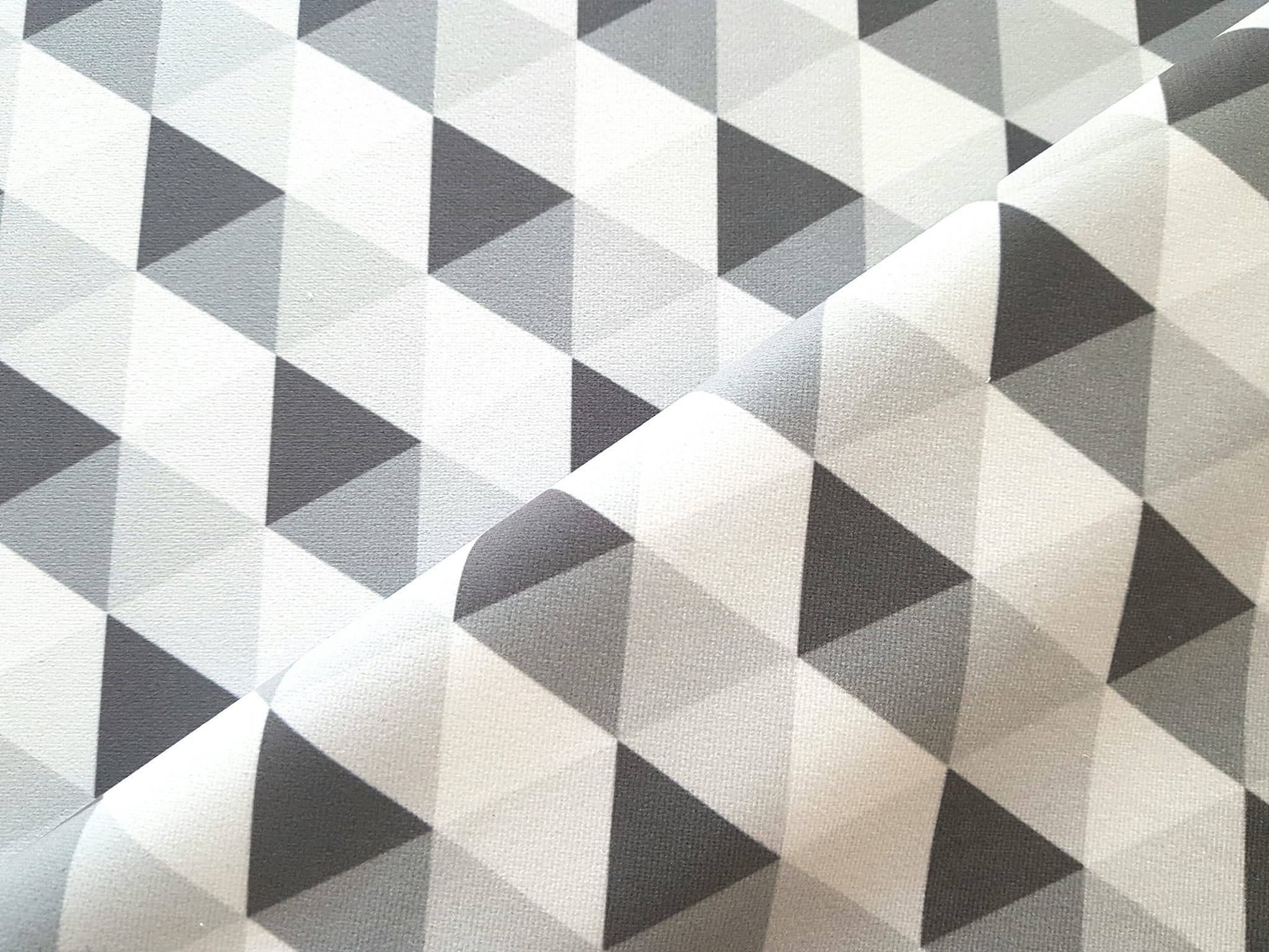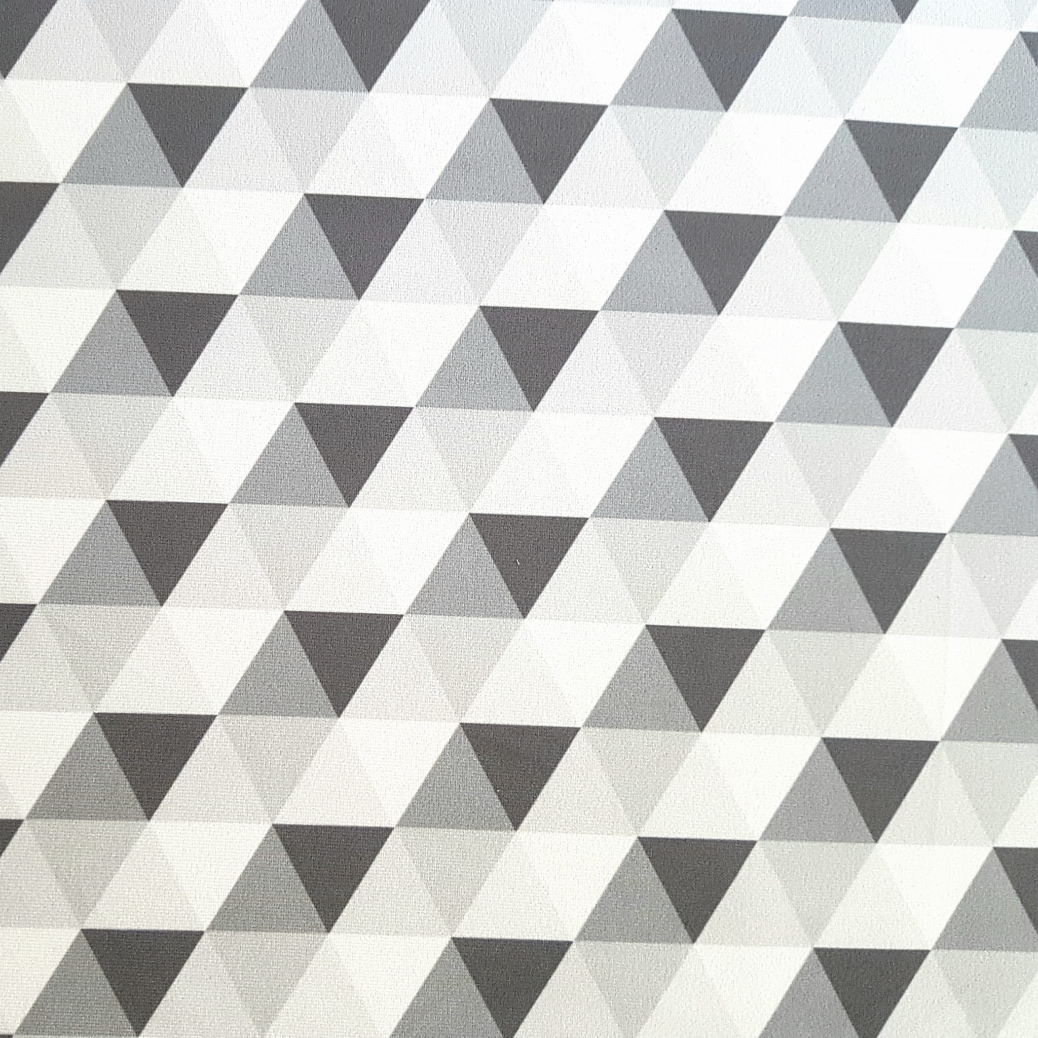 Tkanina tapicerska welur drukowany z geometrycznym wzorem małych trójkątów w odcieniach szarości.