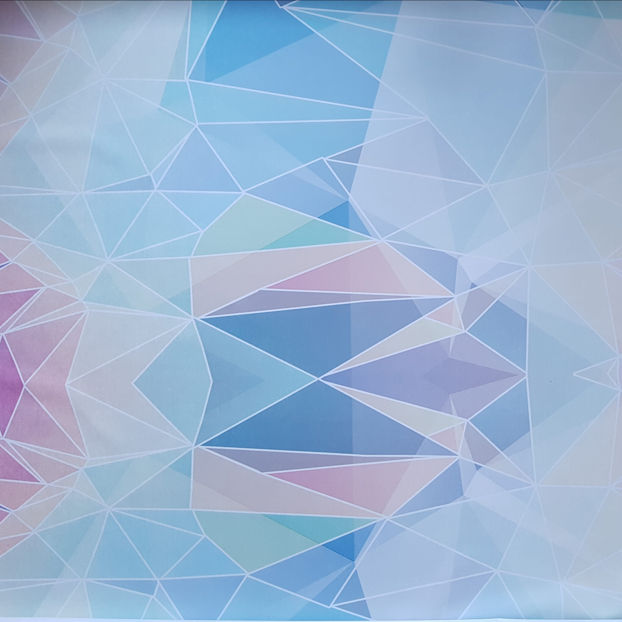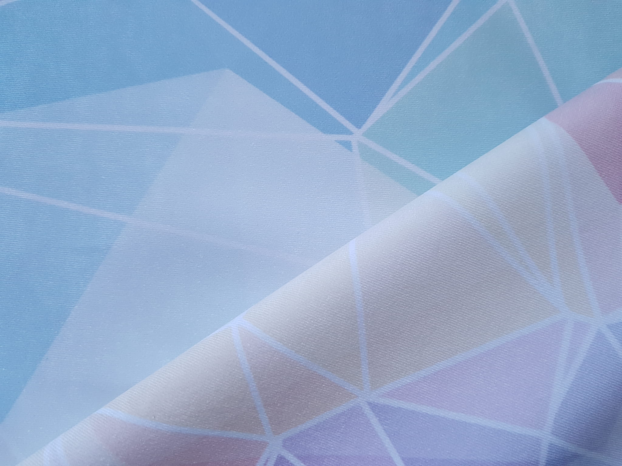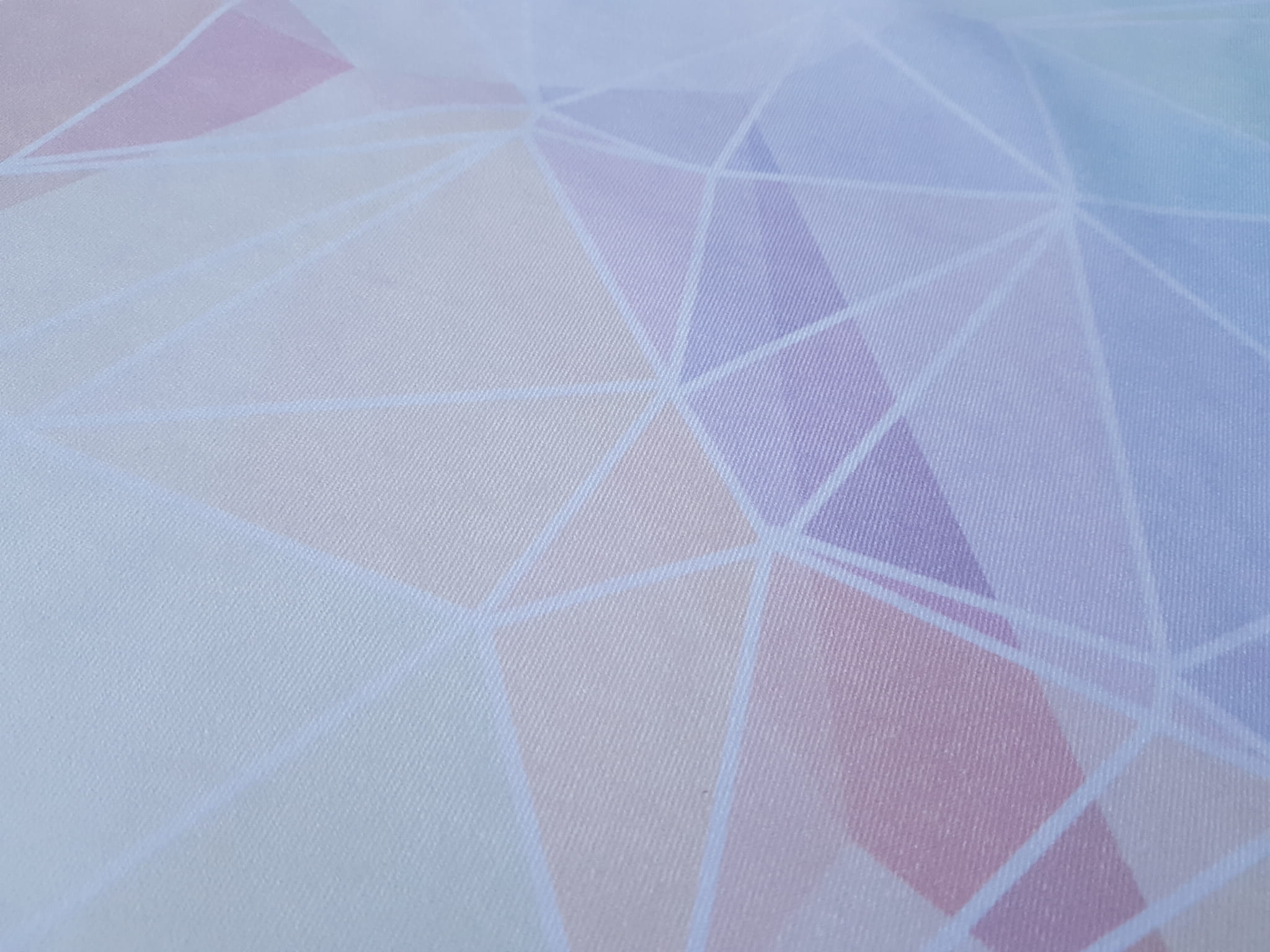 Tkanina tapicerska welur drukowany z nowoczesnym wzorem geometrycznych trójkątów w kolorach tęczy, na tkaninie występują trójkąty zarówno w intensywnych, jak i bardziej pastelowych barwach.