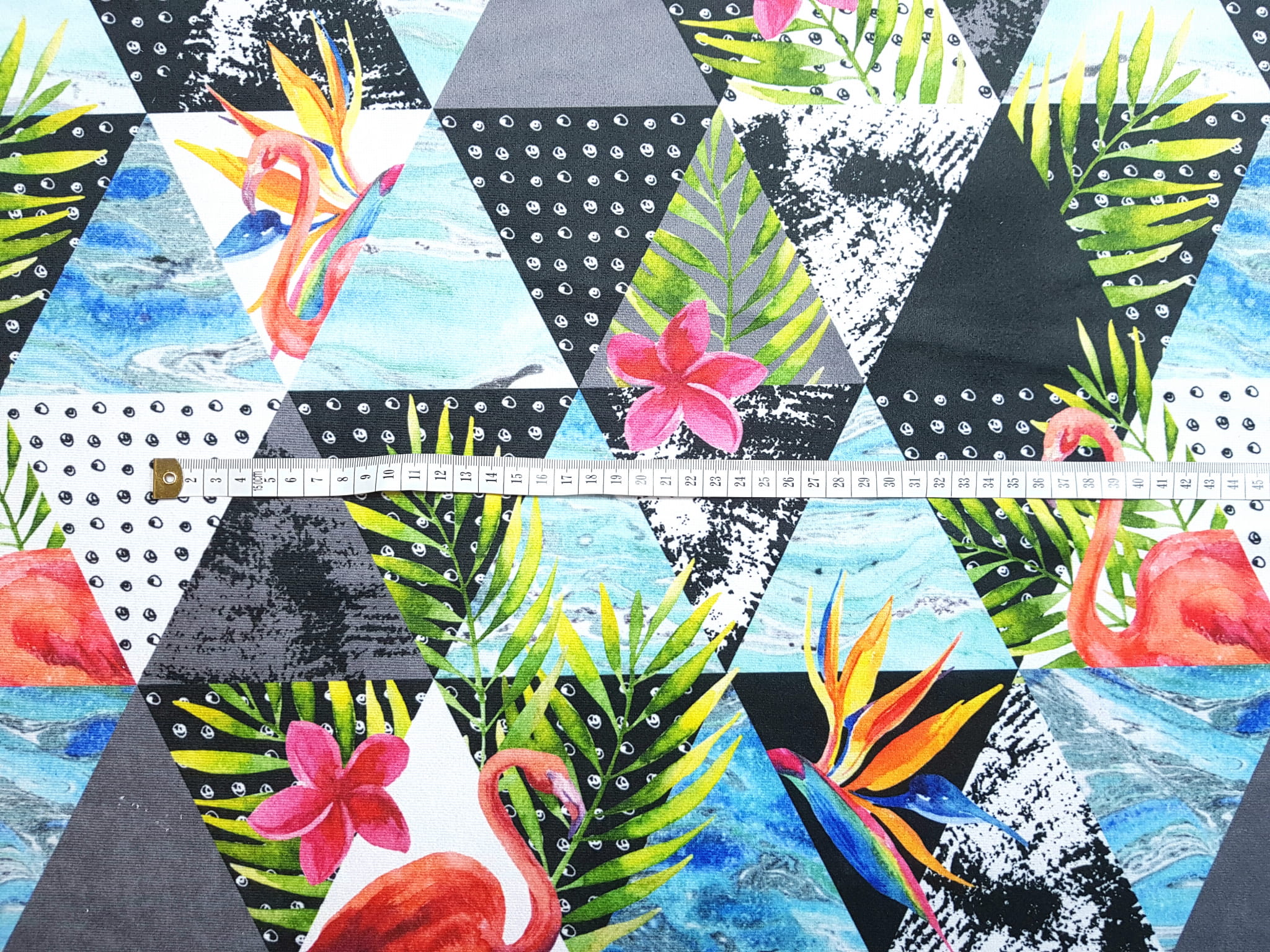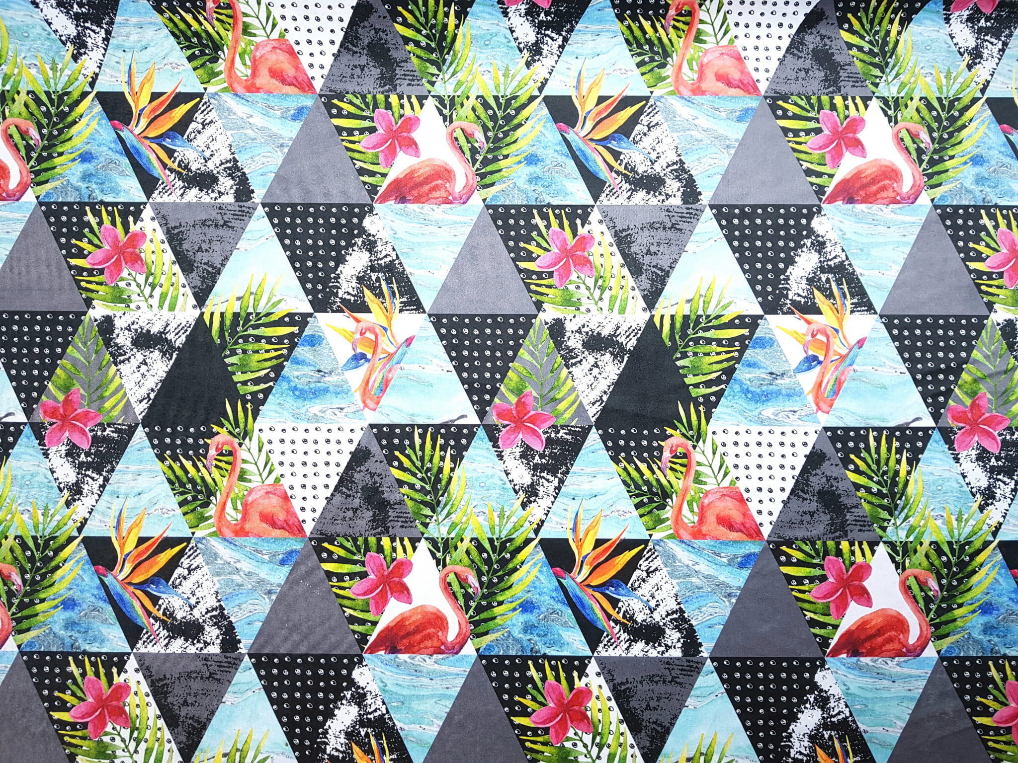 Tkanina tapicerska welur drukowany z bardzo energetycznym wzorem kolorowych trójkątów w otoczeniu różowych flamingów.
