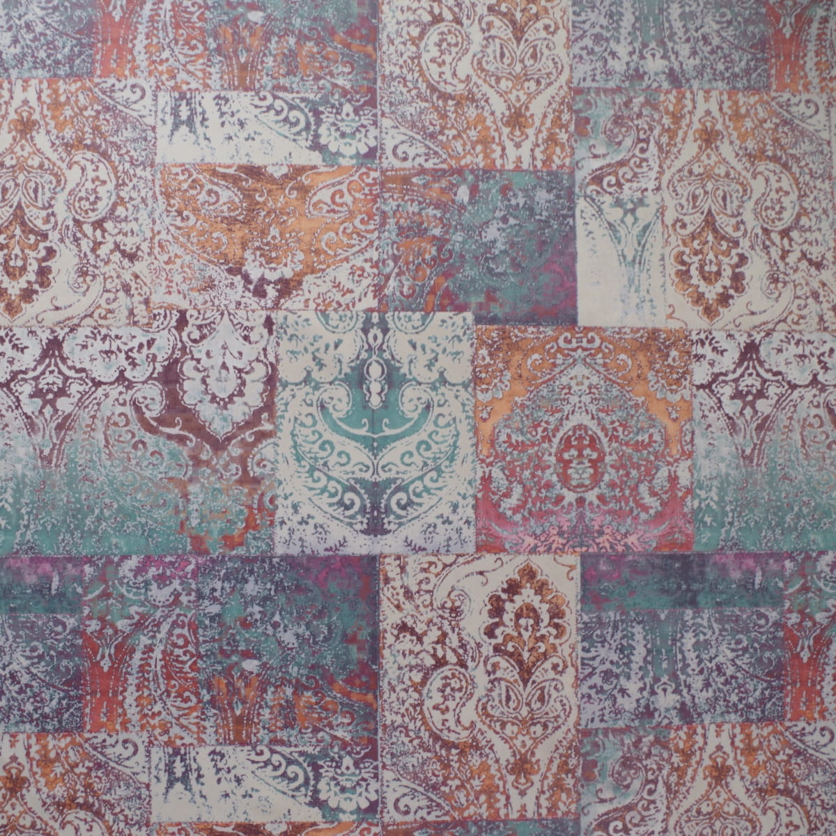 Tkanina tapicerska welur drukowany z nowoczesnym wzorem kolorowych ornamentów w stylu vintage.