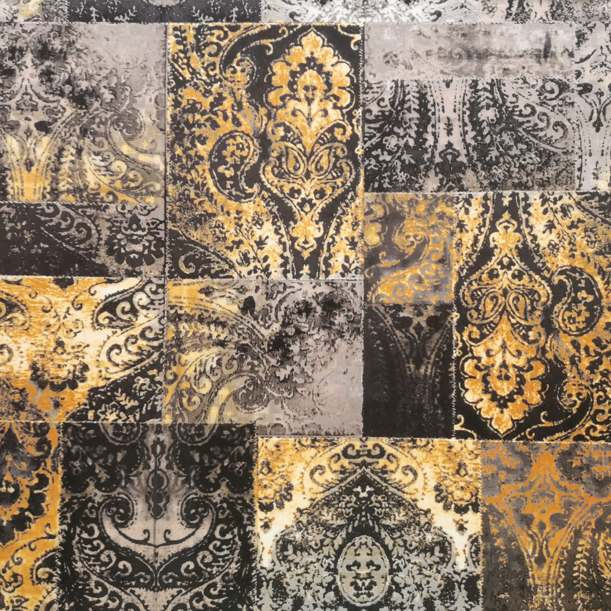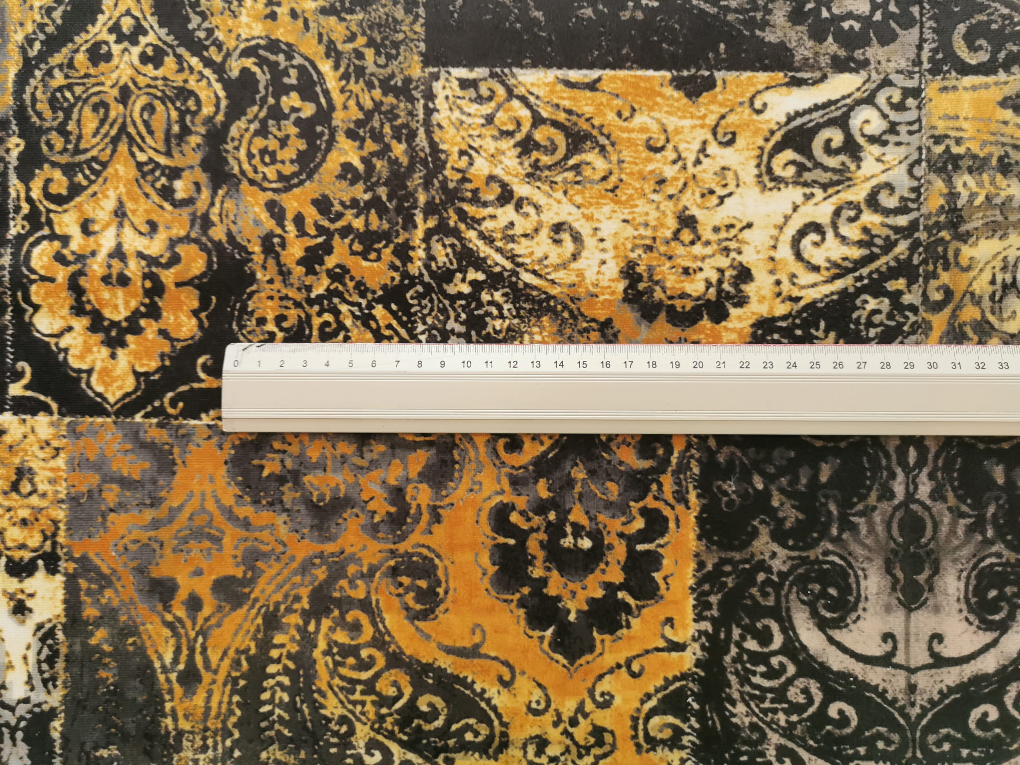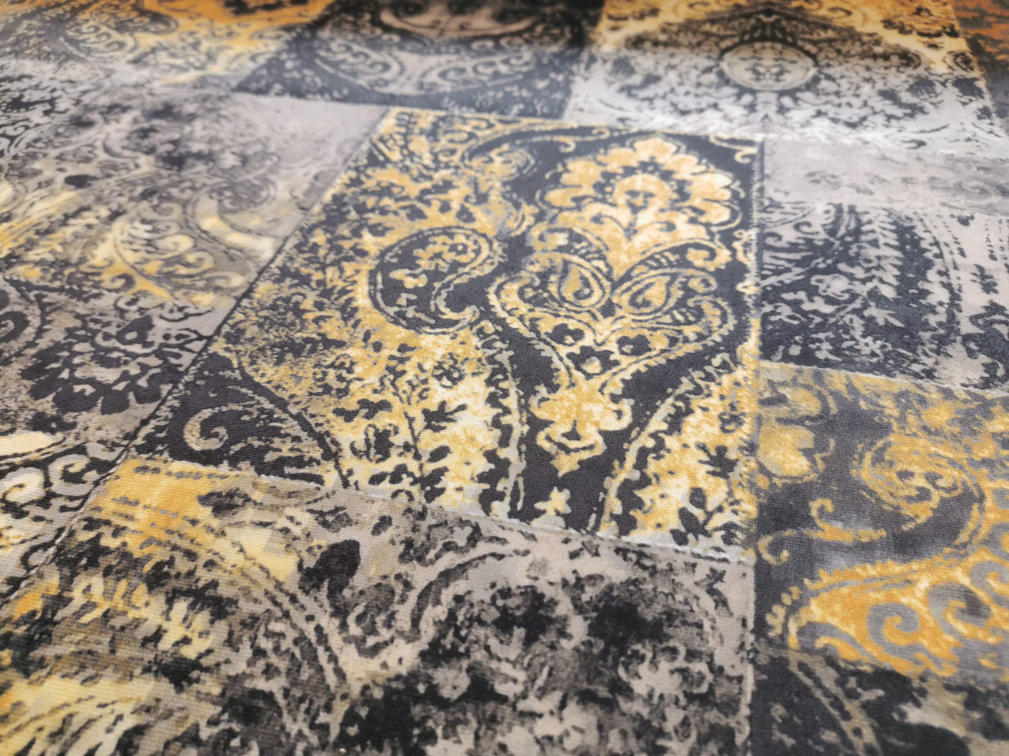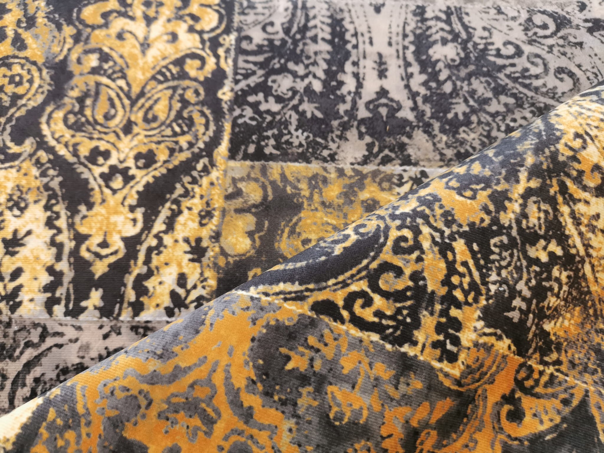 Tkanina tapicerska welur drukowany z nowoczesnym wzorem kolorowych ornamentów w stylu vintage.