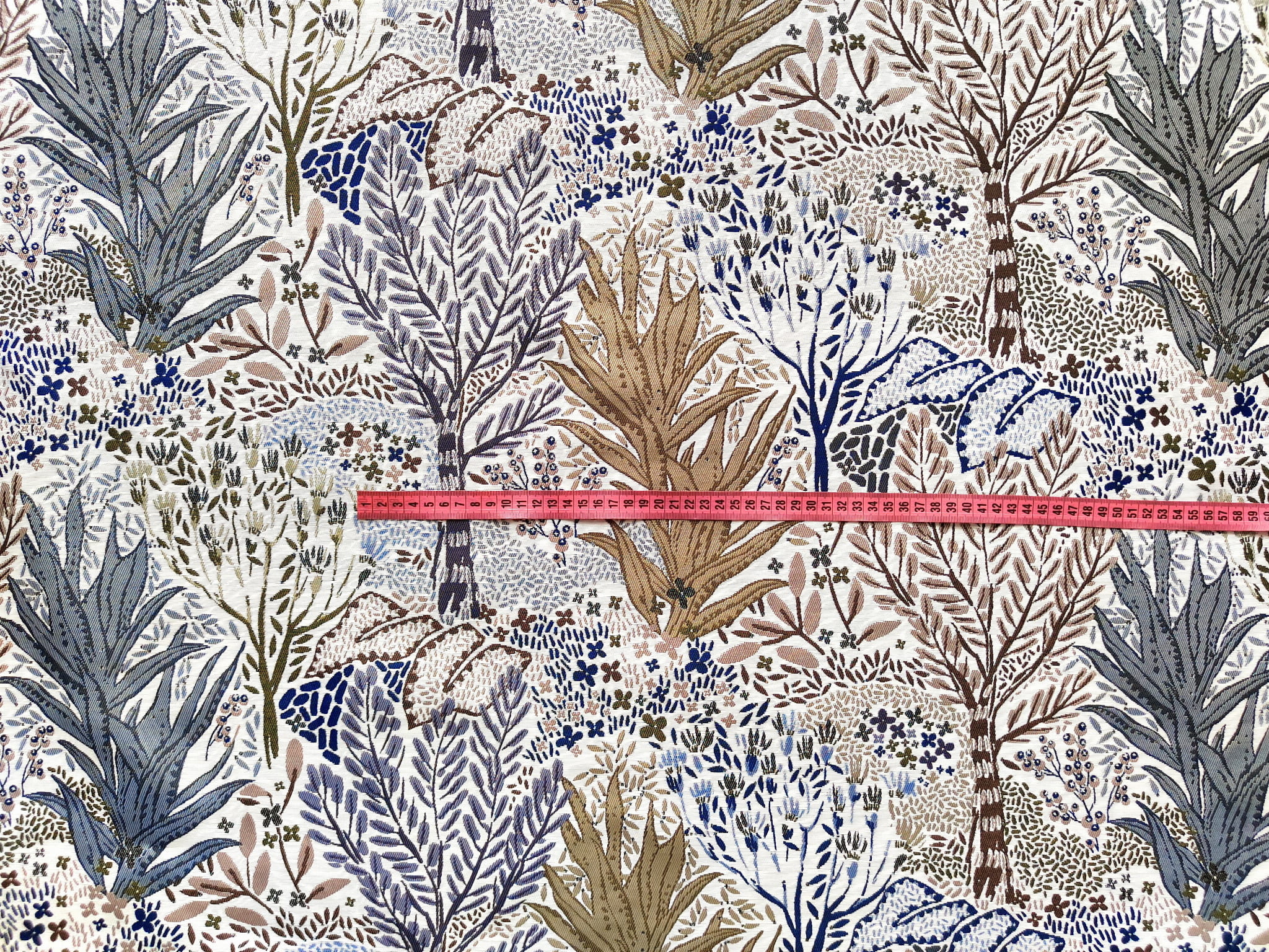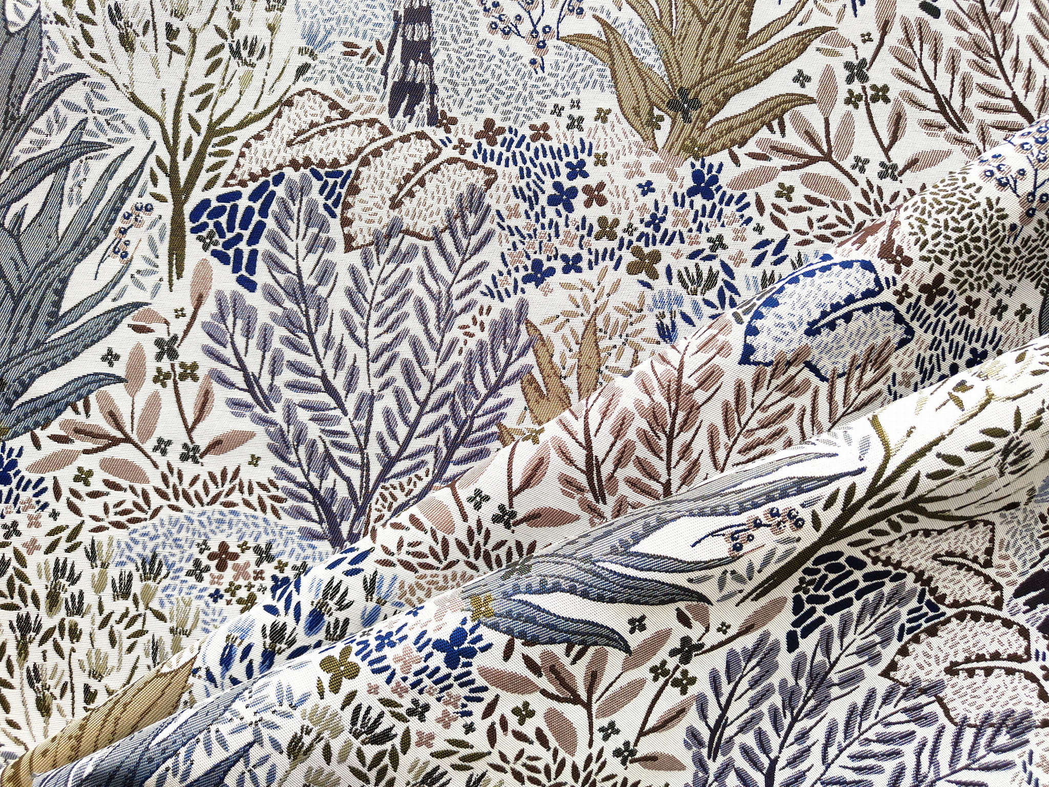Unikatowa tkanina żakardowa w niespotykany wzór egzotycznych drzew, liści i krzewów w stonowanych barwach szarości, beży i bieli. Przełamanie stanowi dodatek akcentu niebieskiego i granatowego.