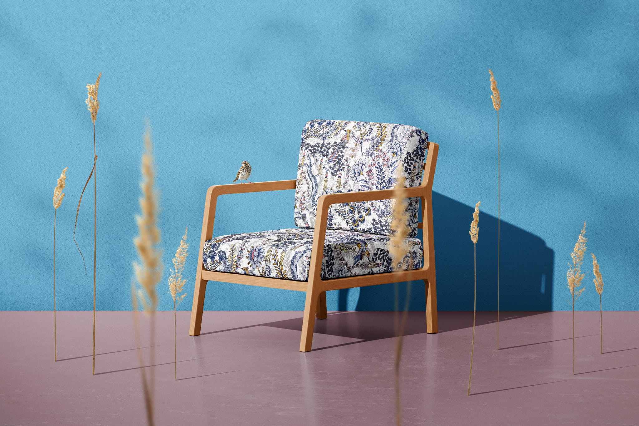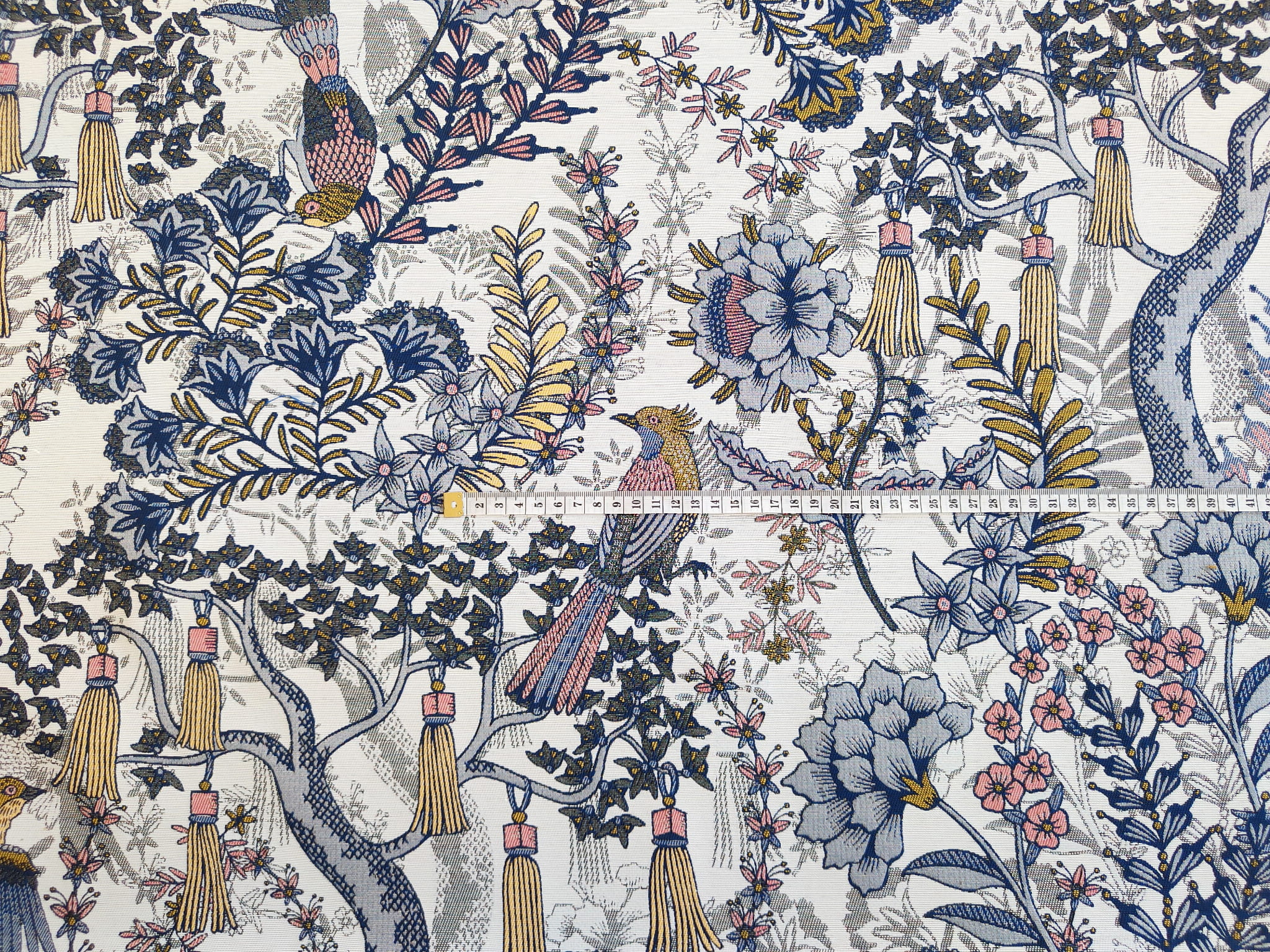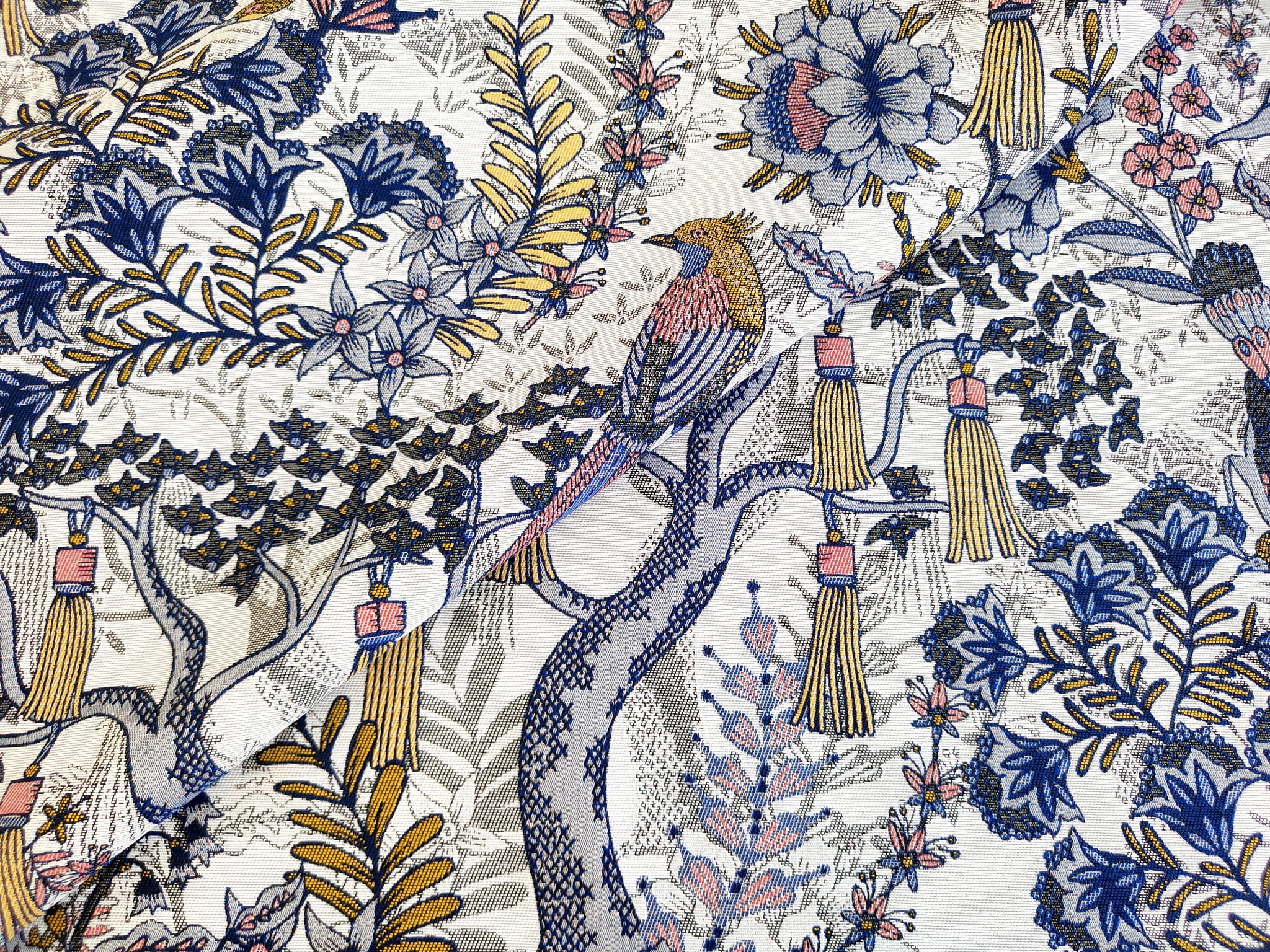 Unikatowa tkanina żakardowa w niespotykany wzór egzotycznych drzew, liści i ptaków w stonowanych barwach szarości, granatu i bieli. Przełamanie stanowi dodatek akcentu pastelowego różu i żółtego.