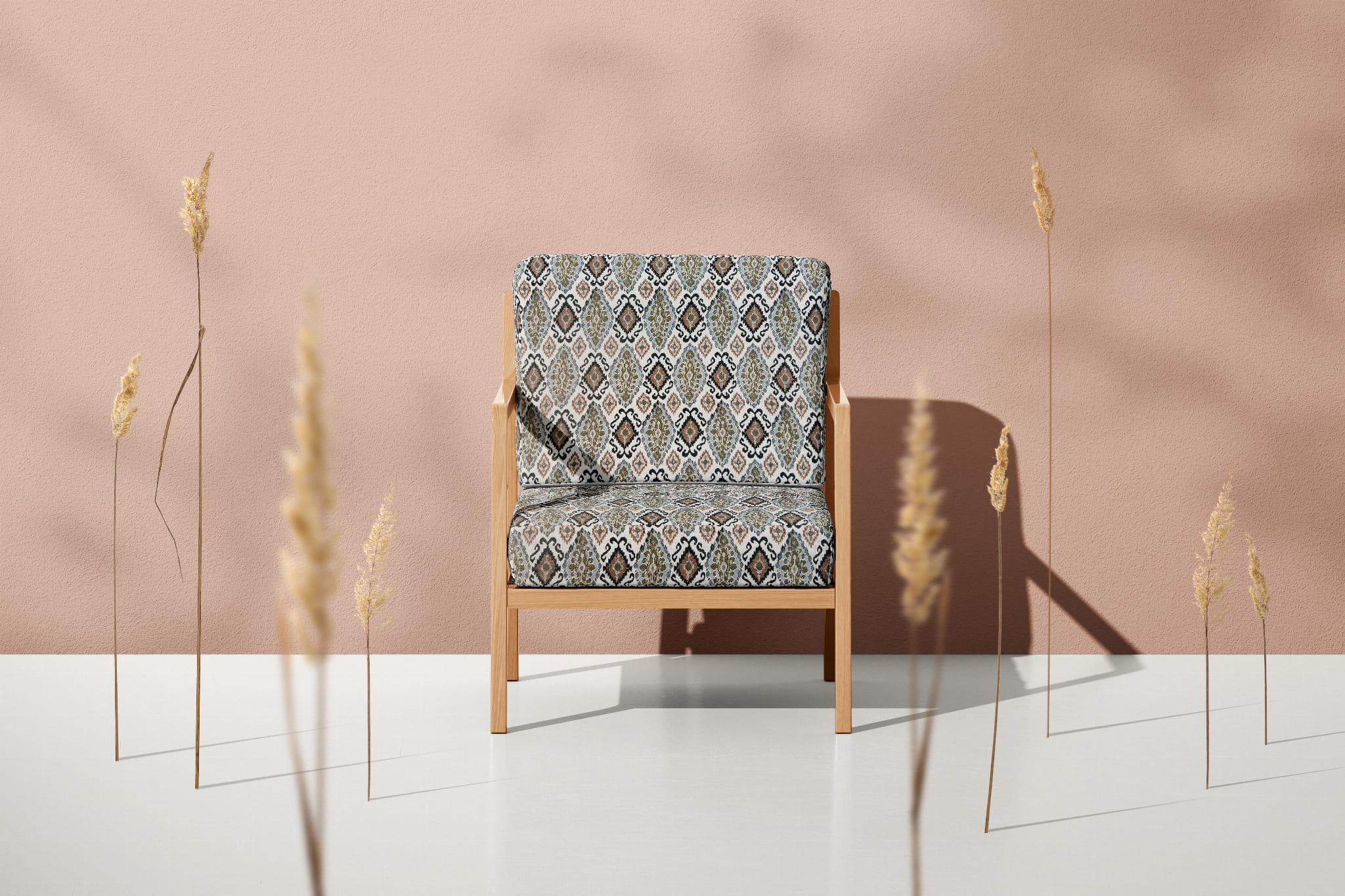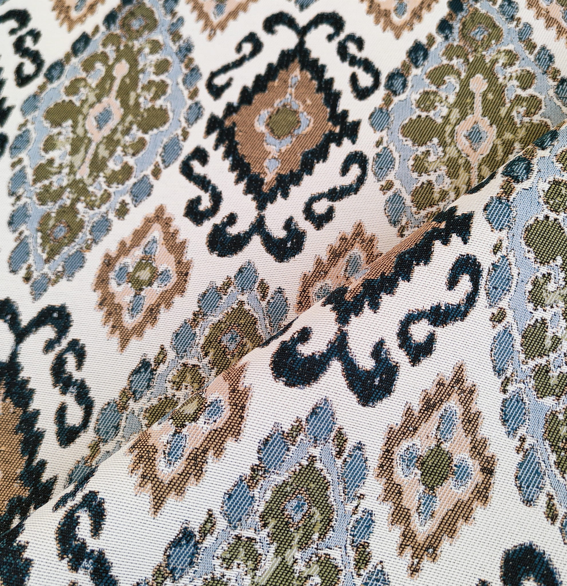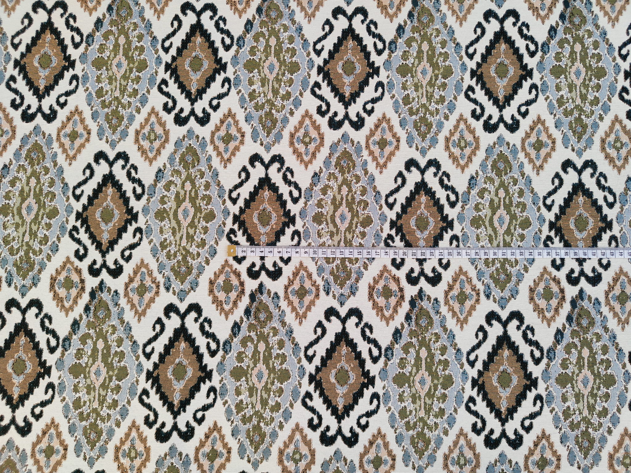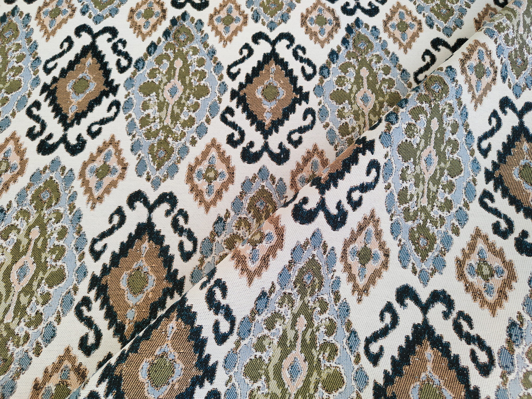 Unikatowa tkanina żakardowa w orientalny wzór ikat, który stanowi klasyczny wzór żakardu.