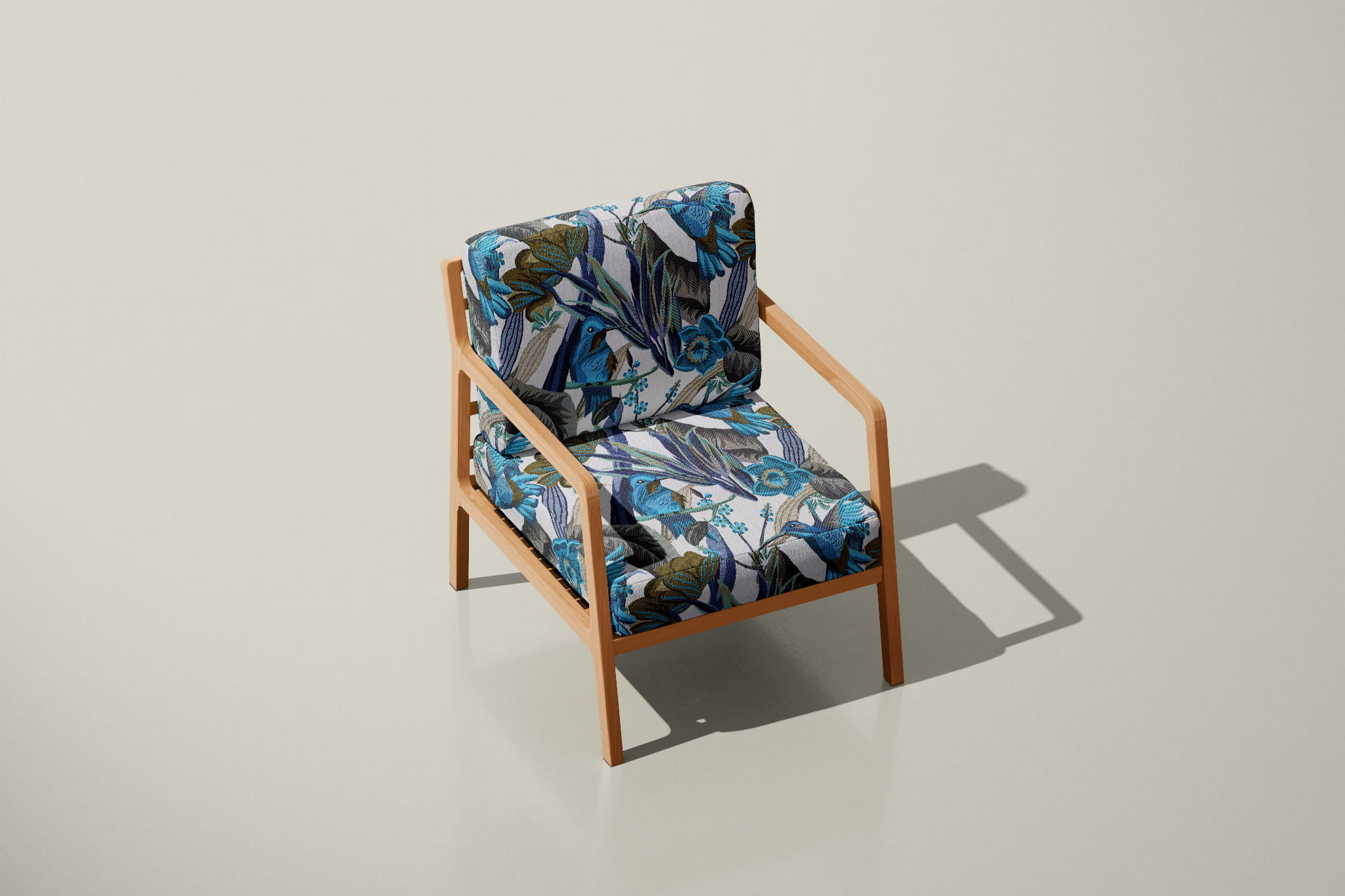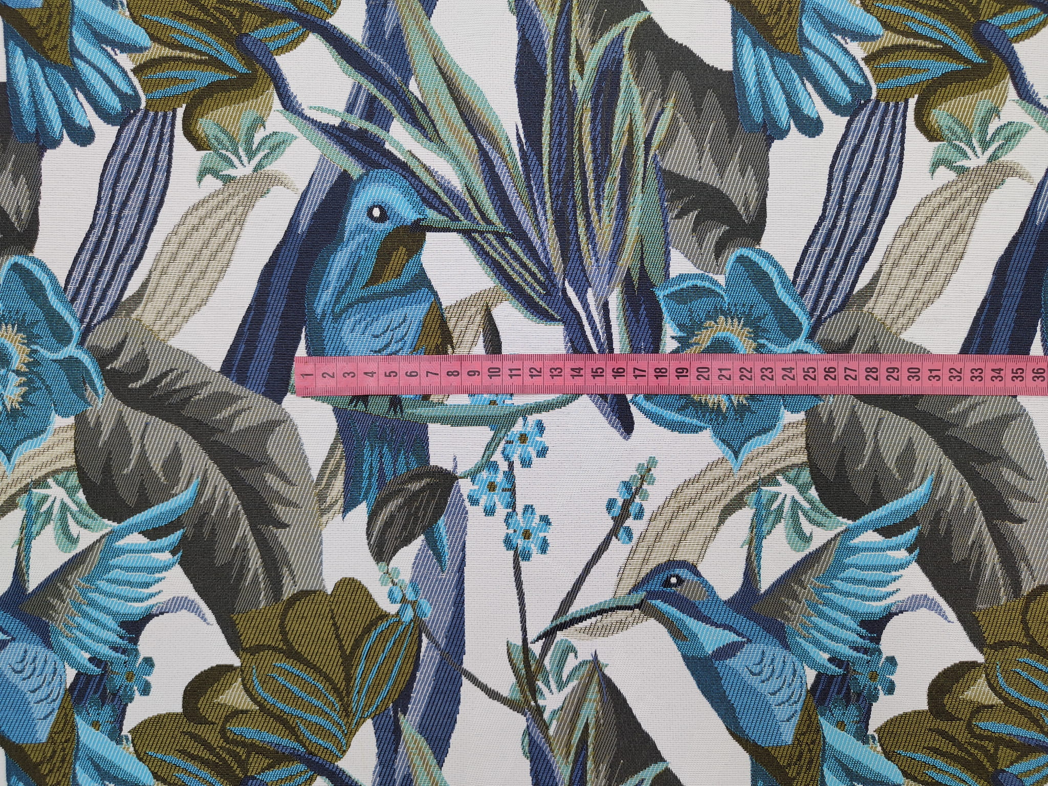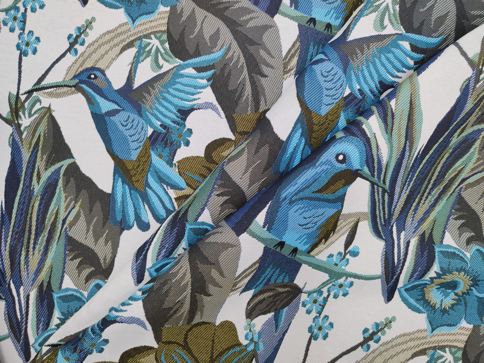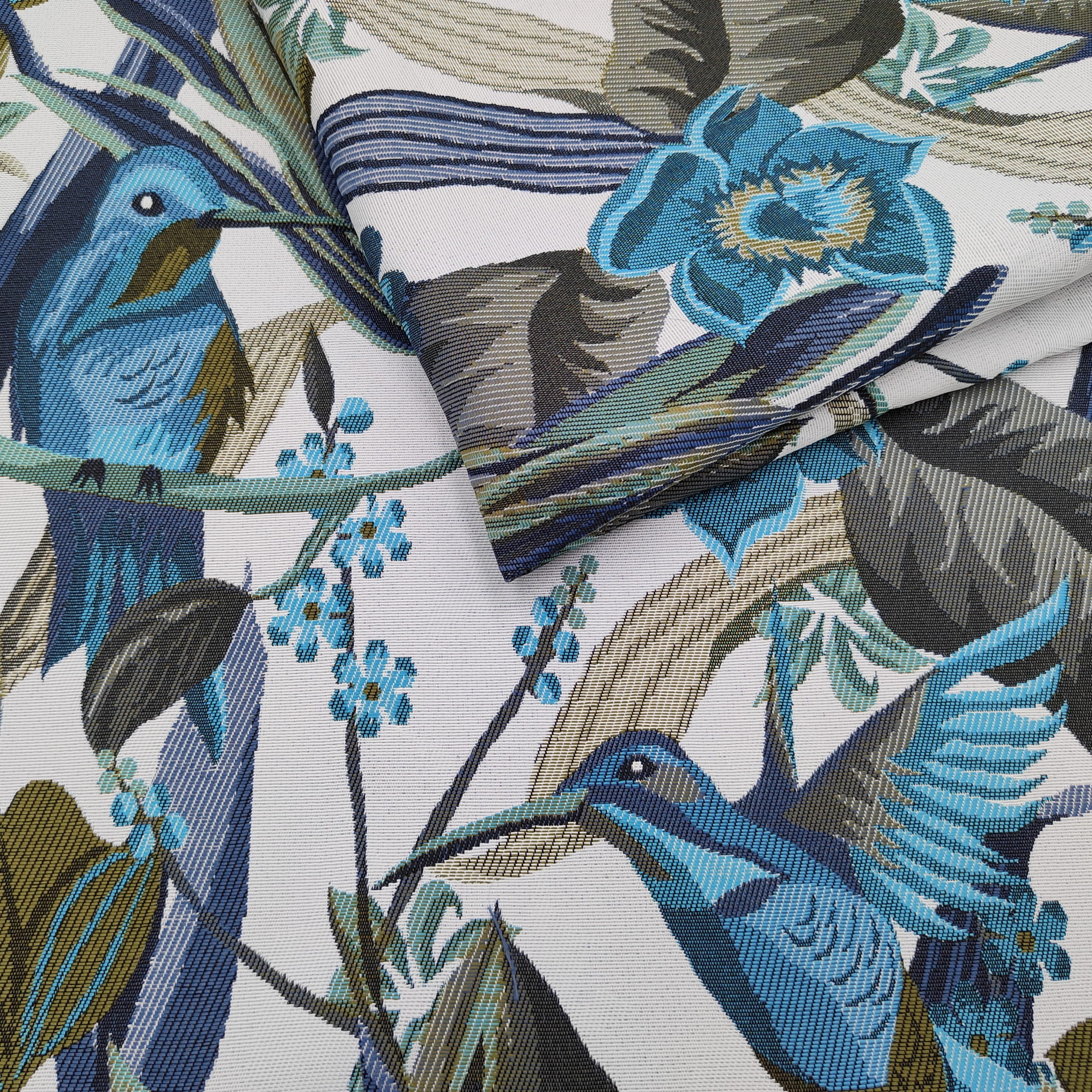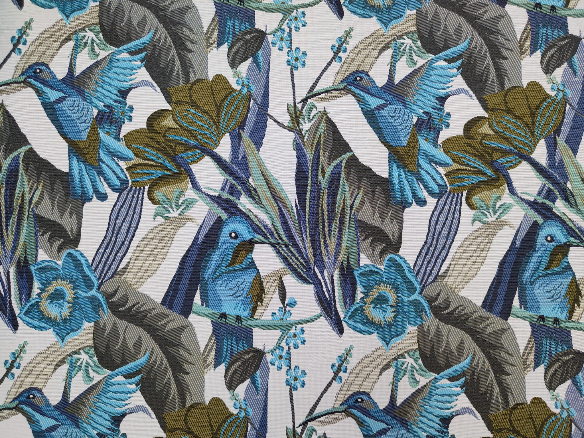 Unikatowa tkanina żakardowa w piękny wzór niebieskich/turkusowych kolibrów w otoczeniu egzotycznych kwiatów.