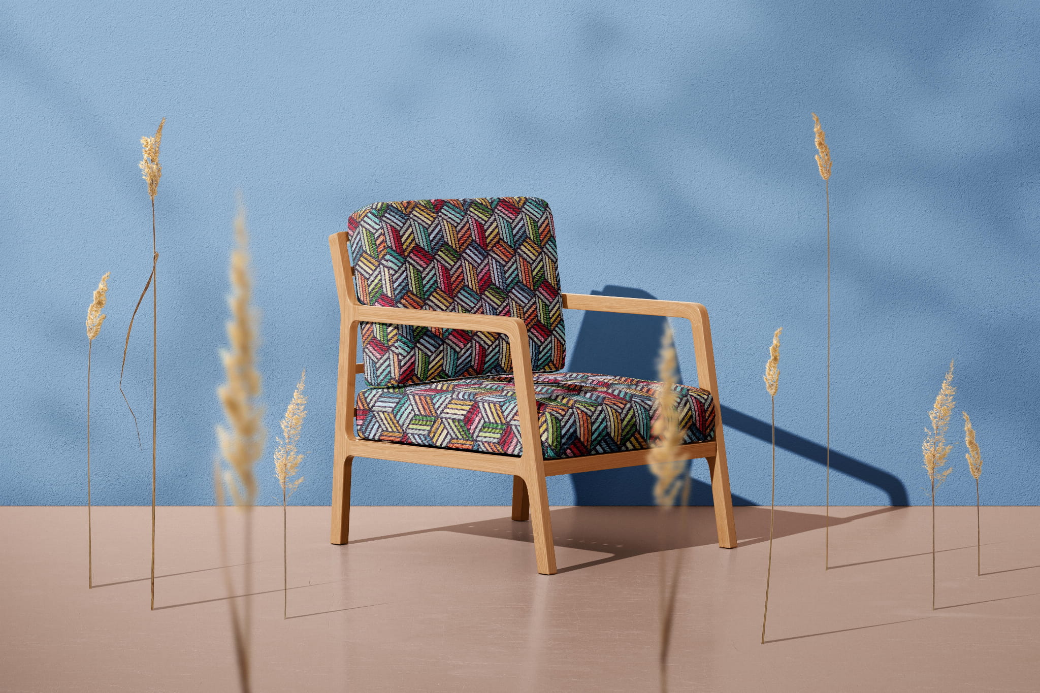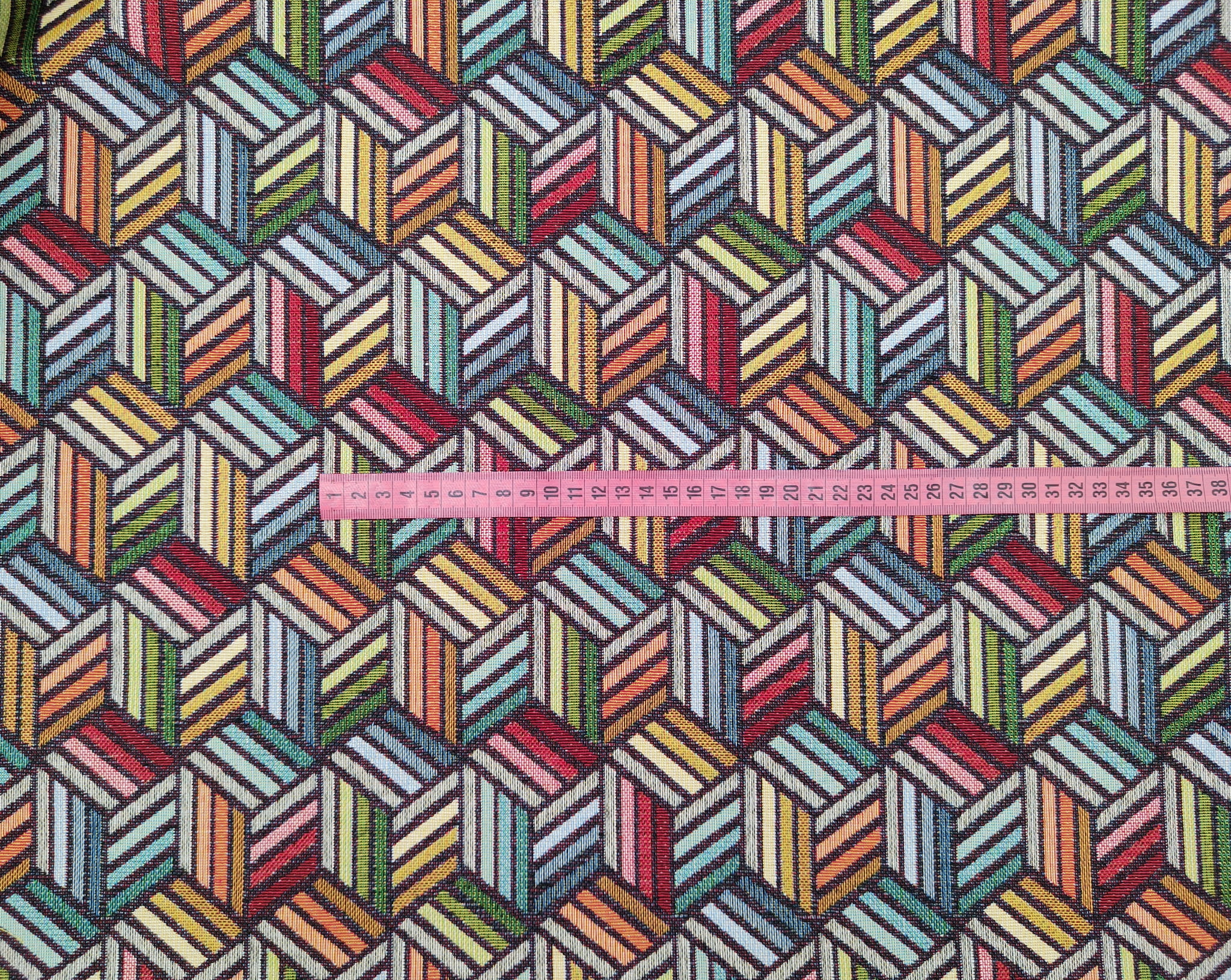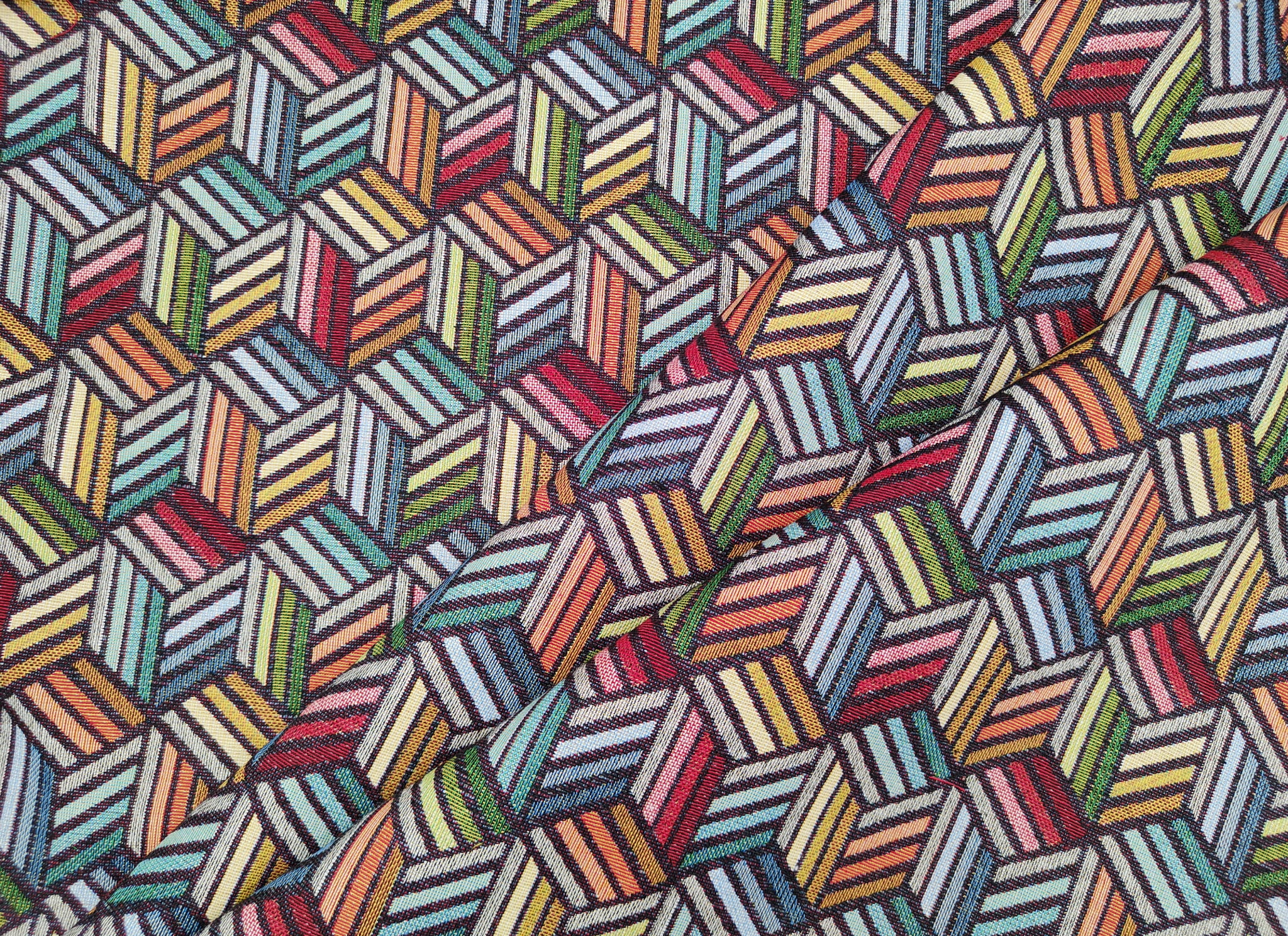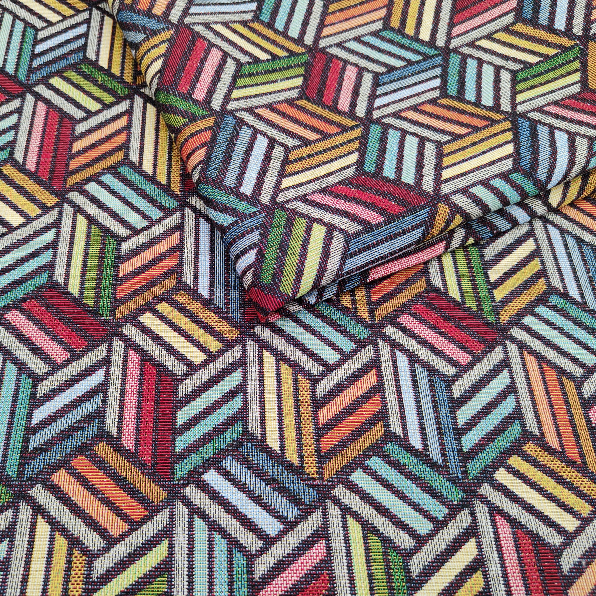 Unikatowa tkanina żakardowa we wzór geometrycznych kostek 3D w intensywnych kolorach.
