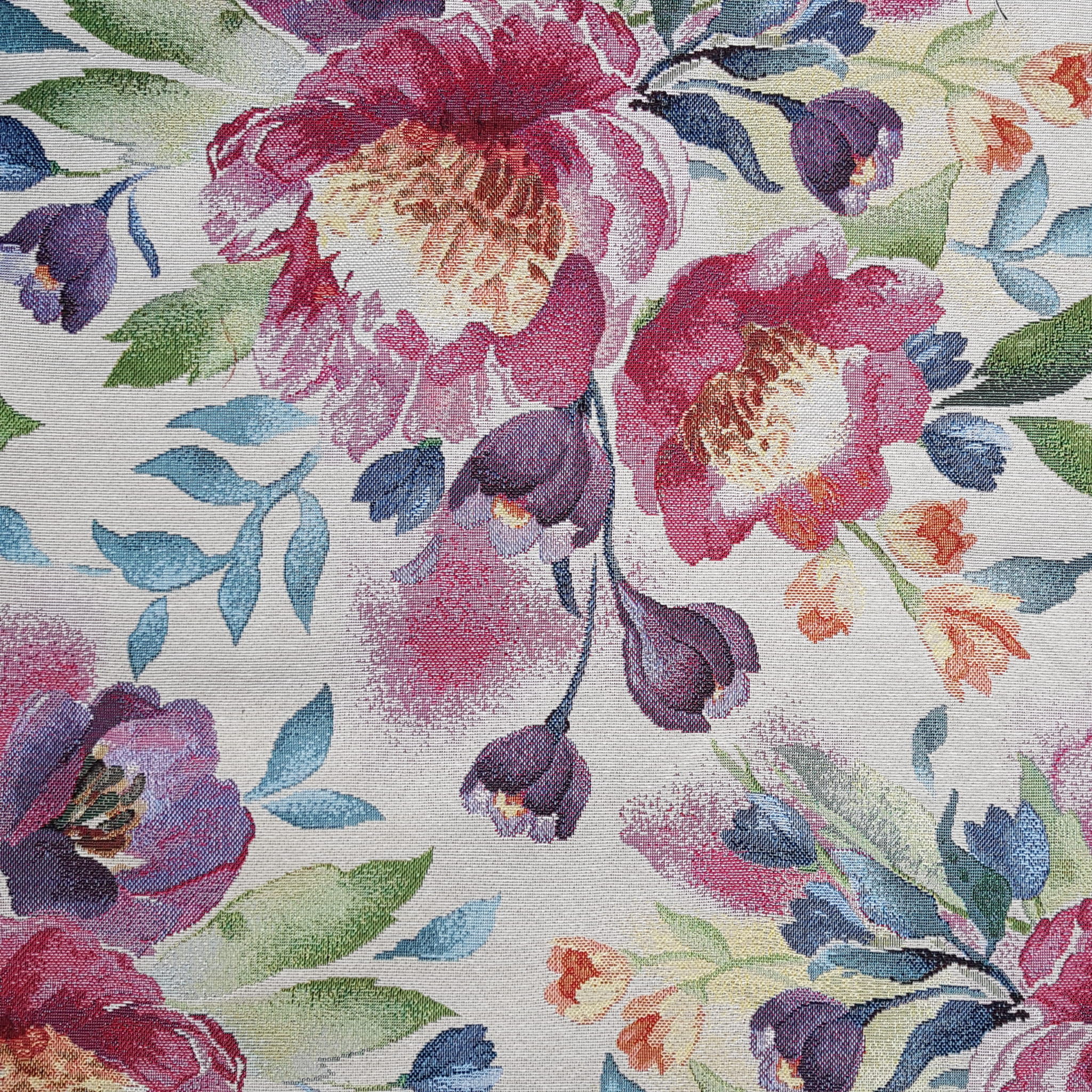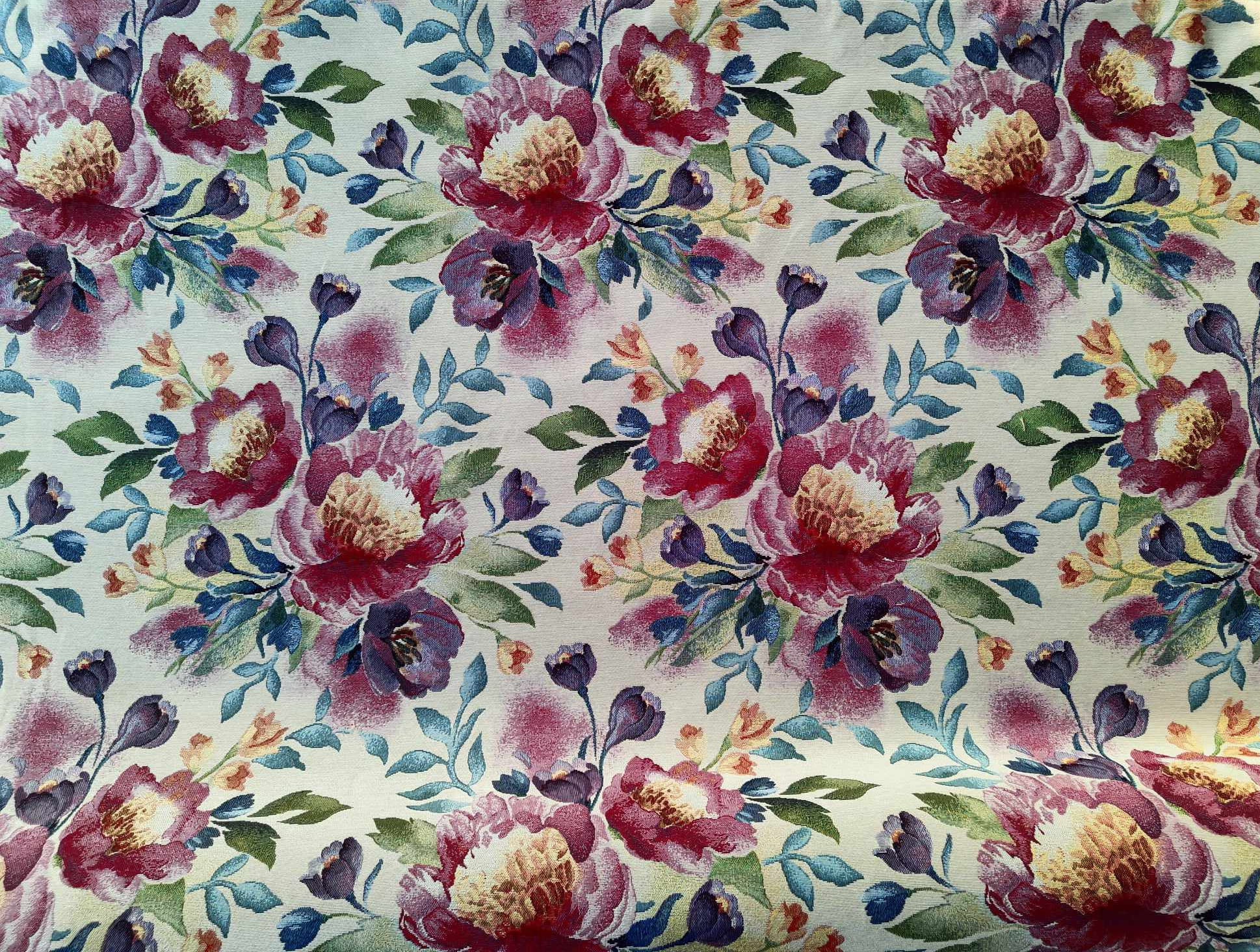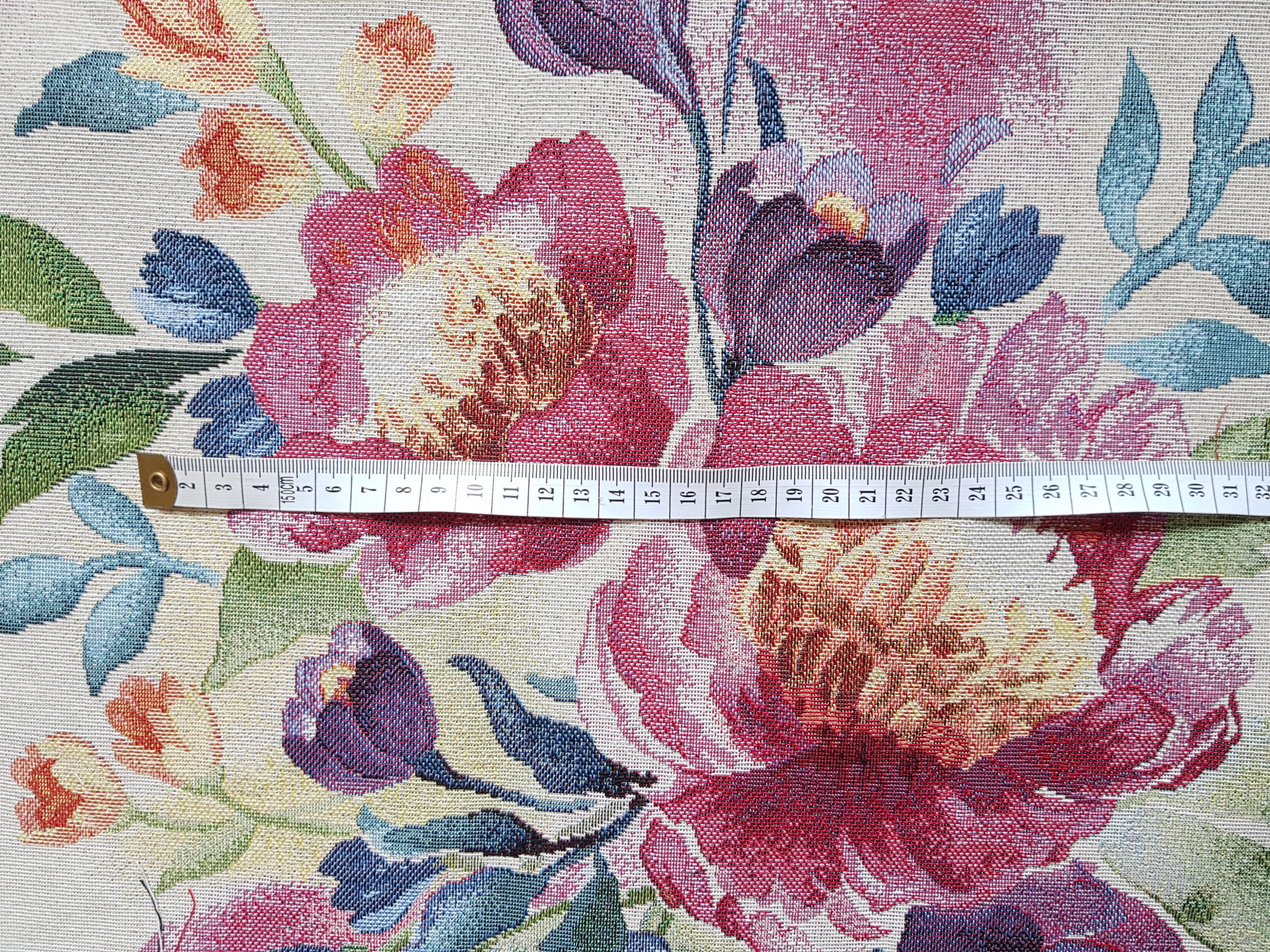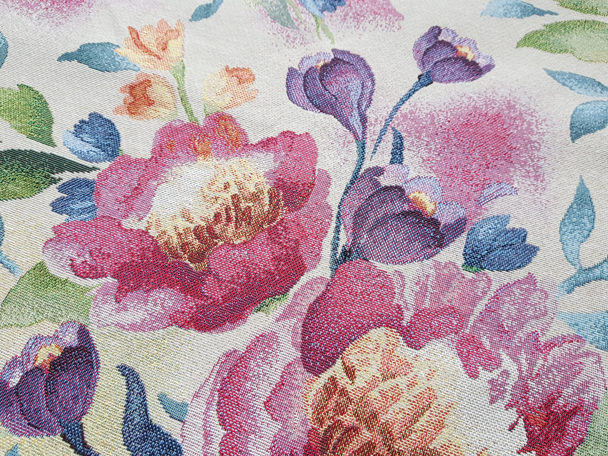 Niezwykła tkanina tapicerska w kolorowe kwiaty na beżowym tle.