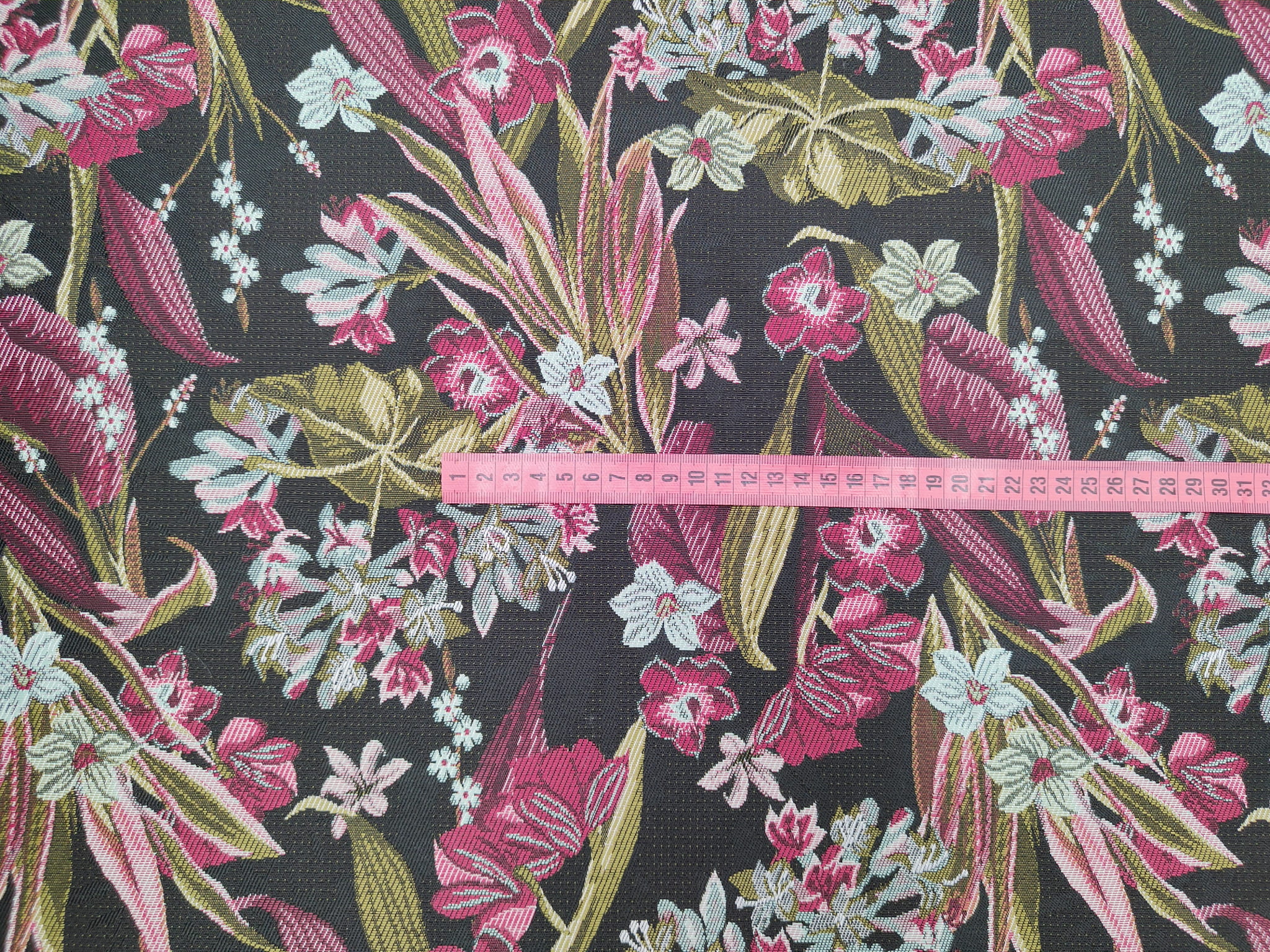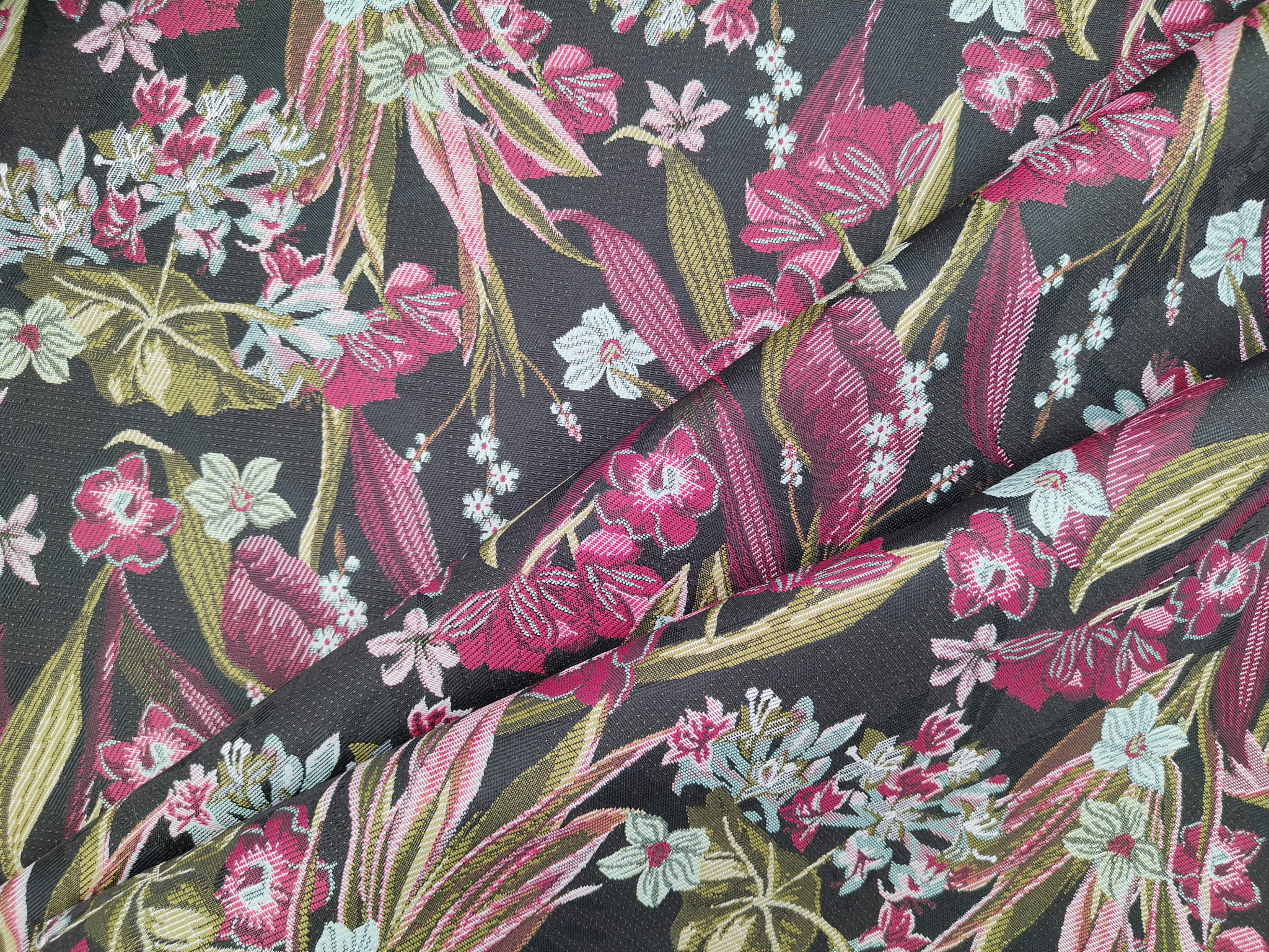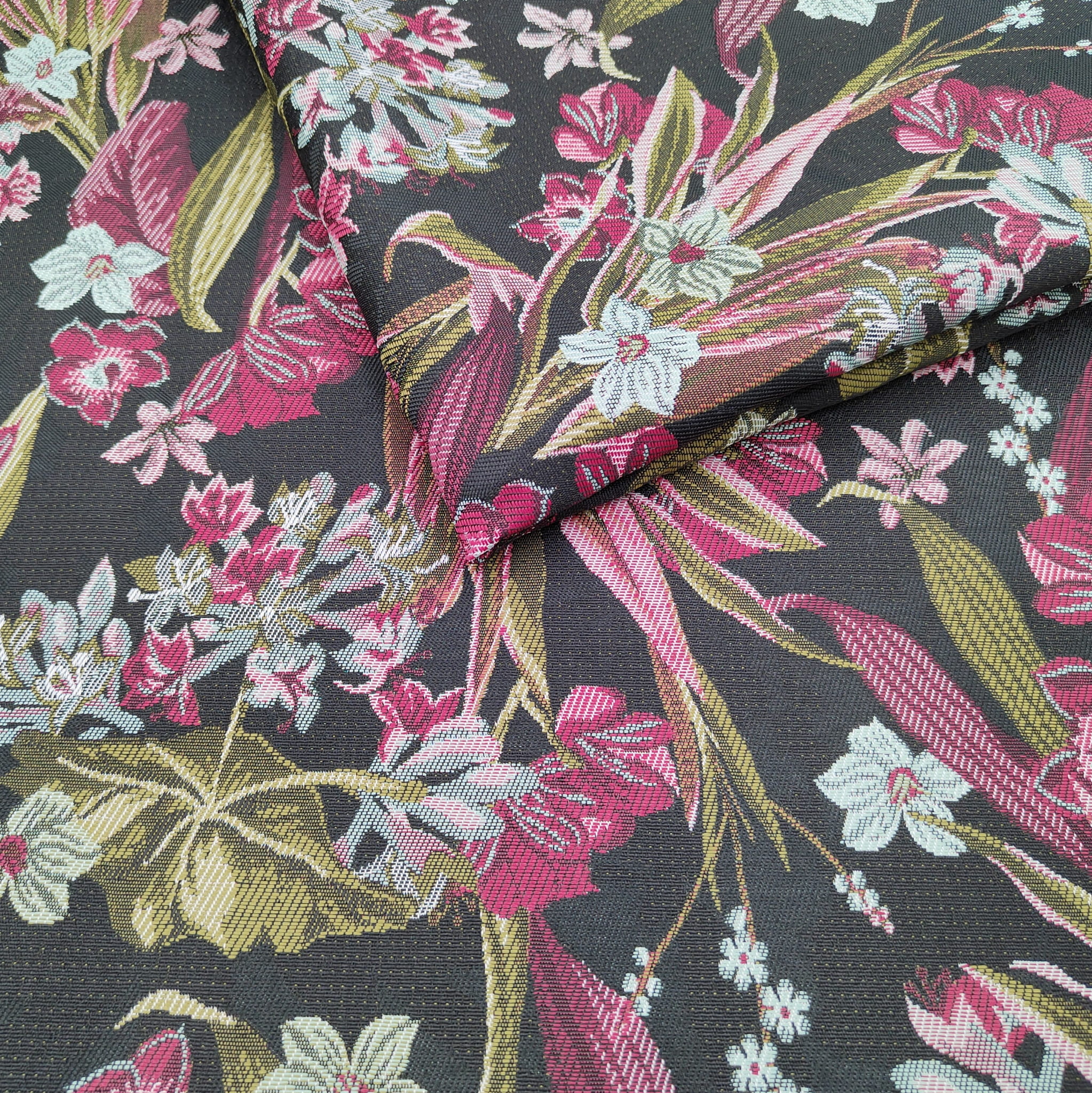 Unikatowa tkanina żakardowa w różowe kwiaty na czarnym tle.