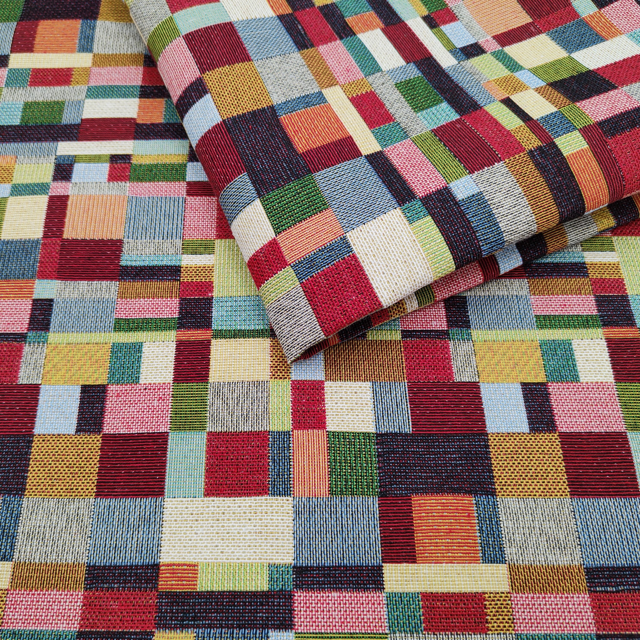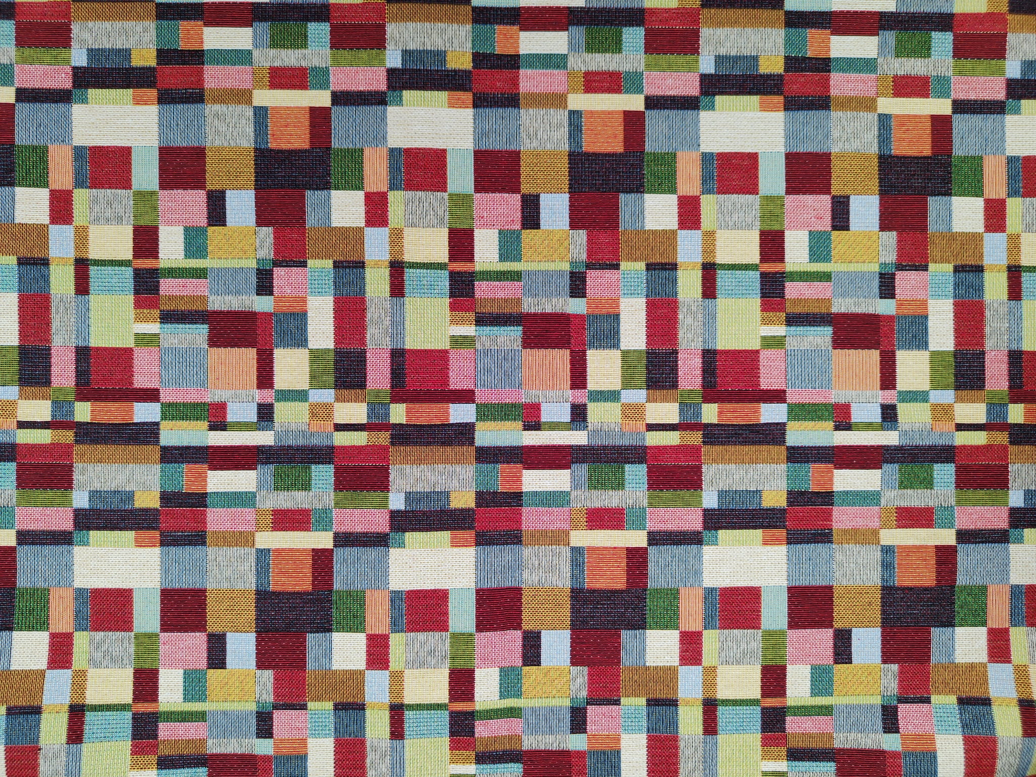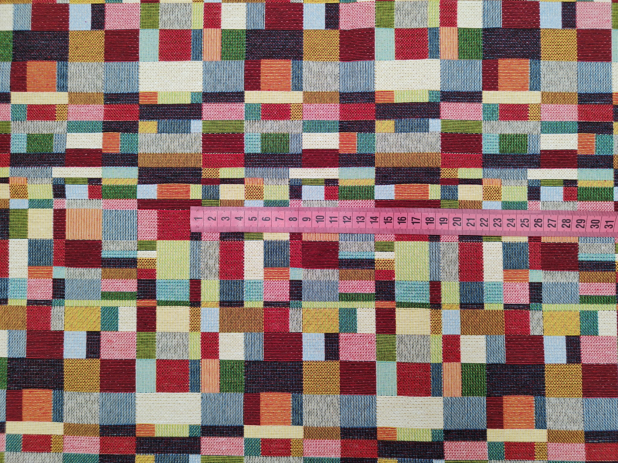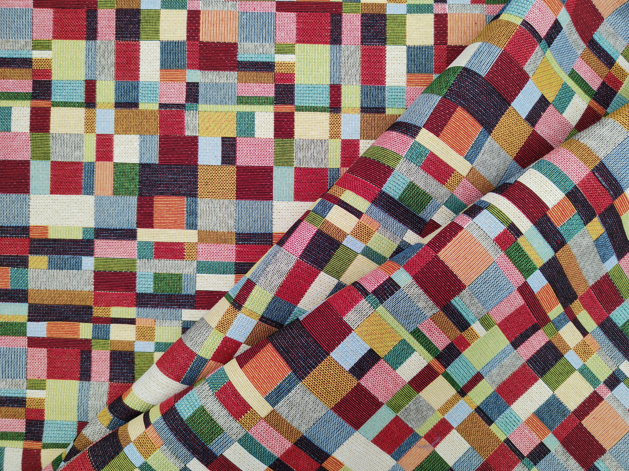 Unikatowa tkanina żakardowa we wzór geometrycznych kolorowych prostokątów.