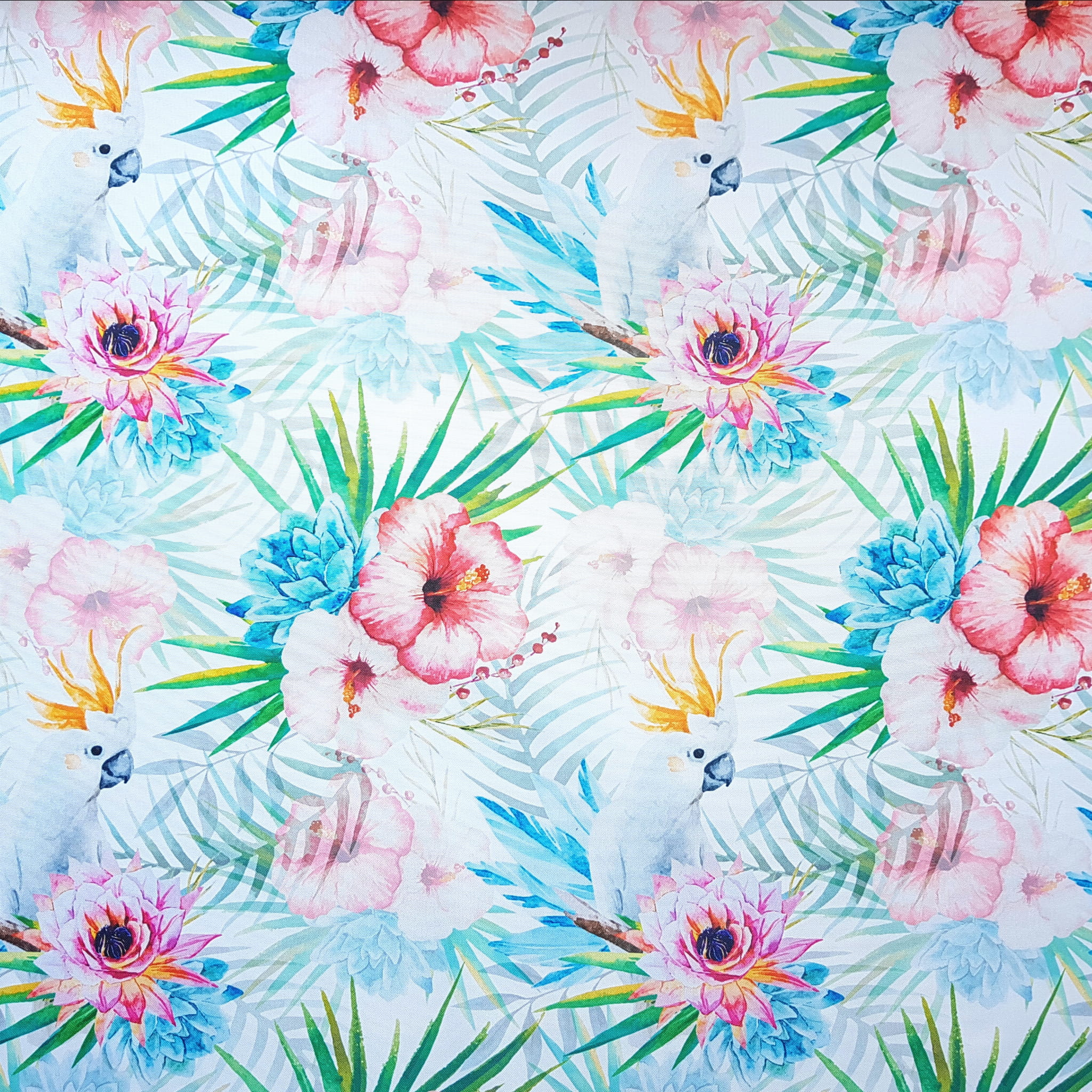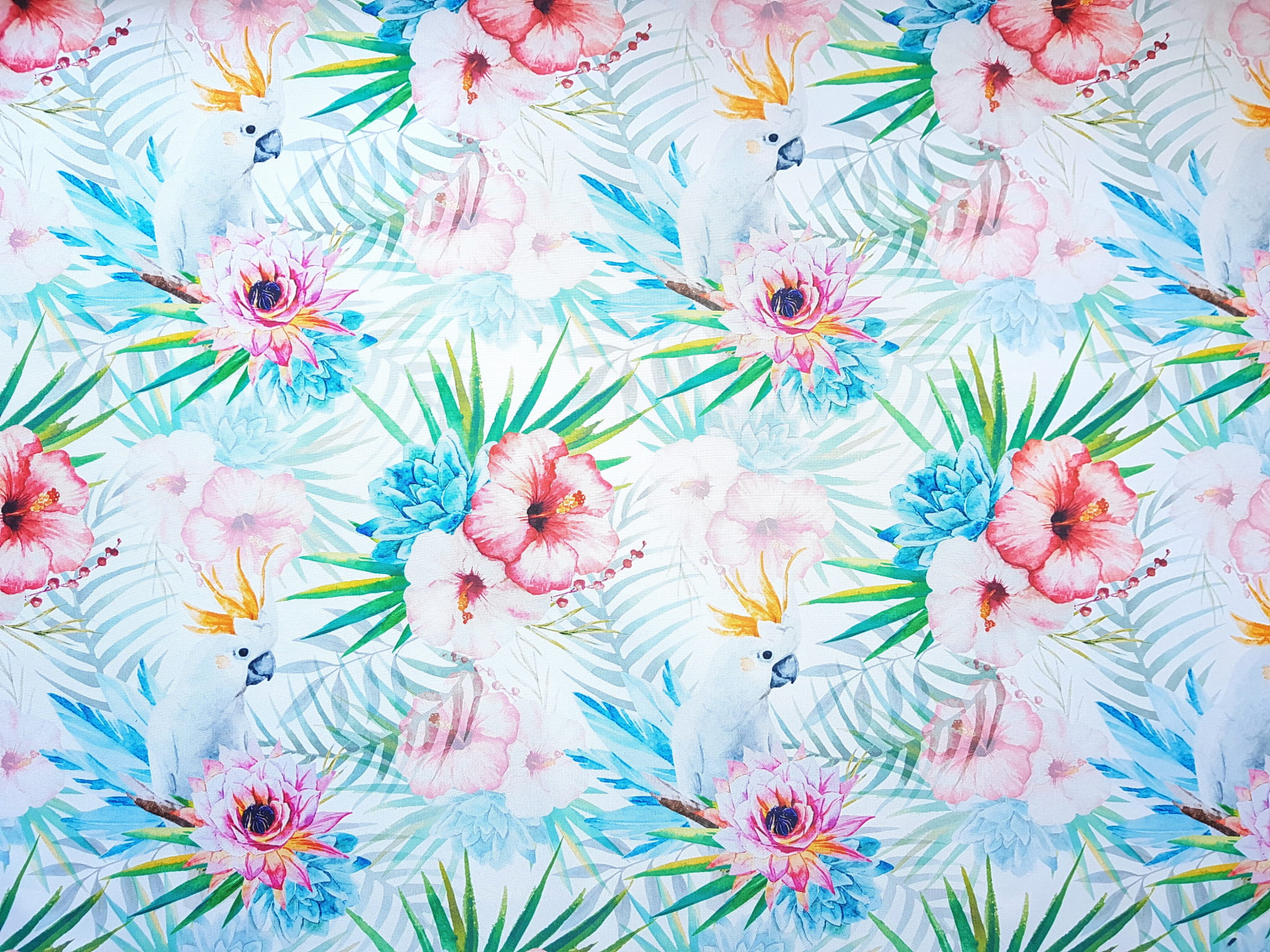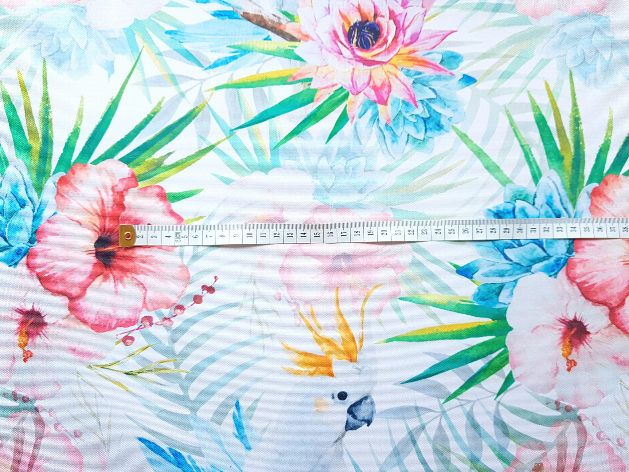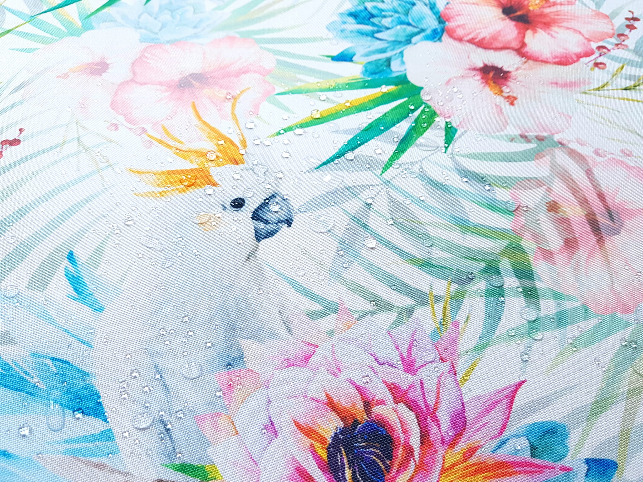 Tkanina wodoodporna z bardzo energetycznym wzorem kolorowych kwiatów w otoczeniu egzotycznych papug.